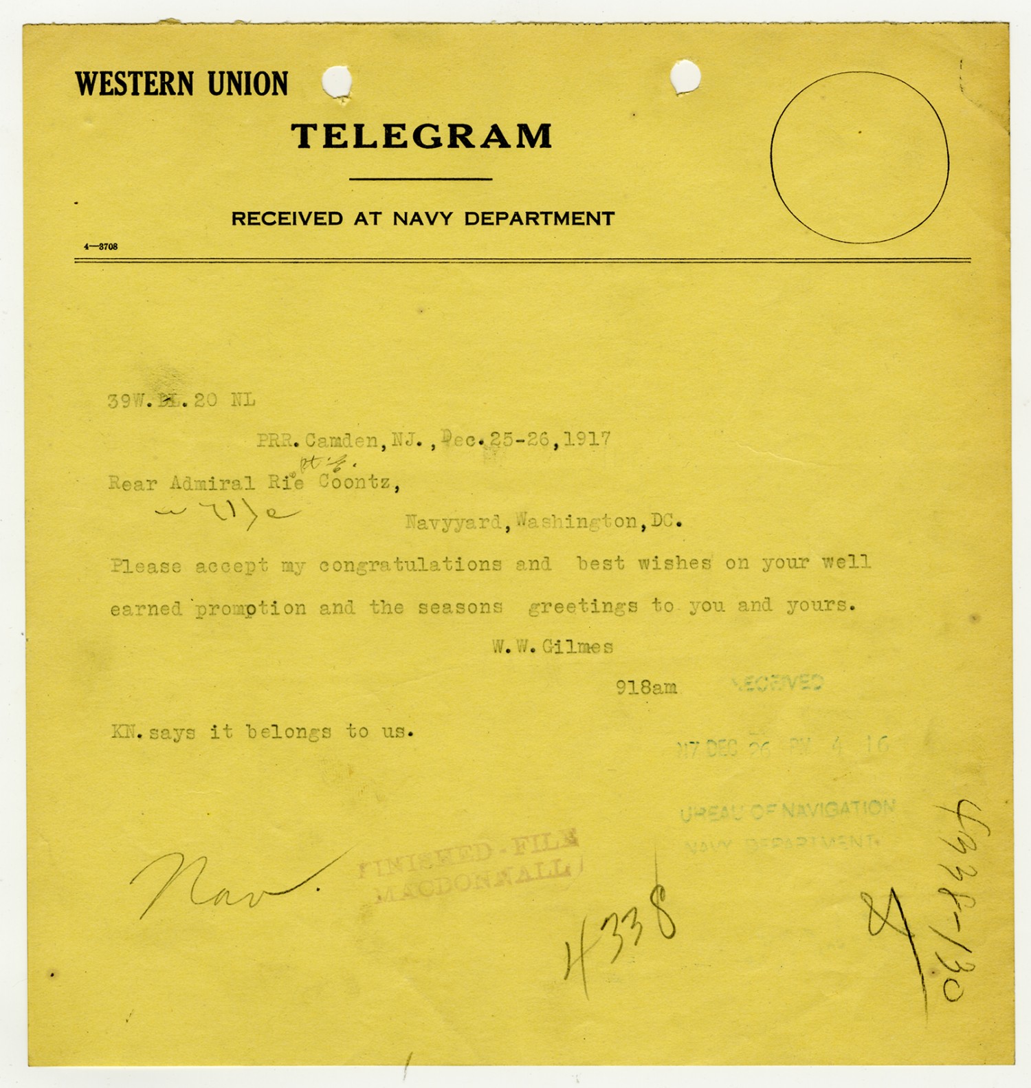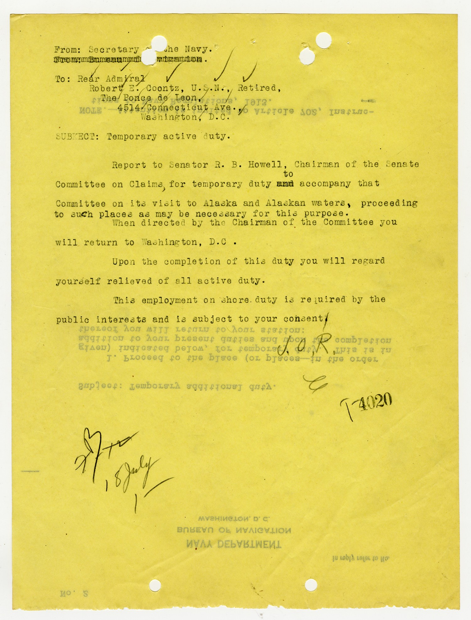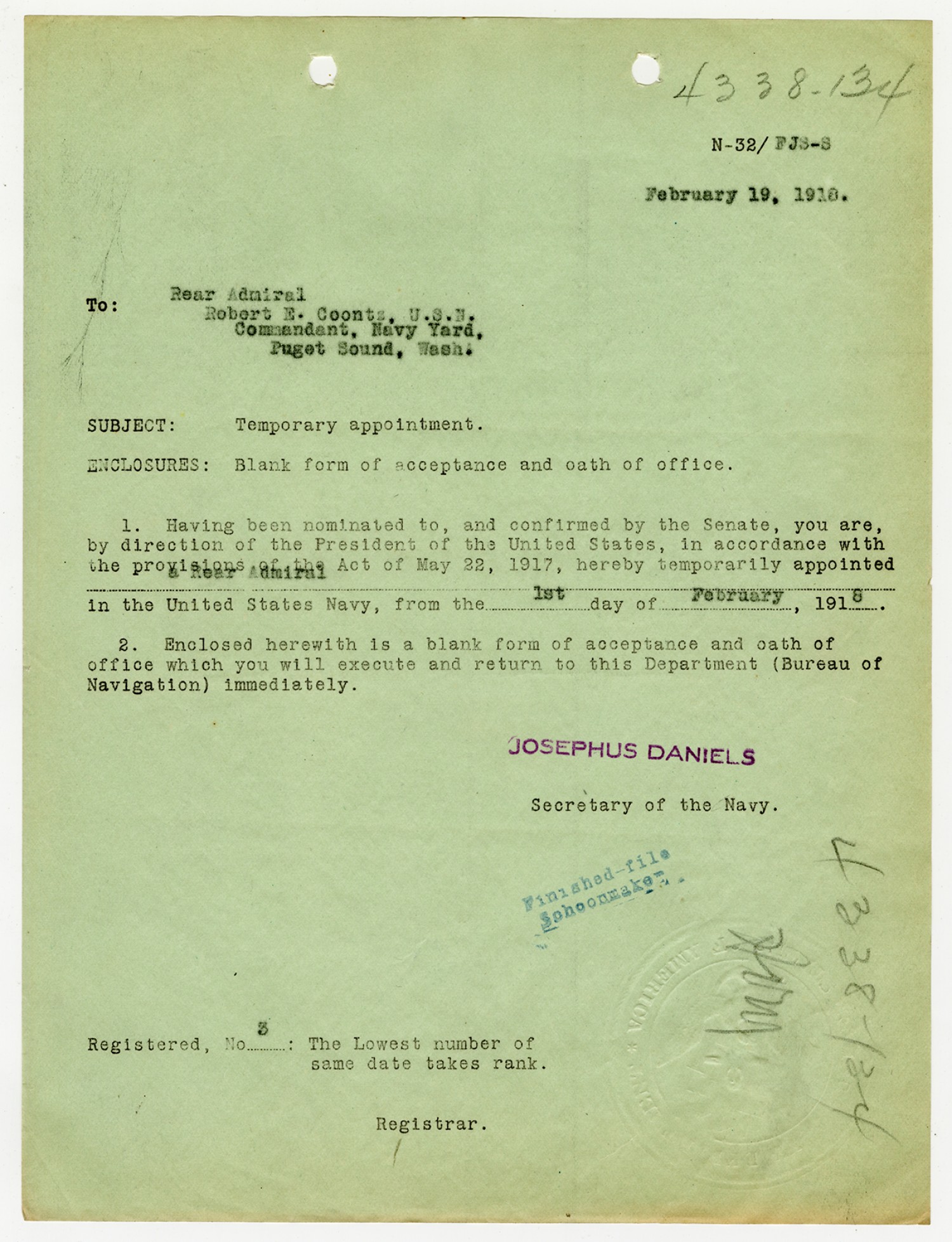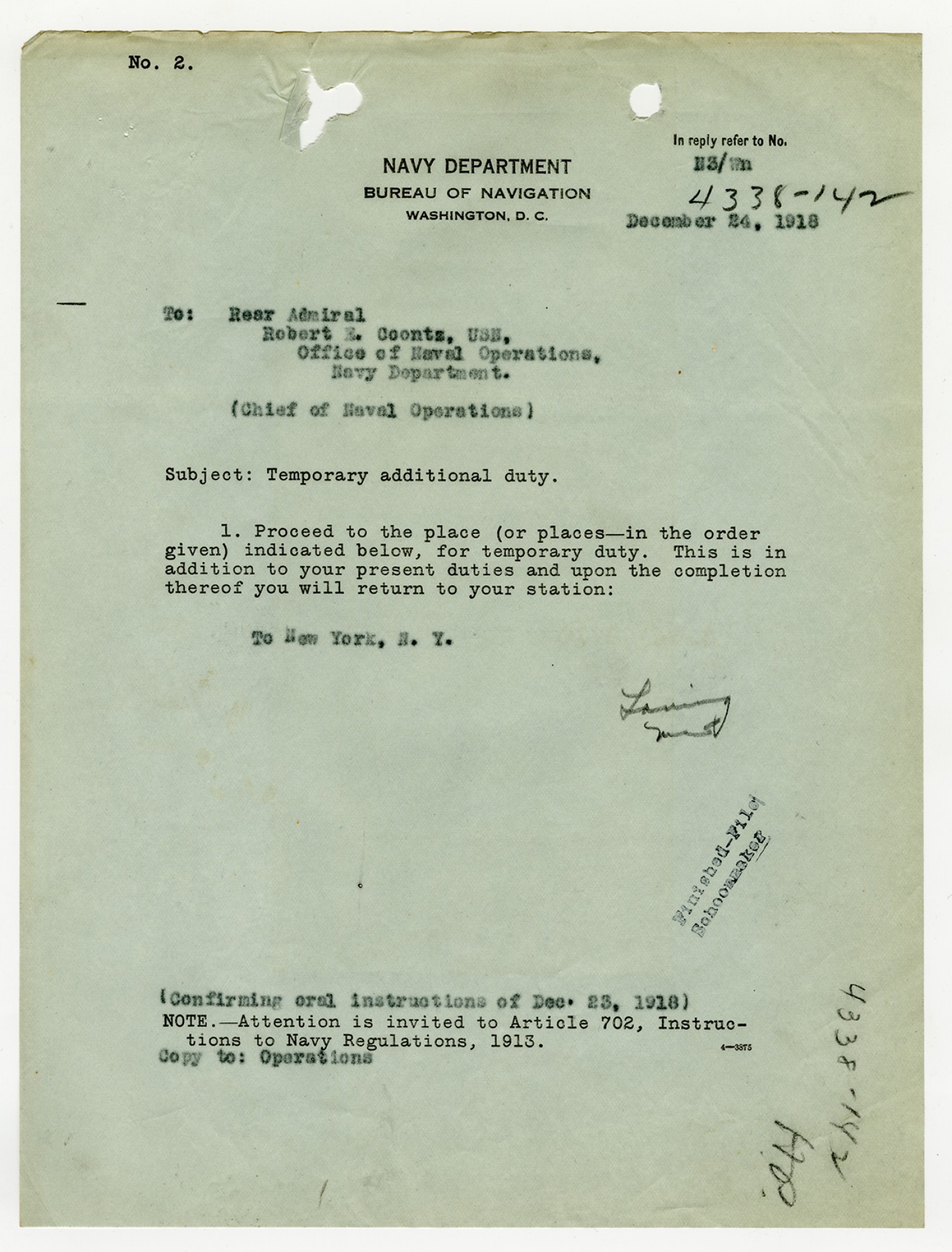 Secretary of the Navy letter to Robert E. Coontz - n.d.