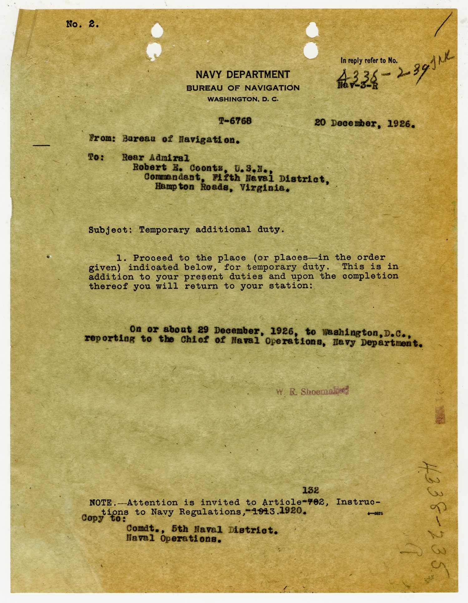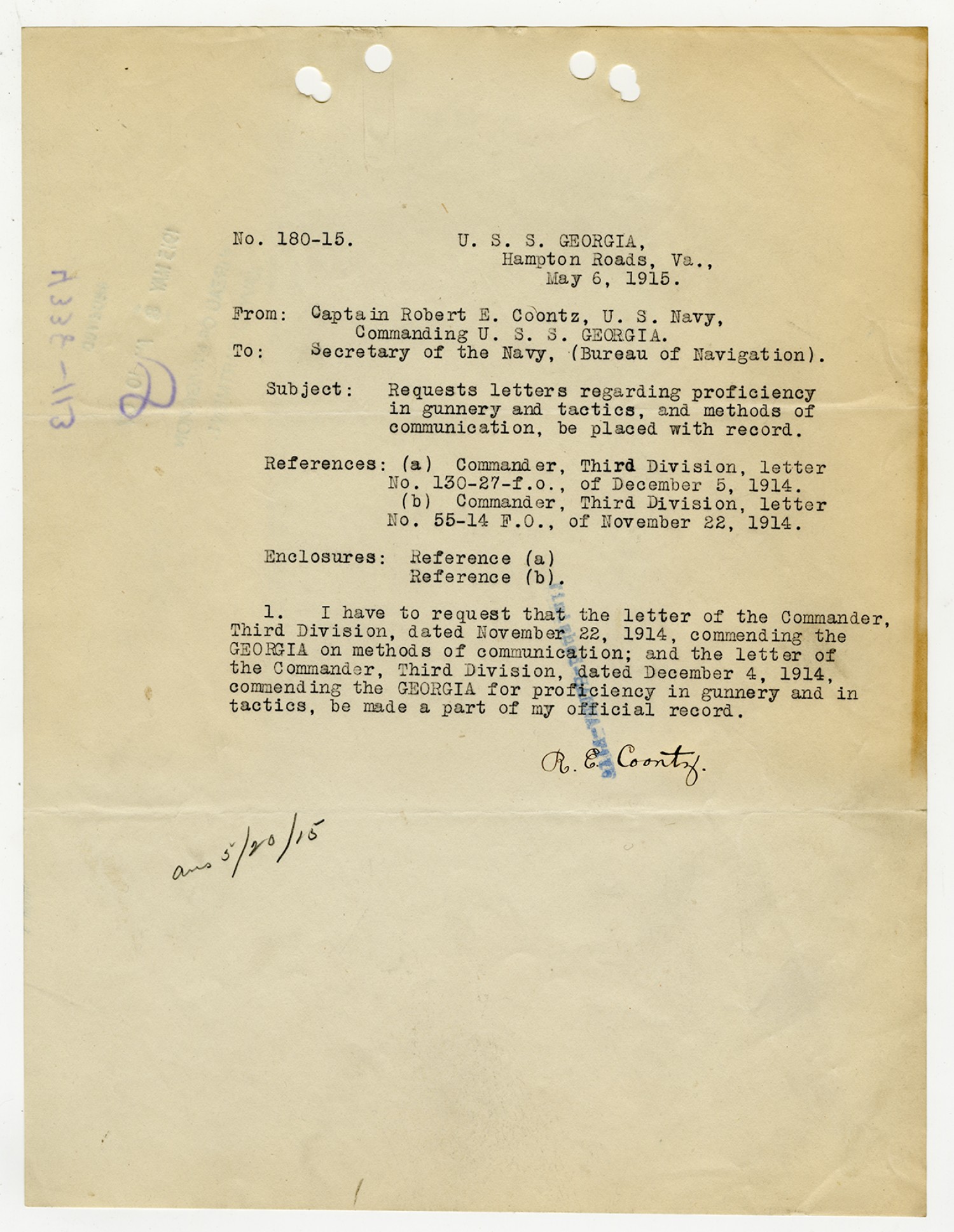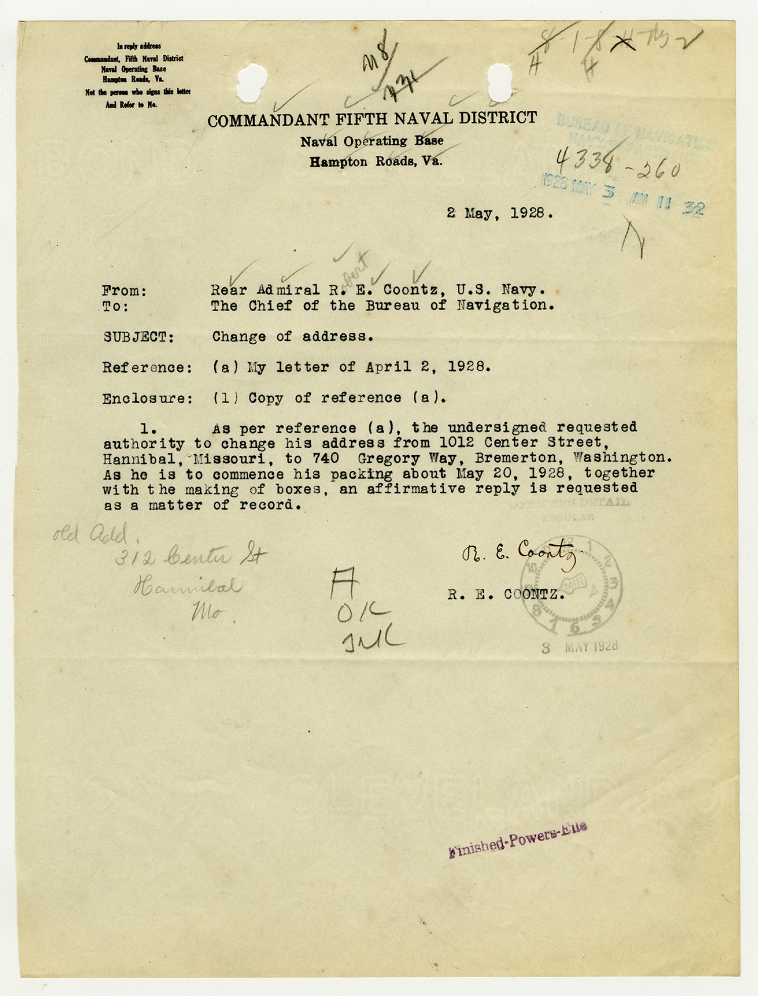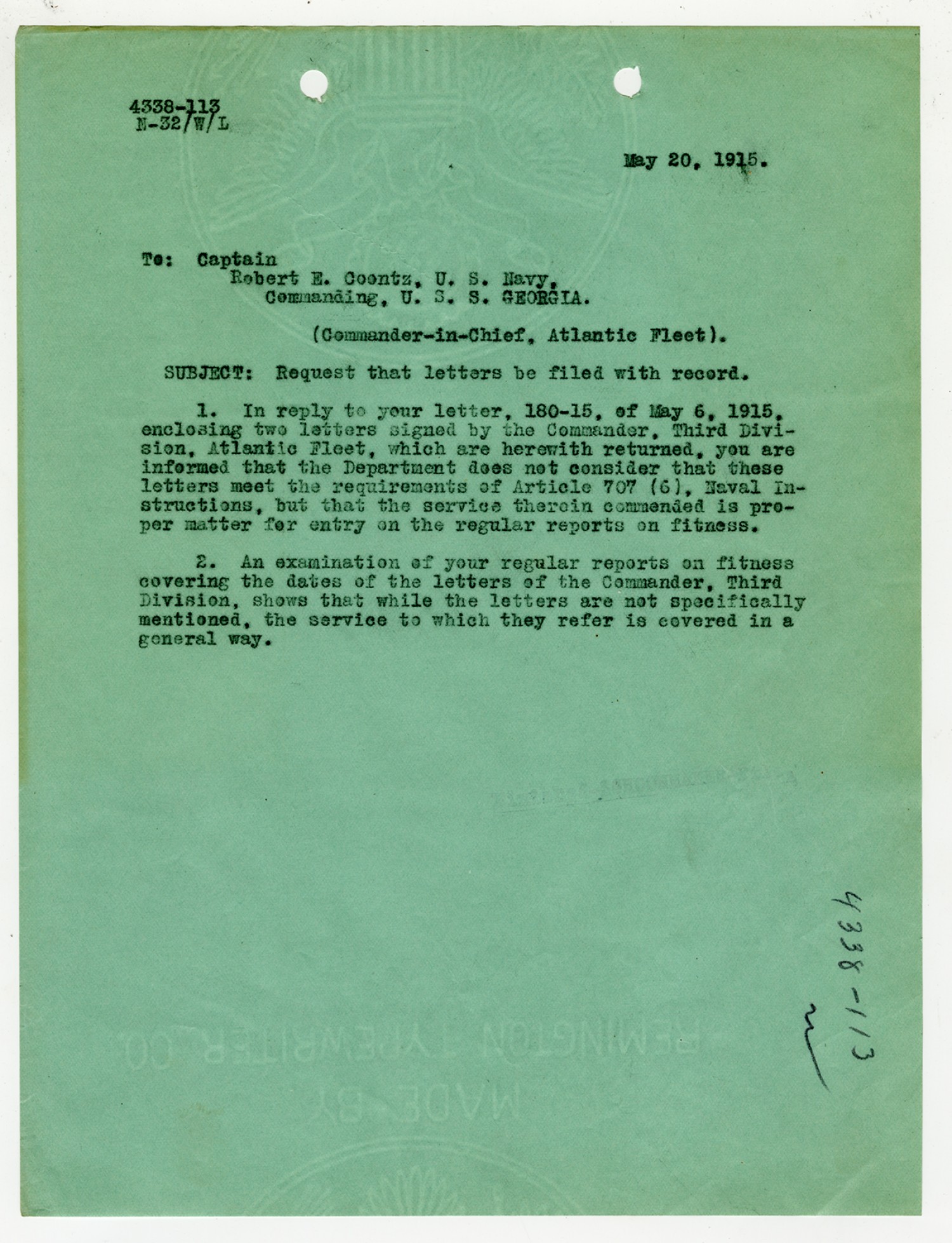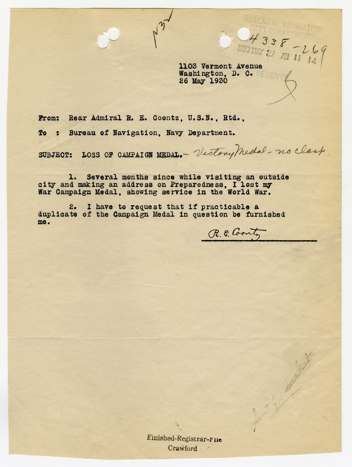 Robert E. Coontz letter to the Bureau of Navigation - May 26, 1930
