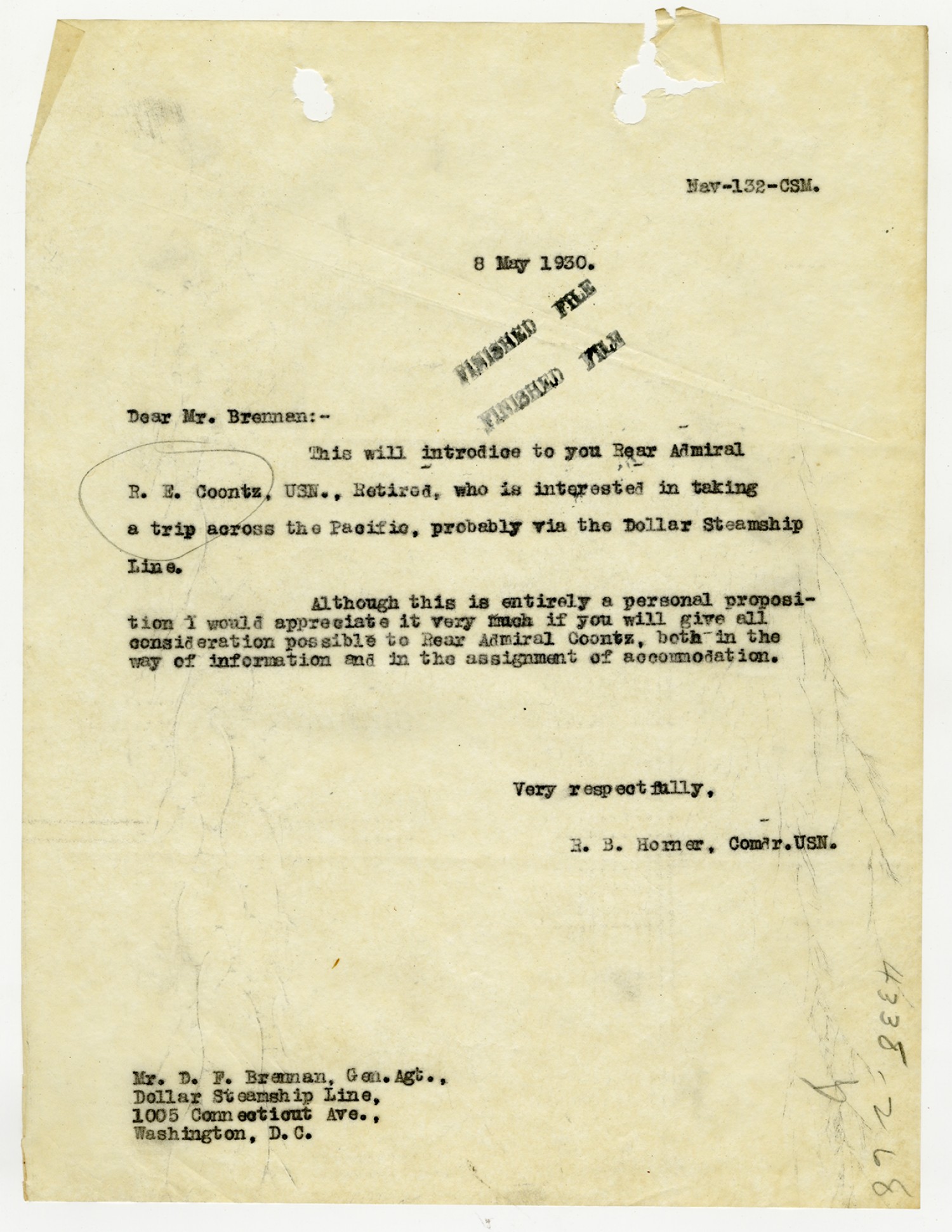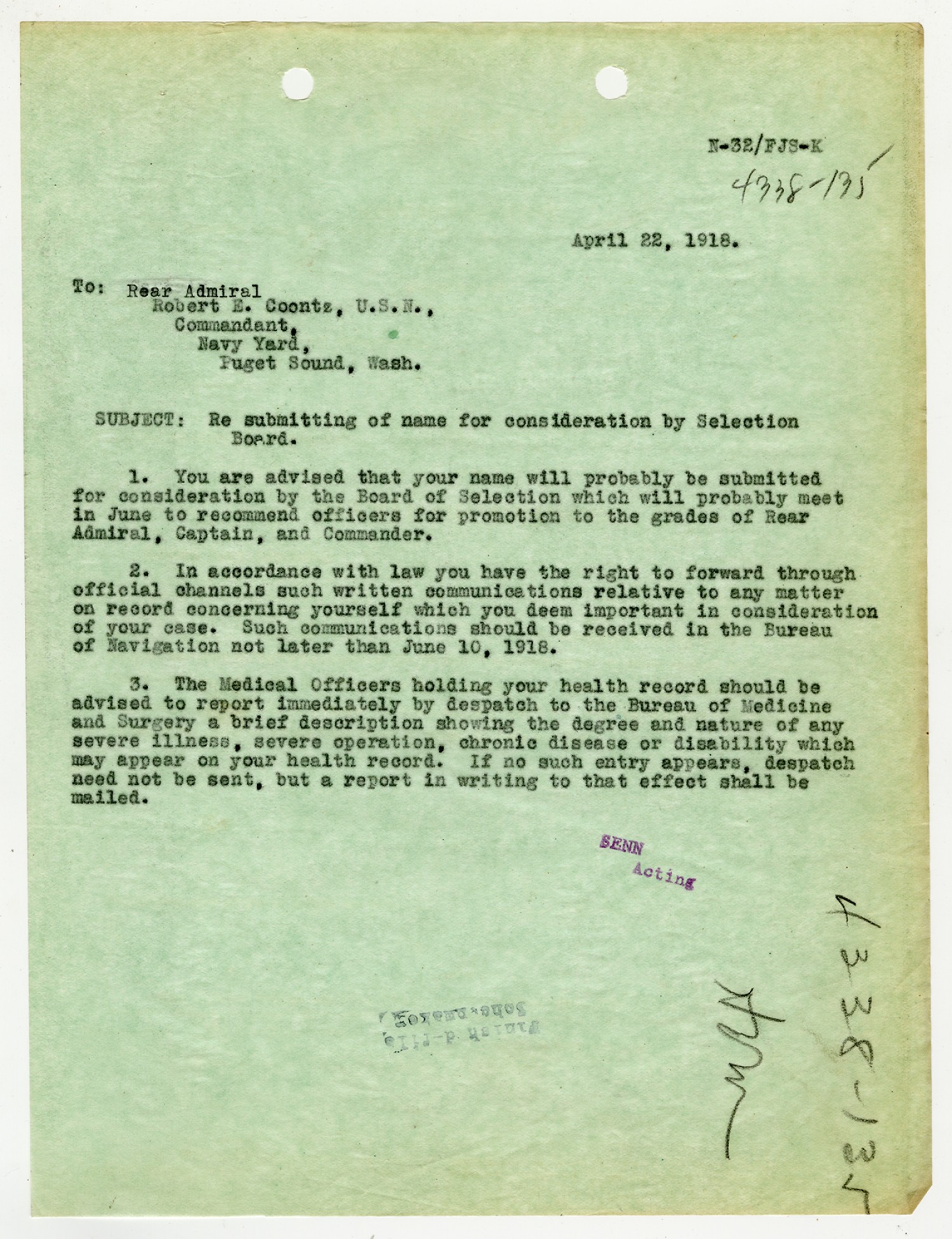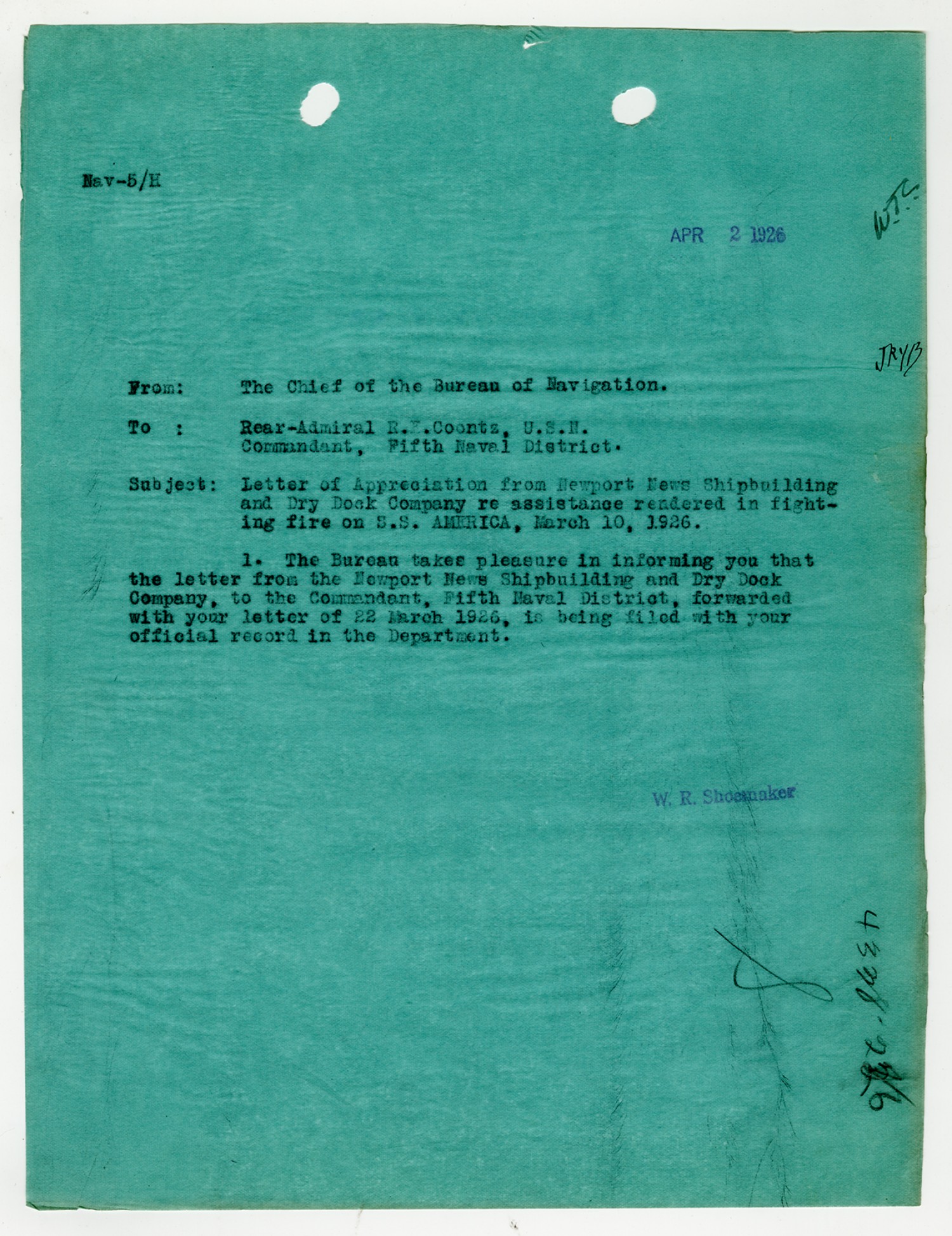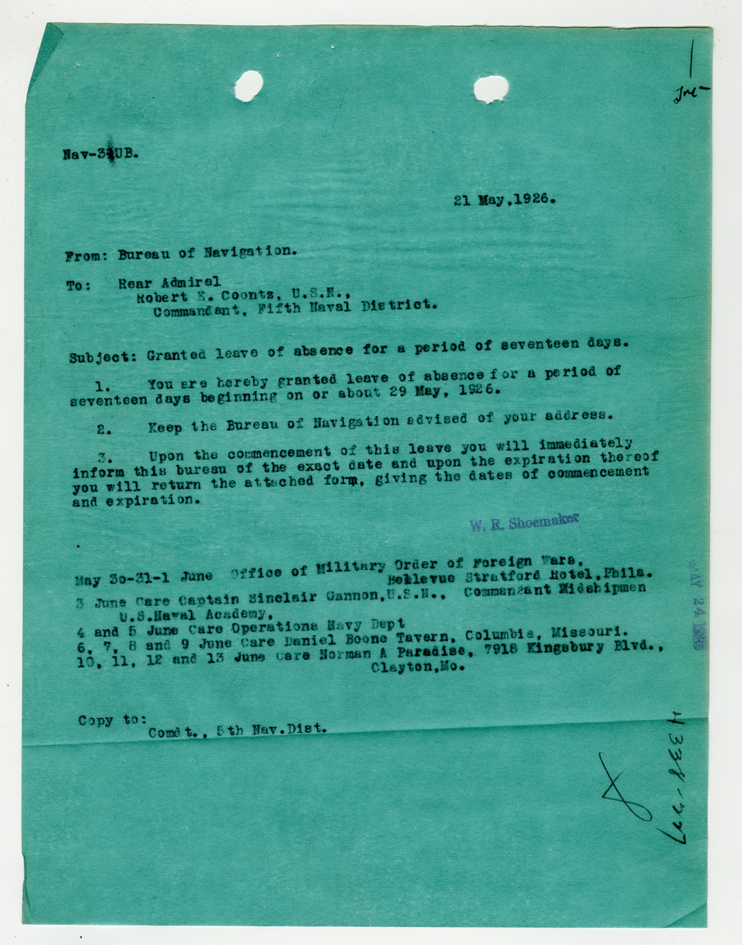Robert E. Coontz letter to the Bureau of Navigation - May 26, 1930