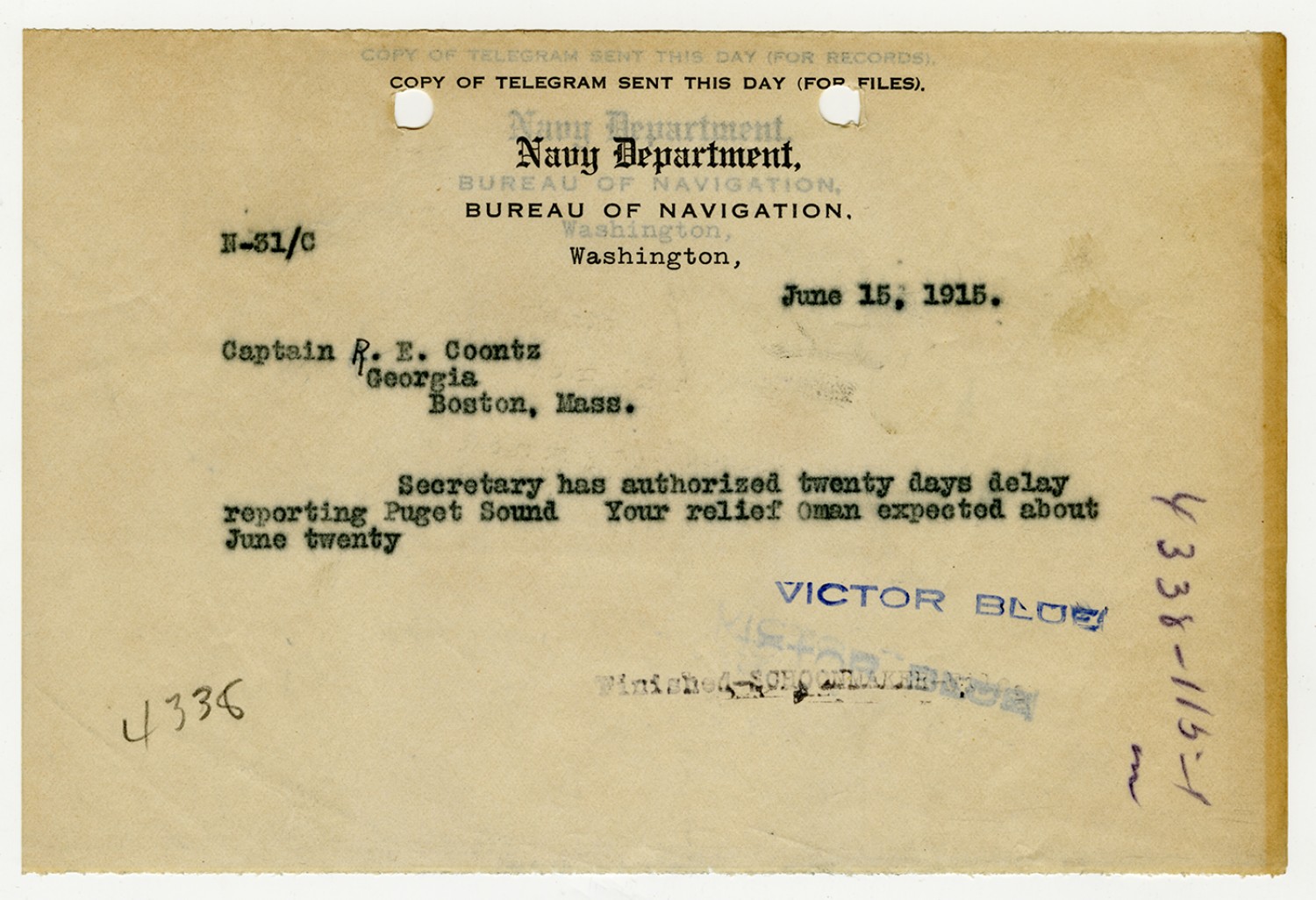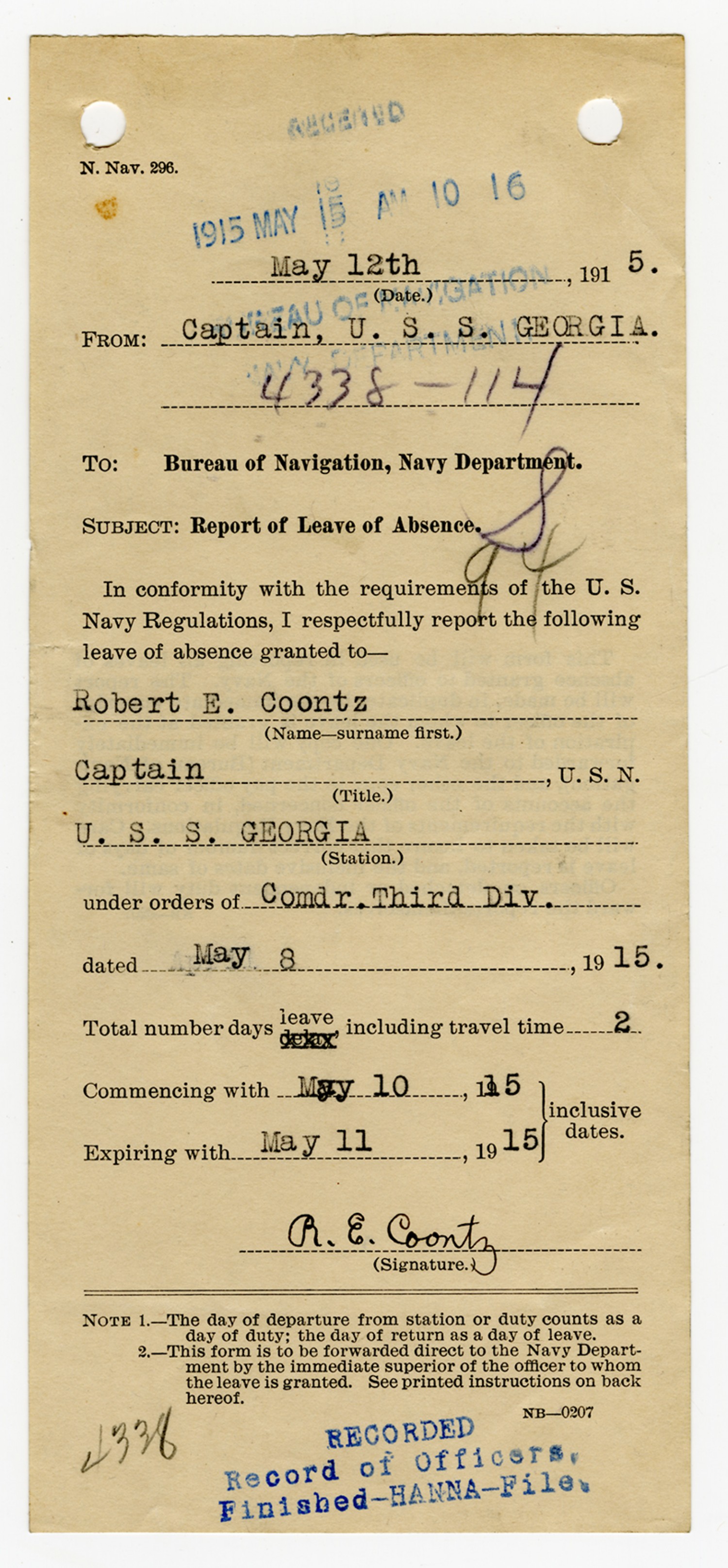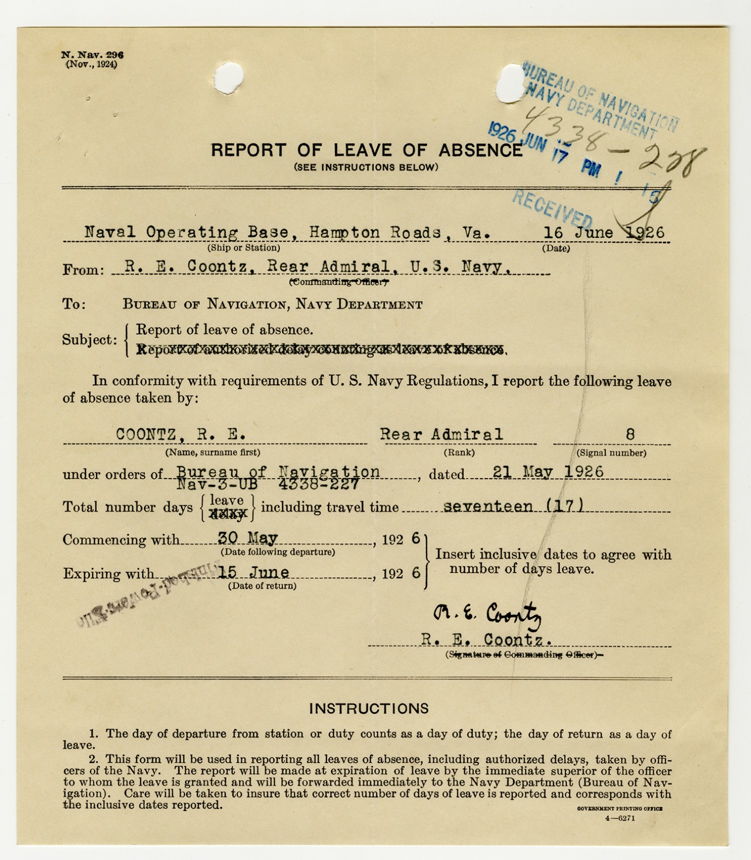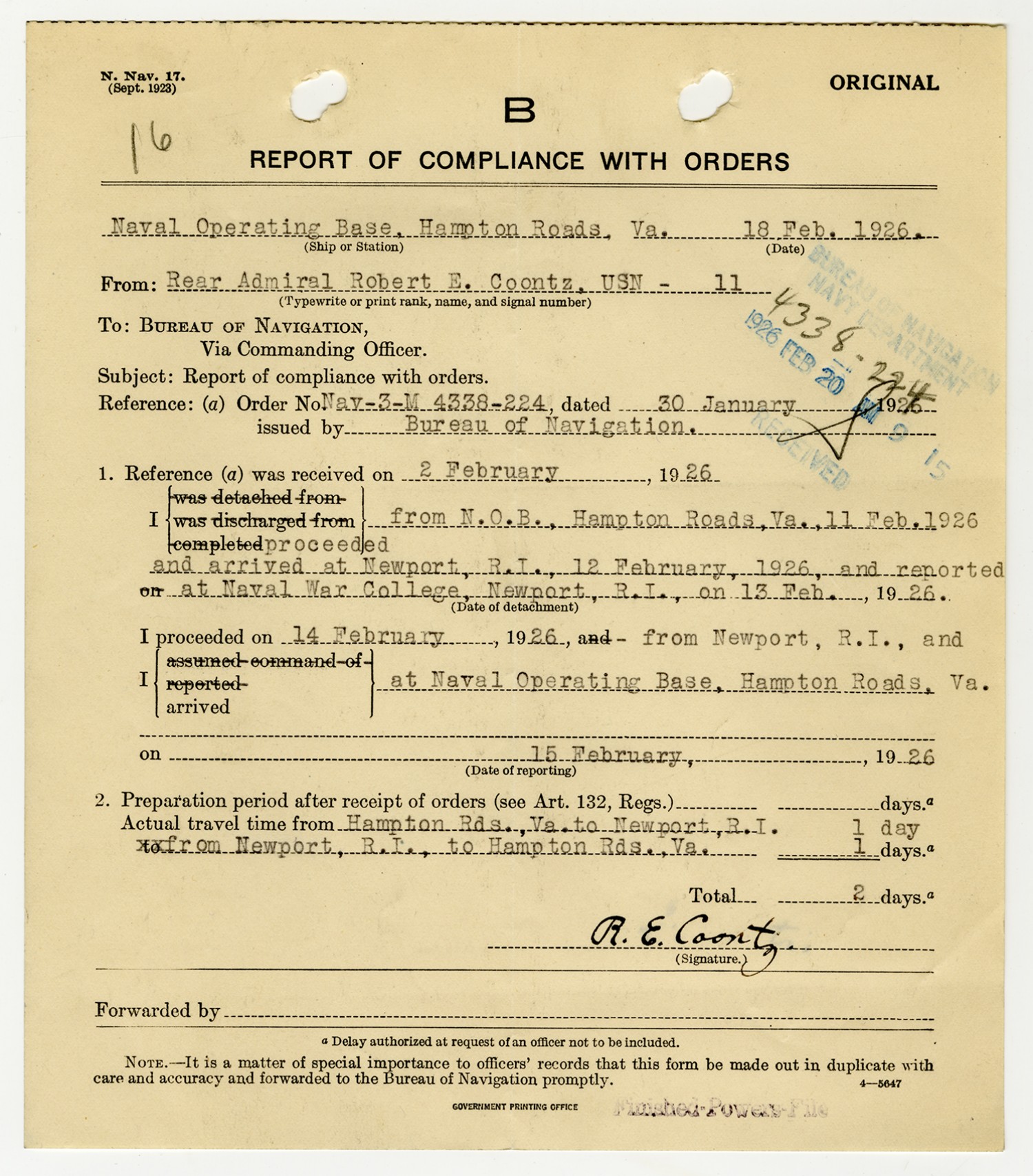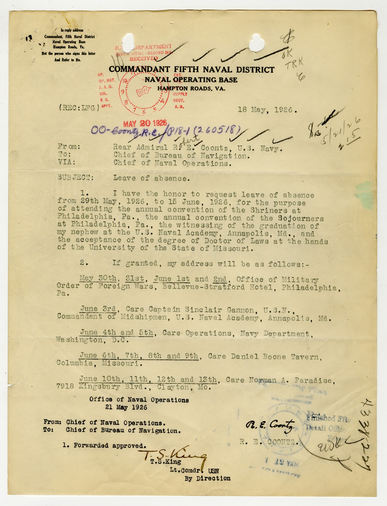 Robert E. Coontz letter to the Bureau of Navigation - May 26, 1930