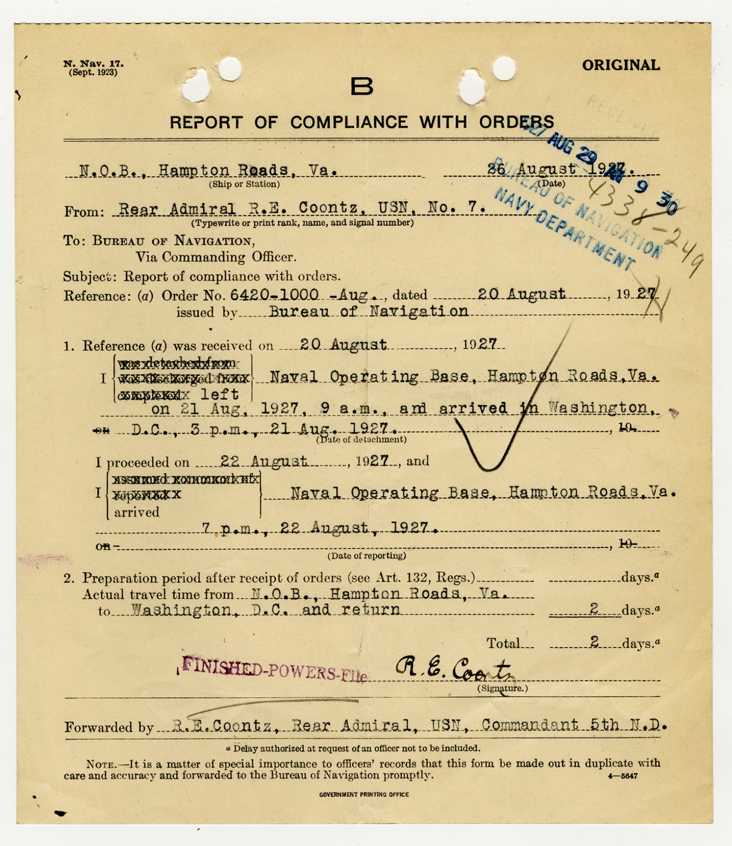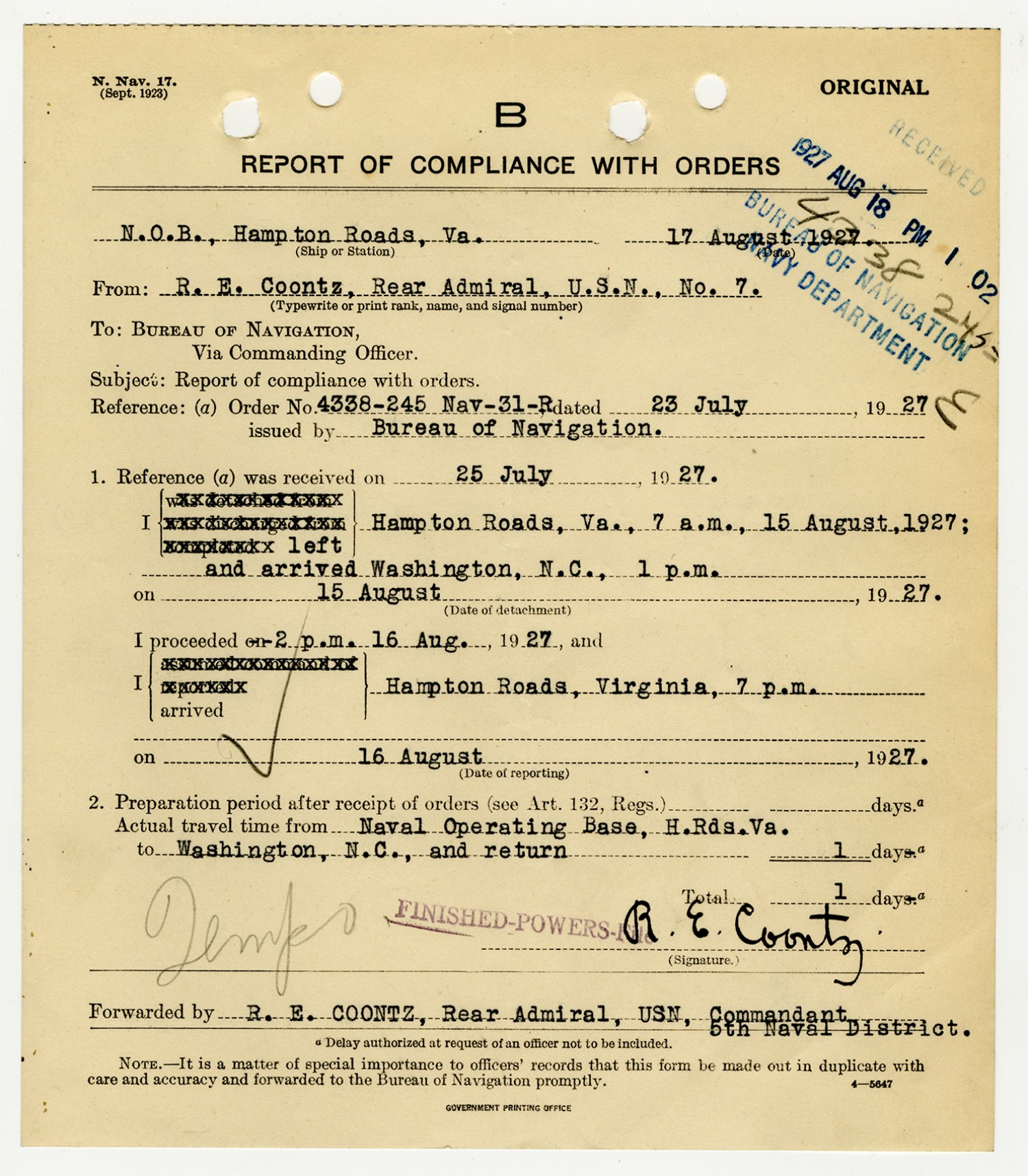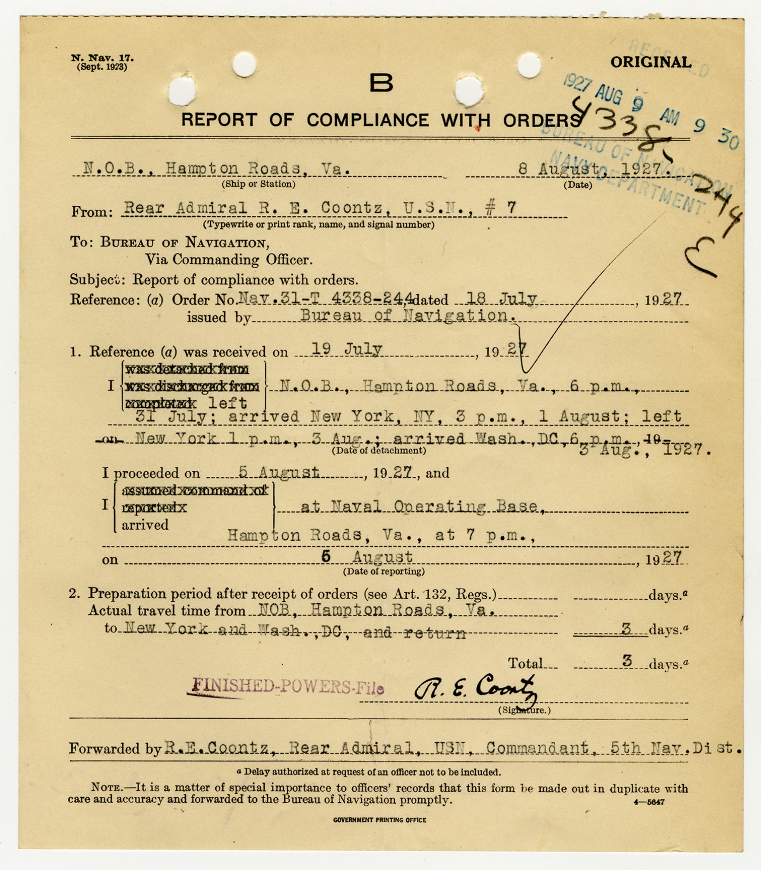 Robert E. Coontz letter to the Bureau of Navigation - August 9, 1927