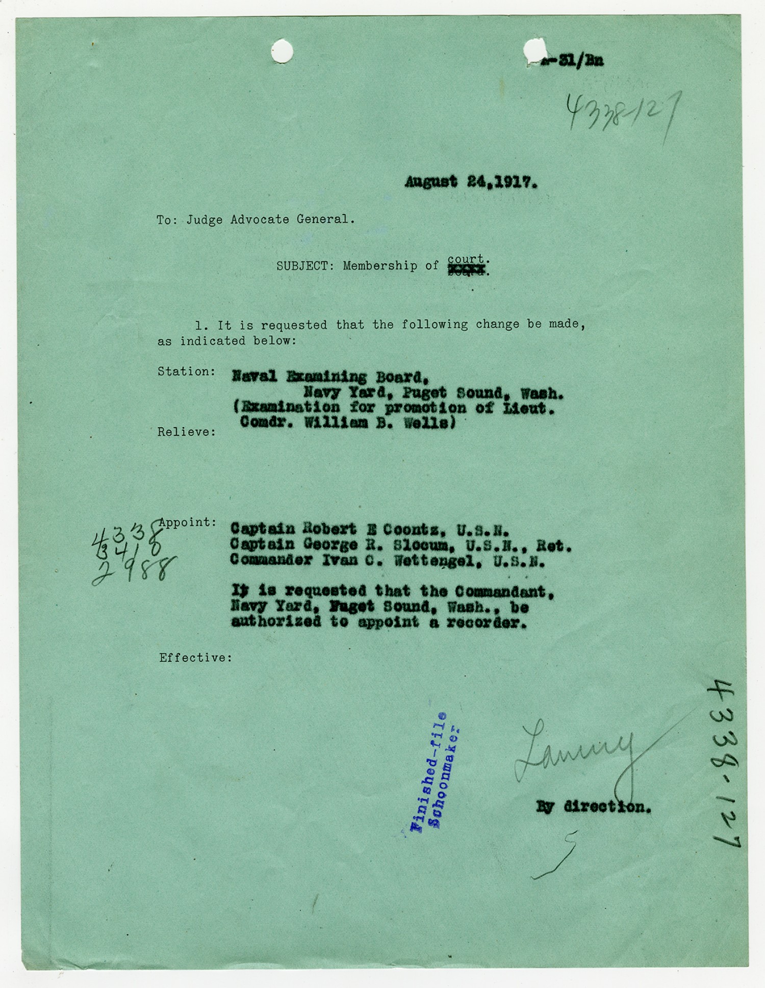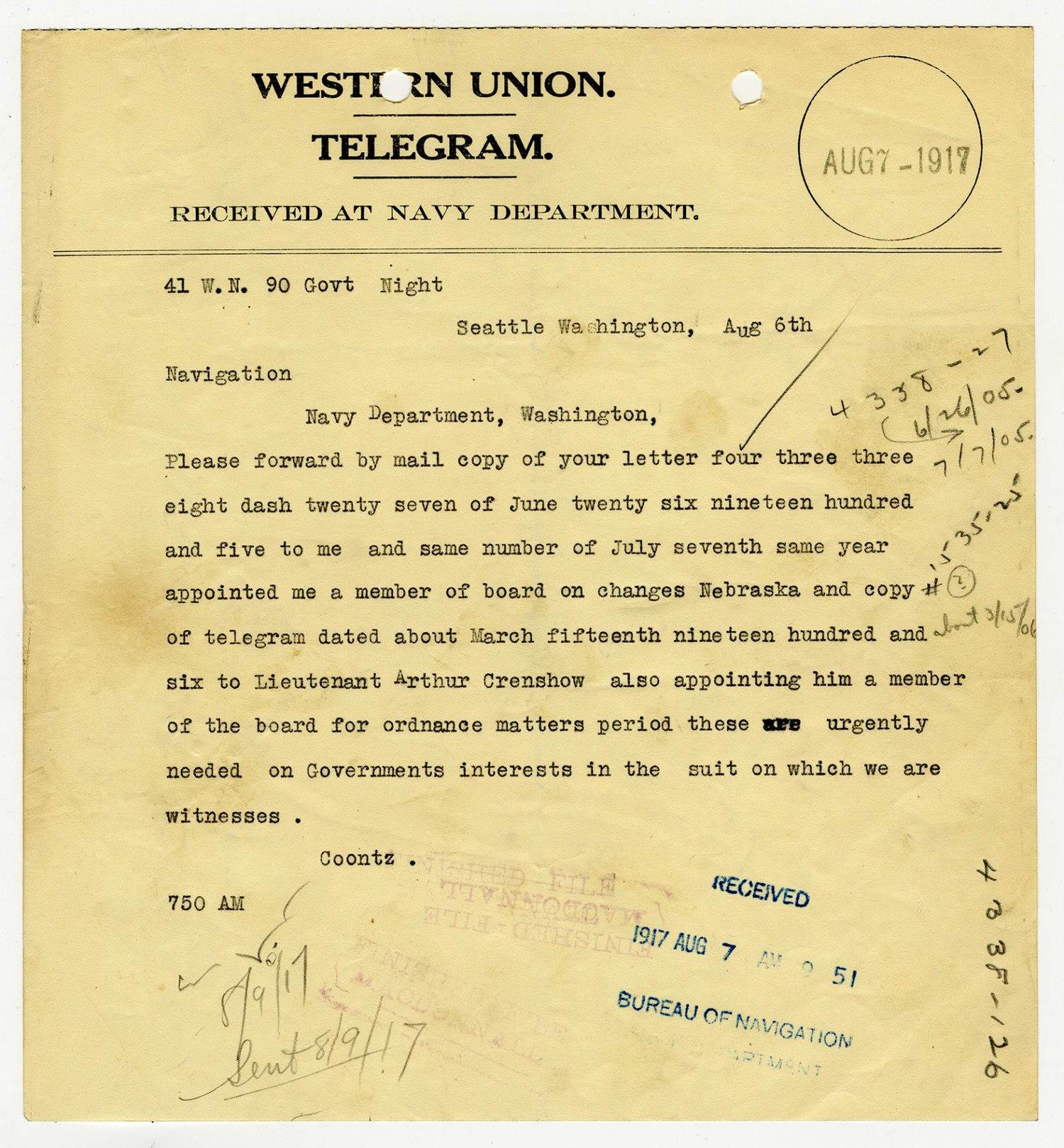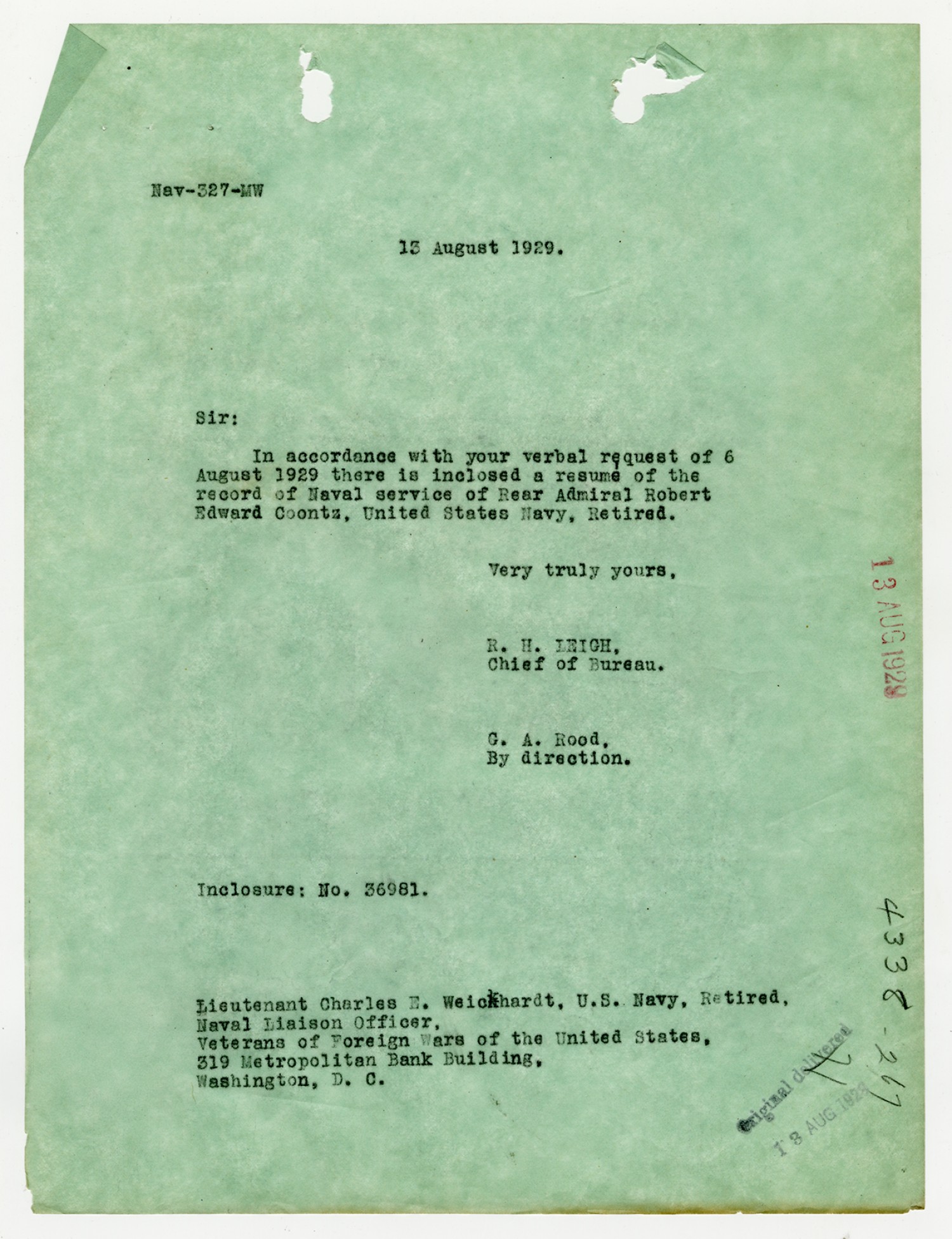 Robert E. Coontz letter to the Bureau of Navigation - August 9, 1927