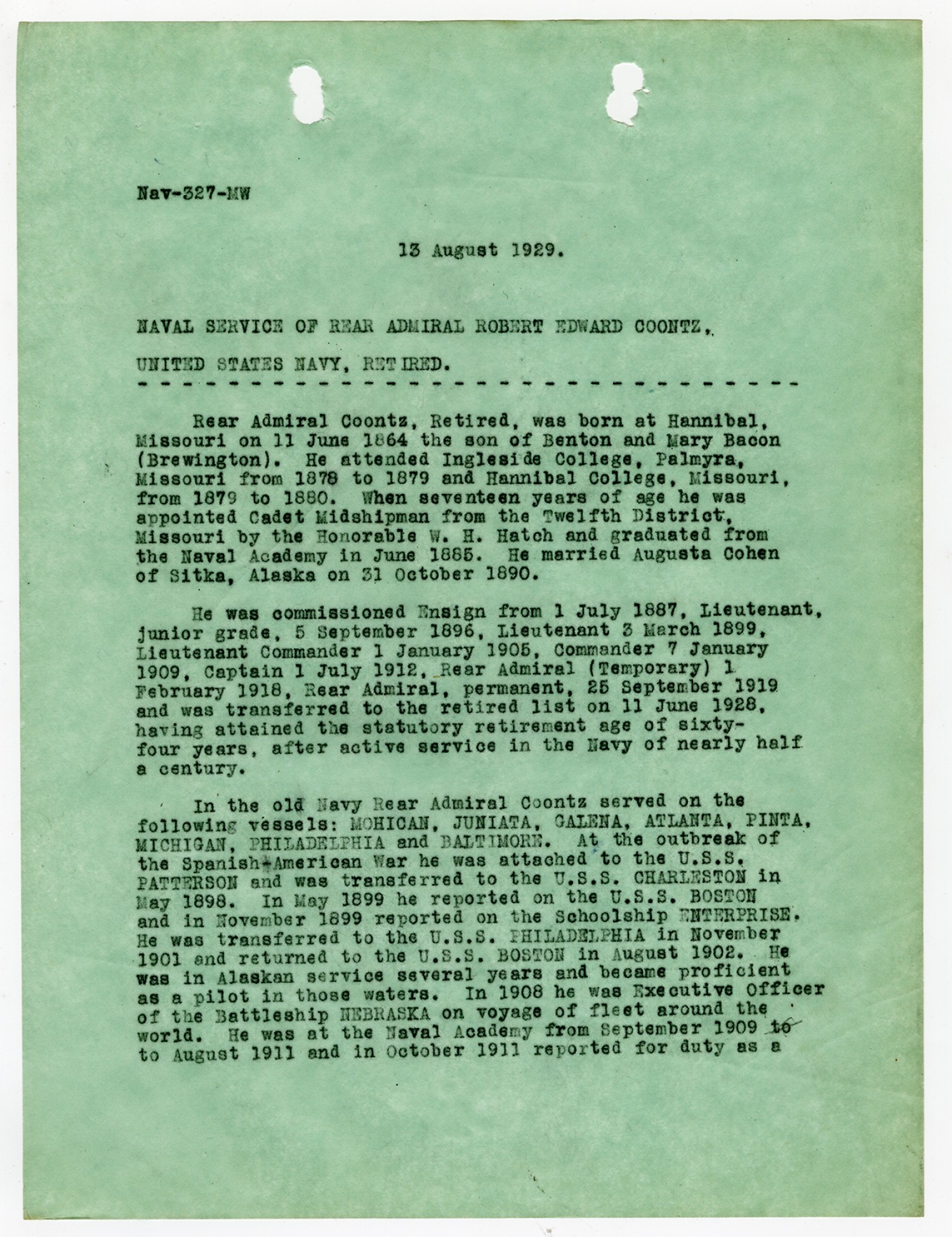 Robert E. Coontz Naval Service - August 13, 1929