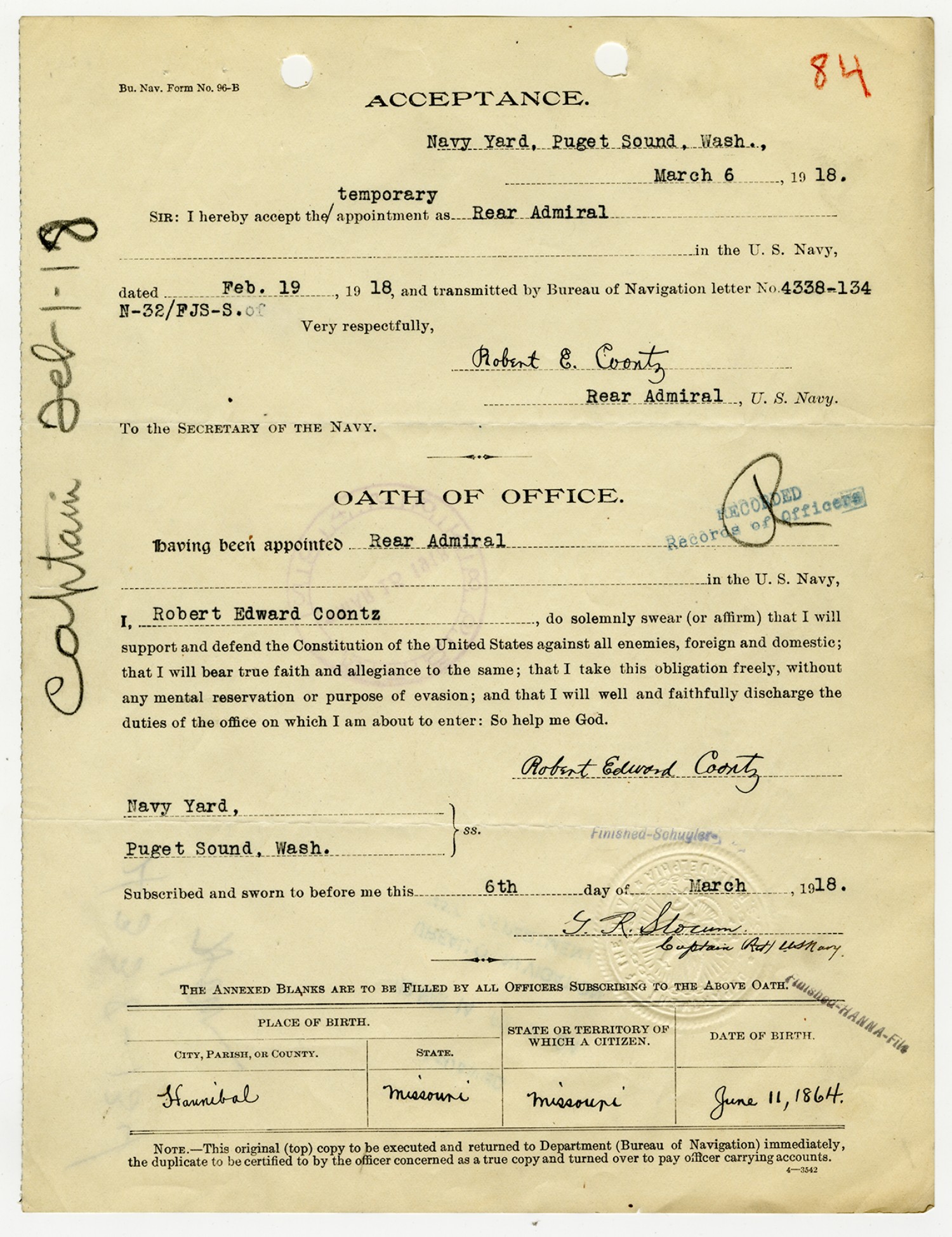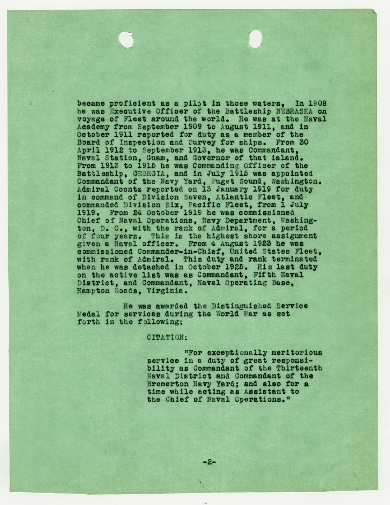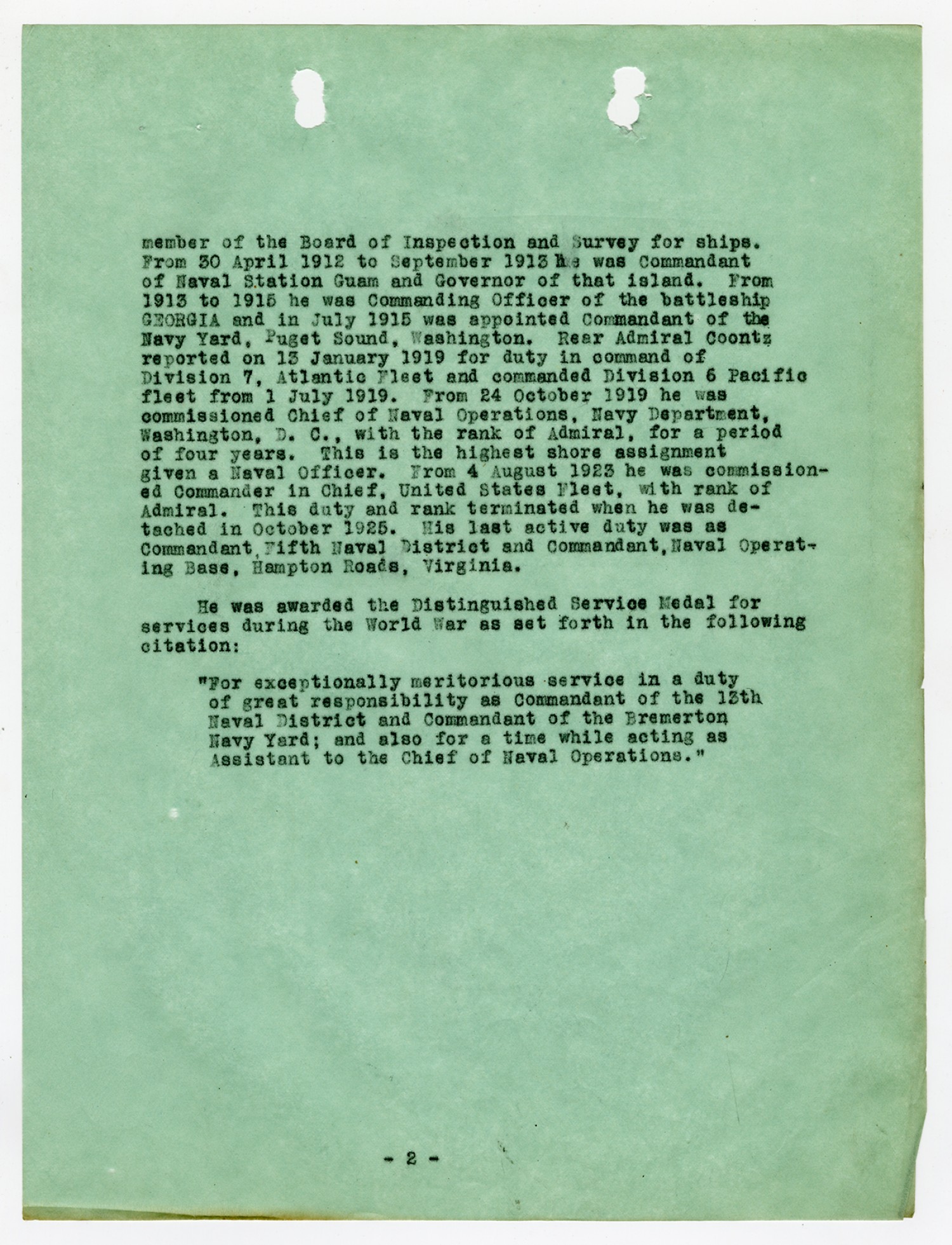 | Description | <p>Personnel record files for Admiral Robert E. Coontz containing a variety of items. Coontz graduated from the Naval Academy in 1885. He was later commissioned Ensign in 1887 and served as Rear Admiral during World War I. During the war he served as Commandant of the Navy Yard at Puget Sound, Washington. In January of 1919 he reported for duty in command of Division 7, Atlantic Fleet and commanded Division 6, Pacific Fleet. Later in October of 1919 he was commissioned Chief of Navl Operations, Navy Department, Washington D.C. He was awarded the Distinguished Cross award for his meritorious service in duty as Commandant of the 13th Naval District and Commandant of the Bremerton Navy Yard.</p> |