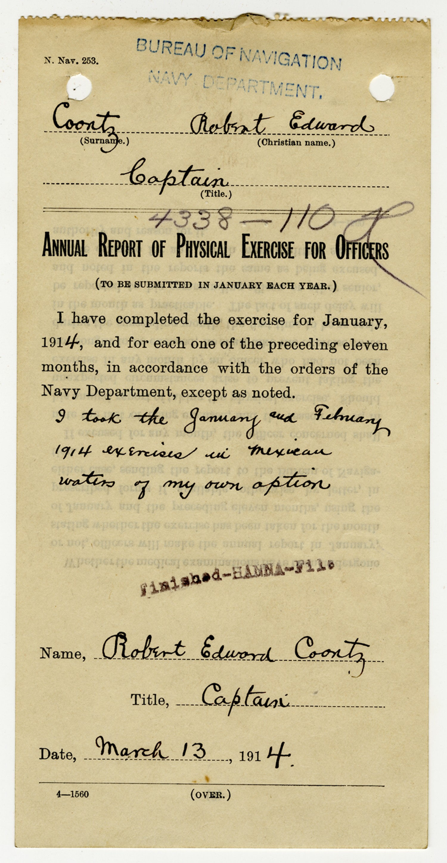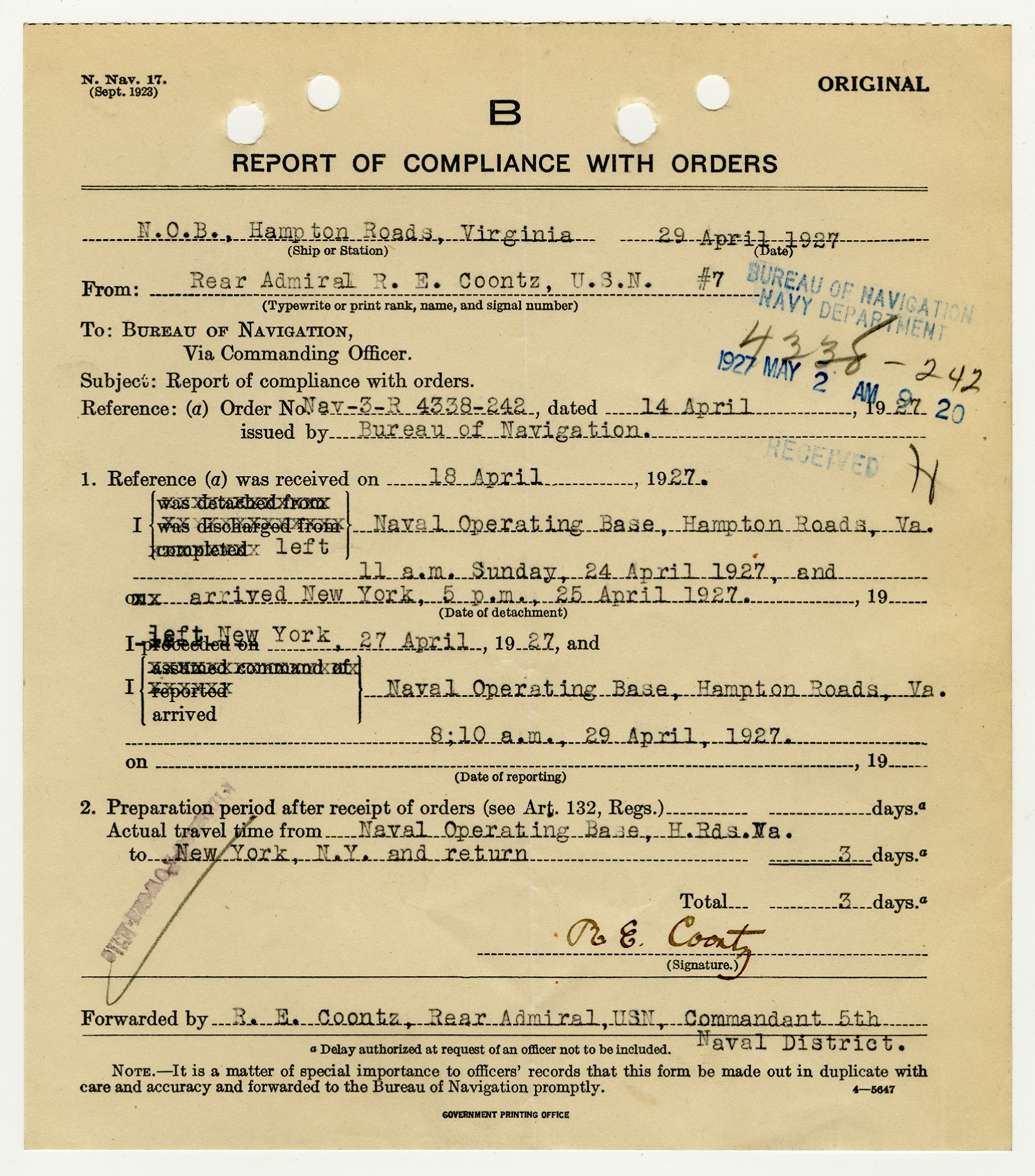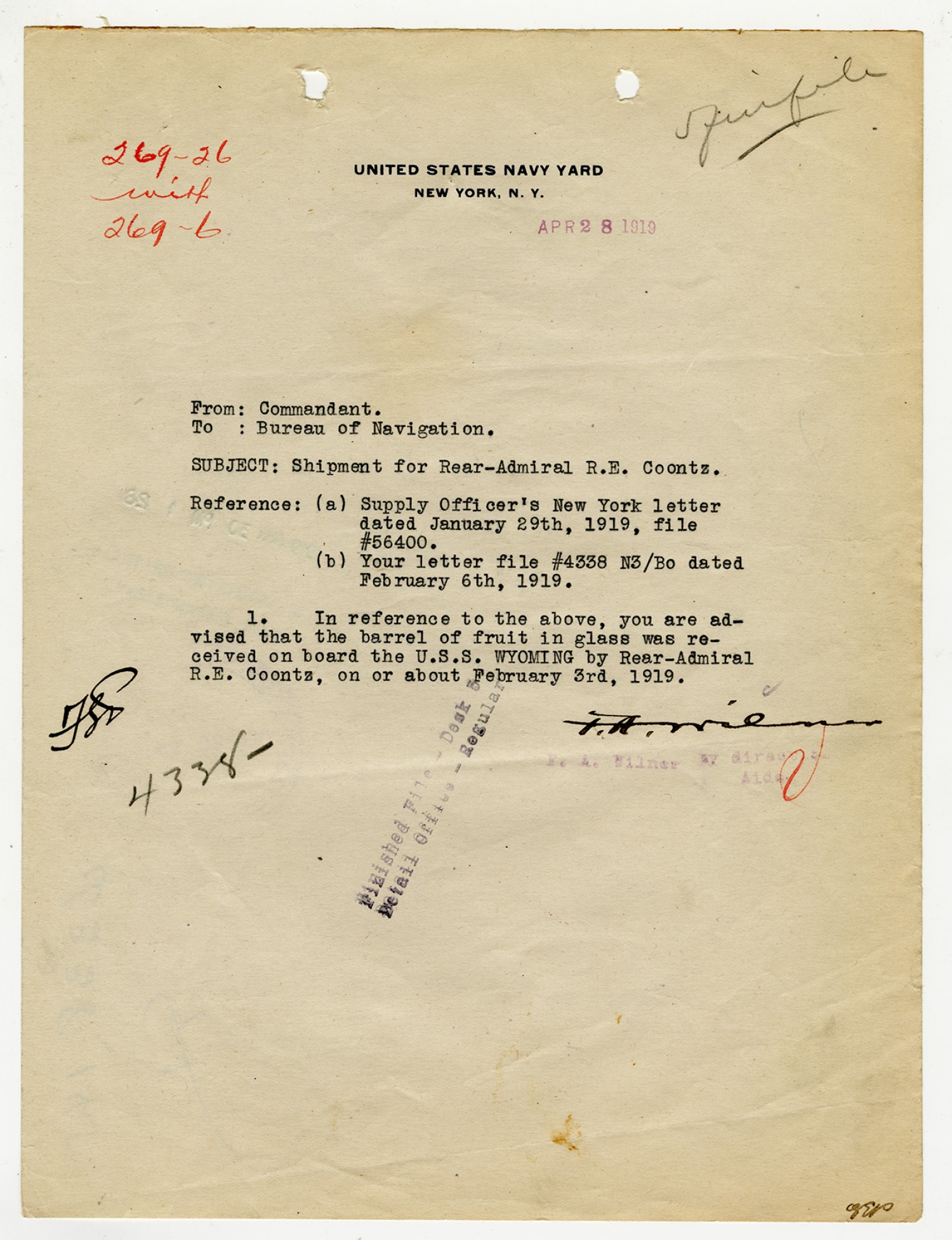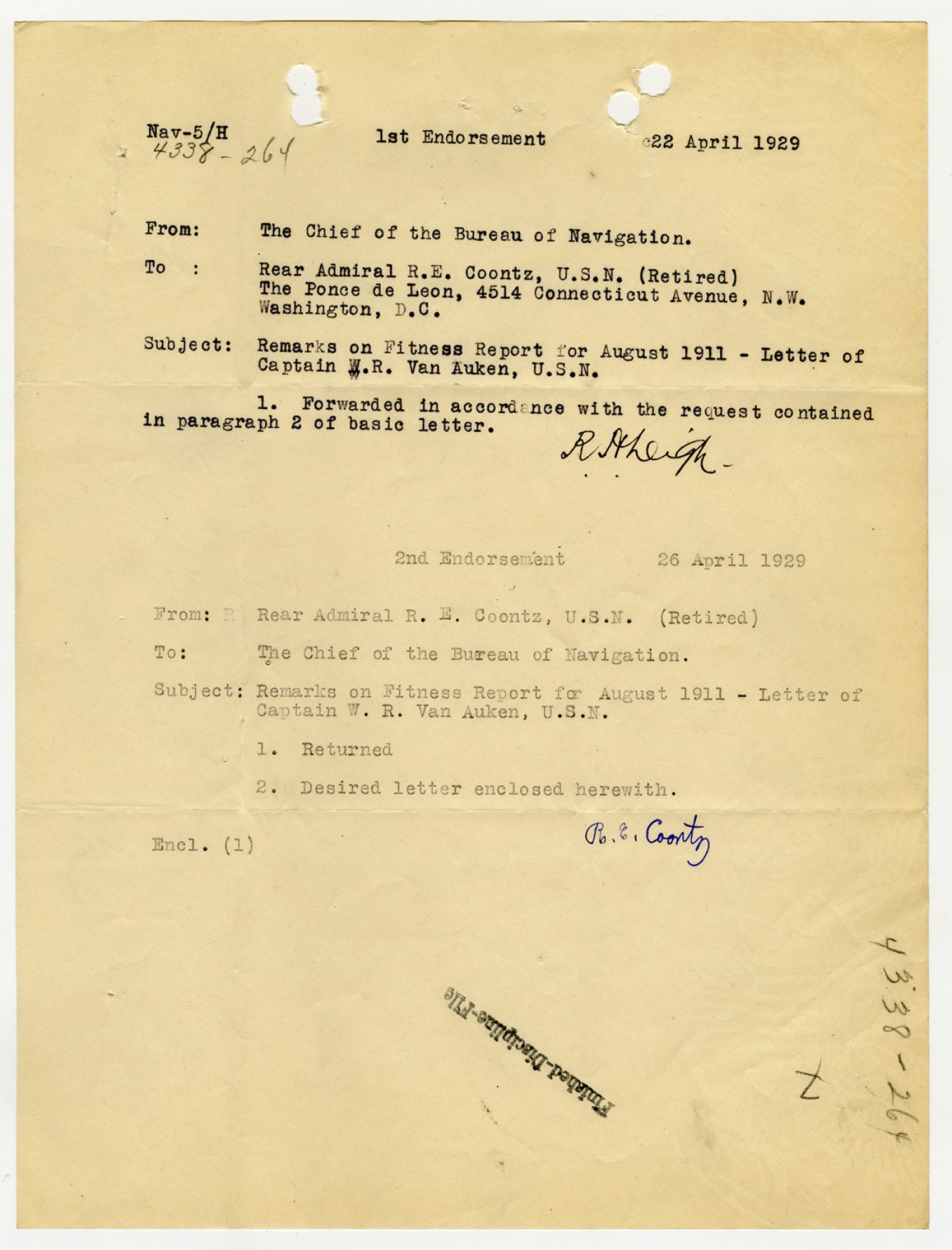 Robert E. Coontz letter to the Bureau of Navigation - April 26, 1929