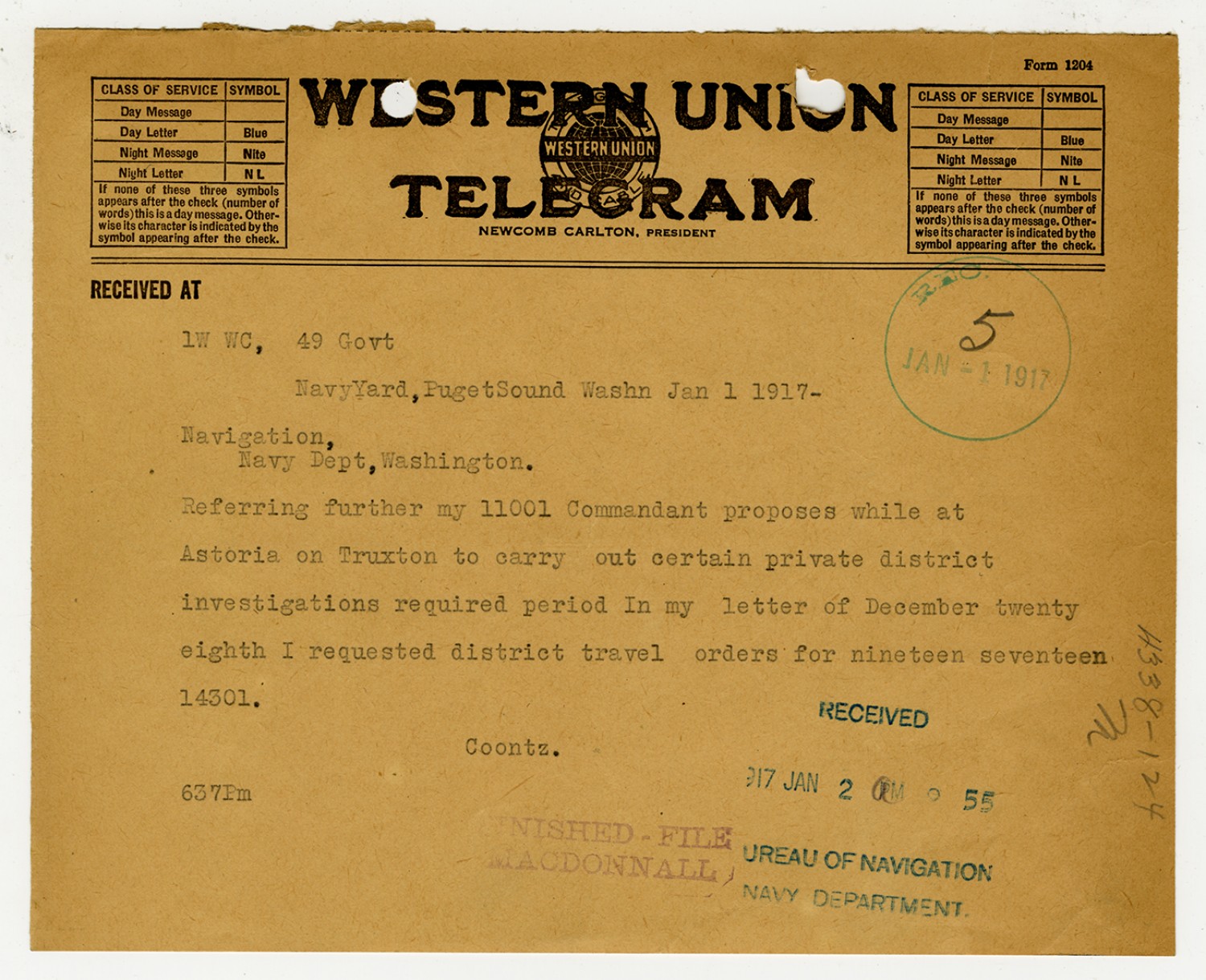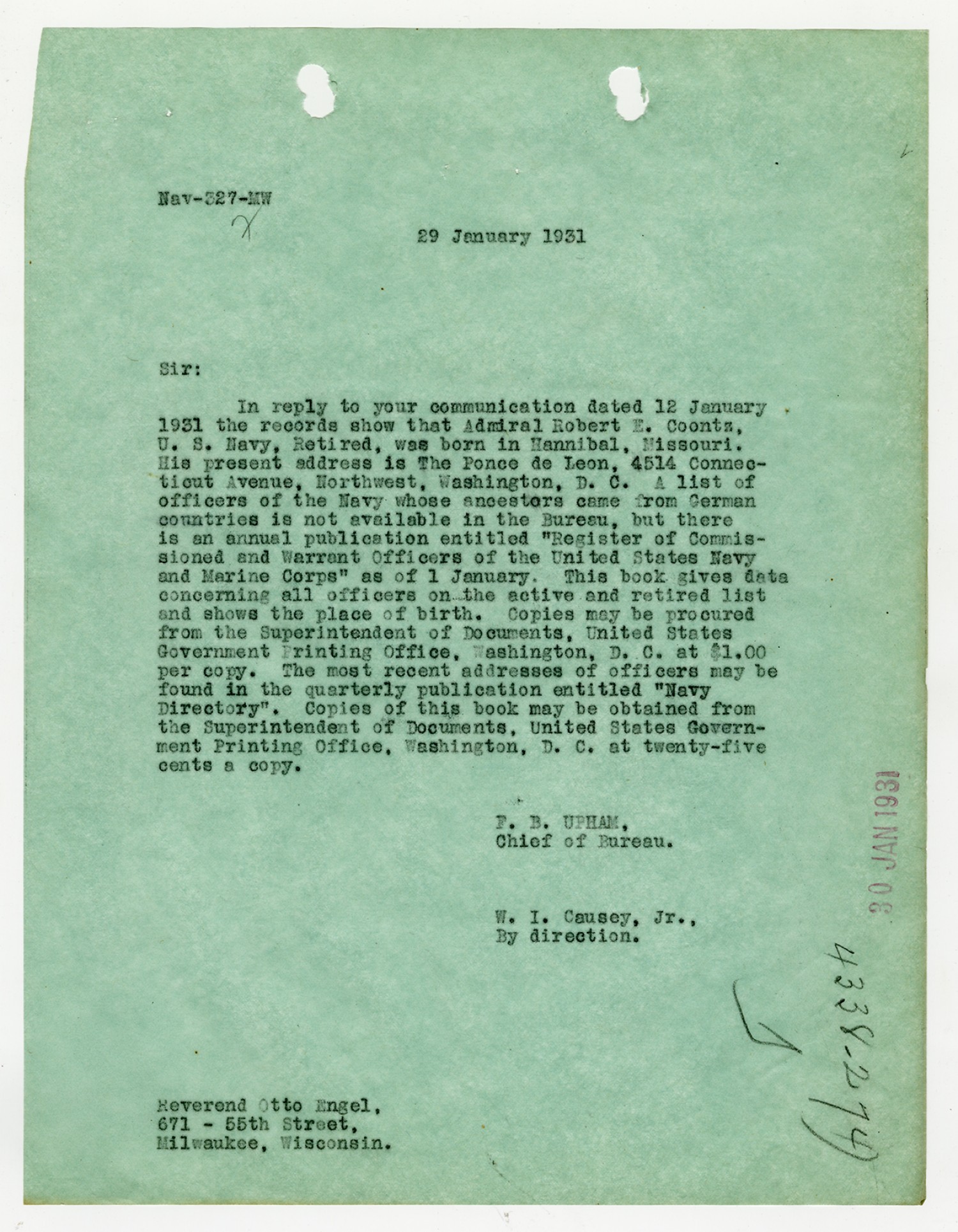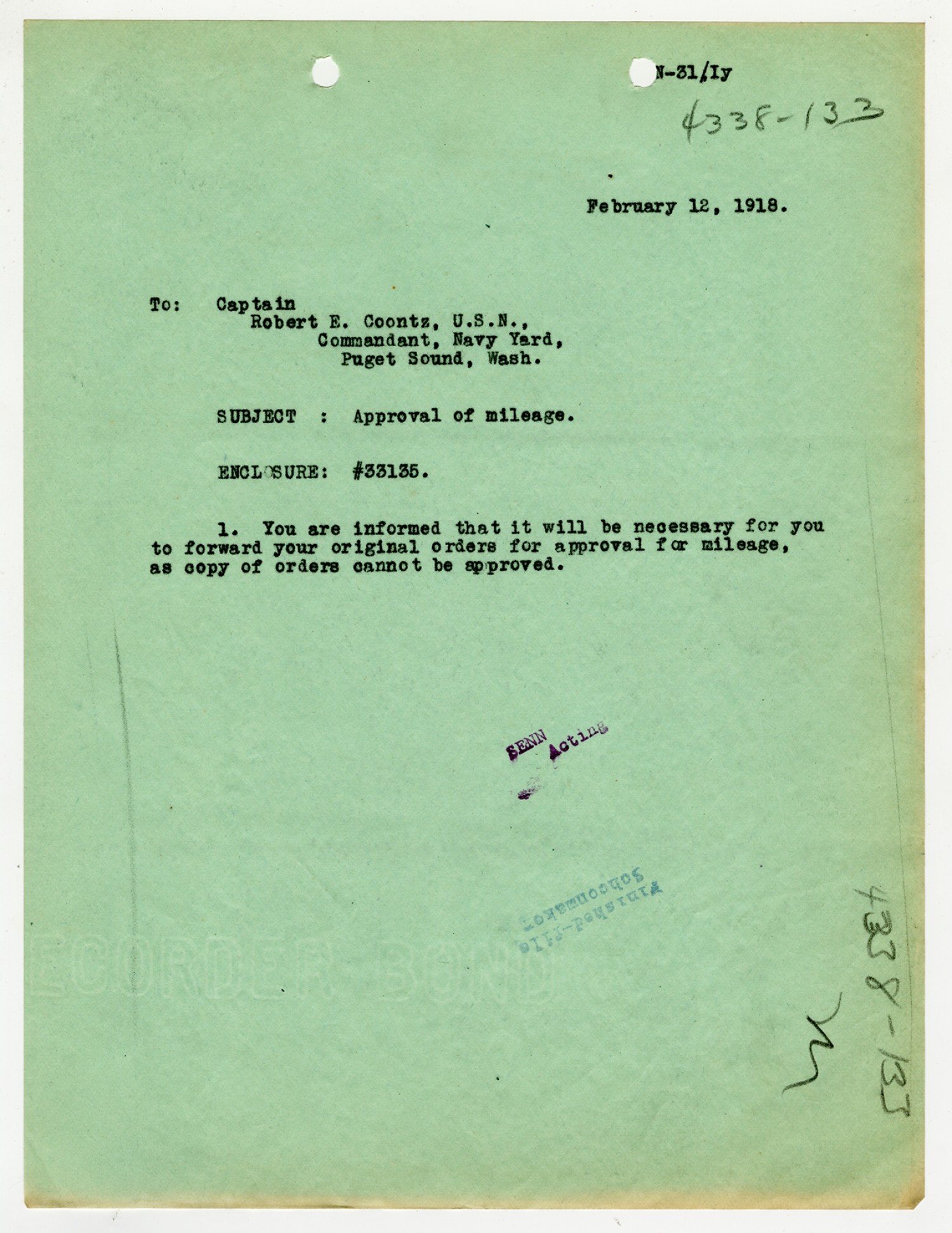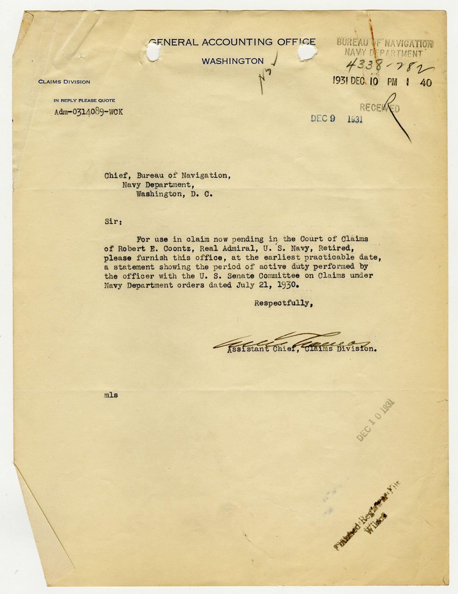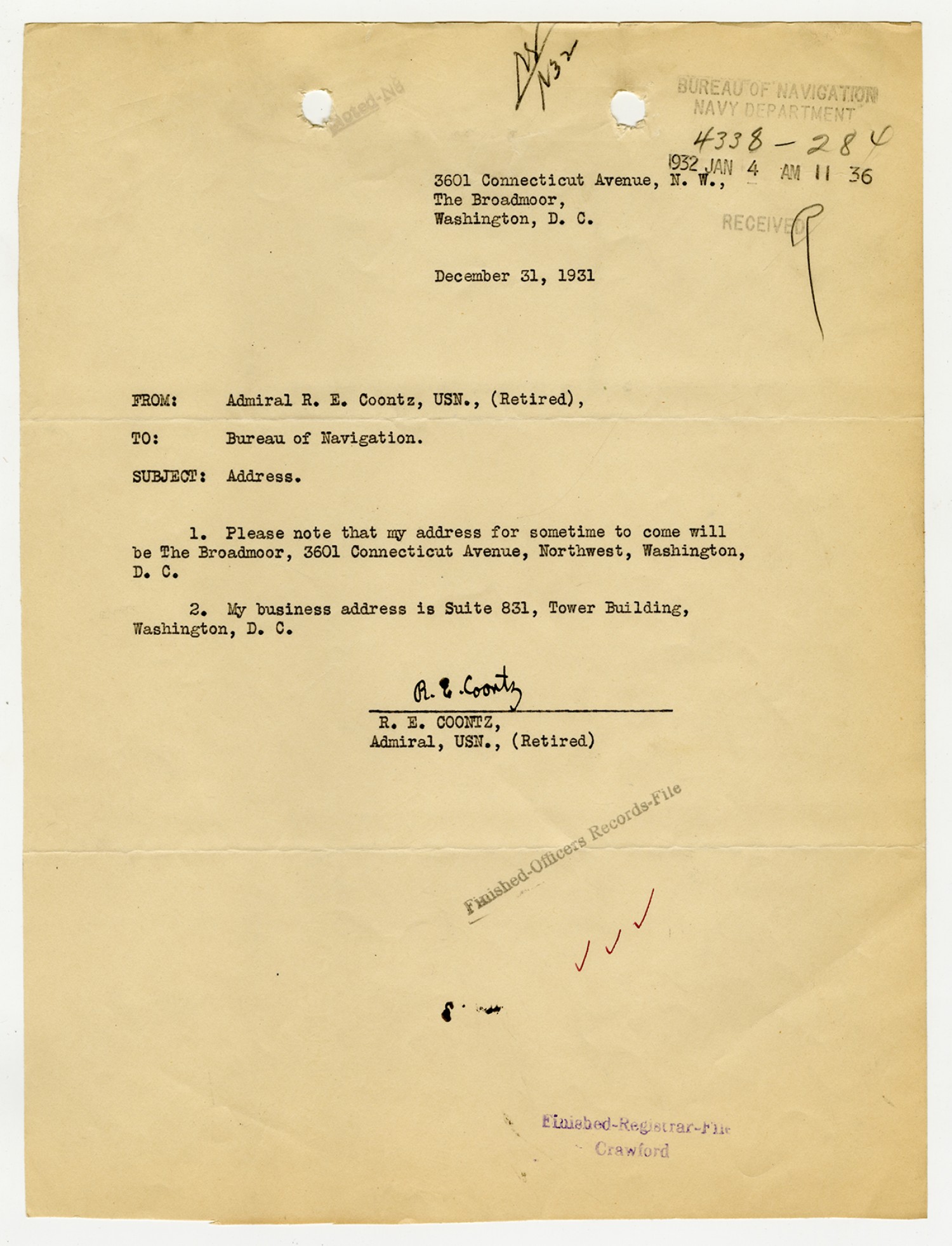 Robert E. Coontz letter to the Bureau of Navigation - December 31, 1931