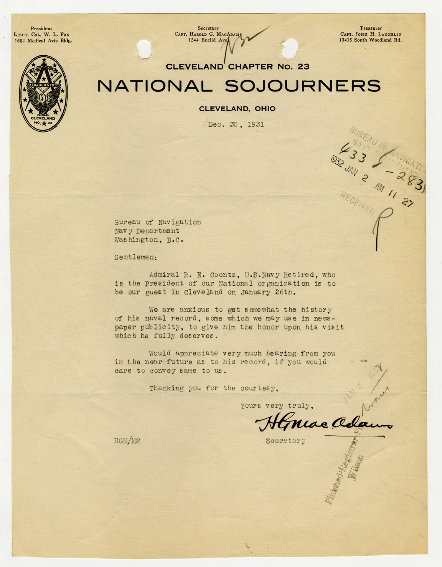 Harold G. MacAdams letter to the Bureau of Navigation - December 30, 1931