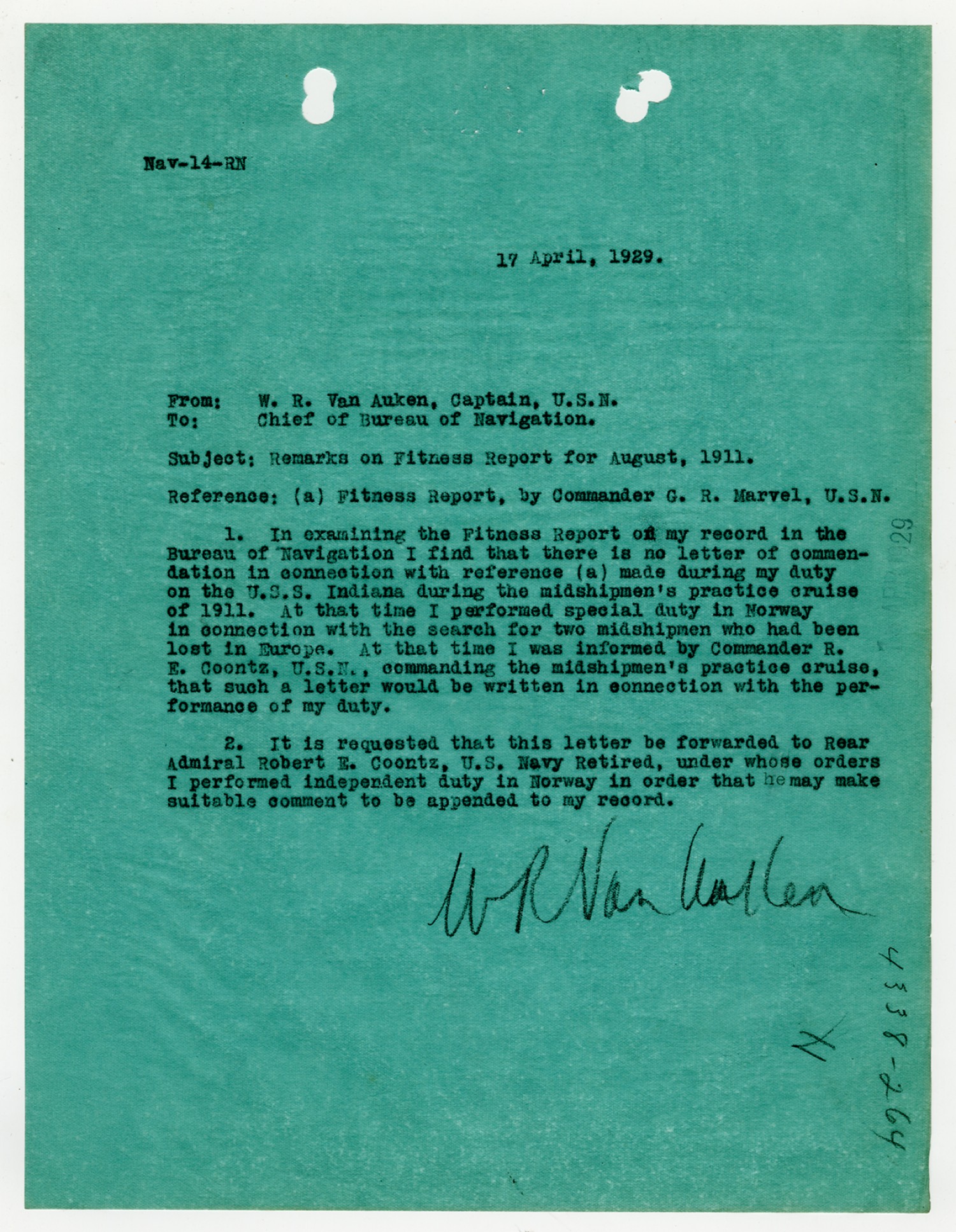 W.R Van Auken letter to the Chief of the Bureau of Navigation - April 17, 1929