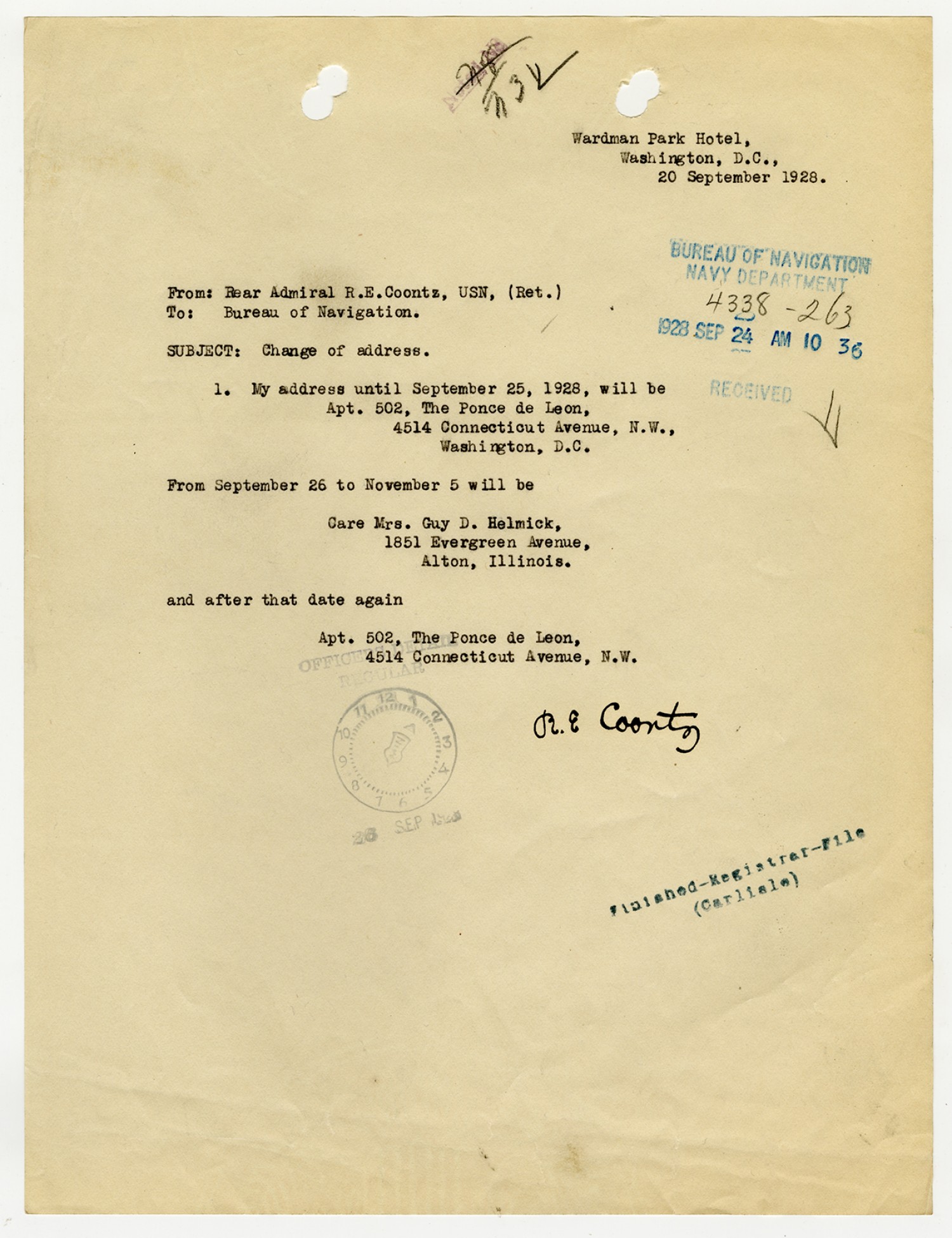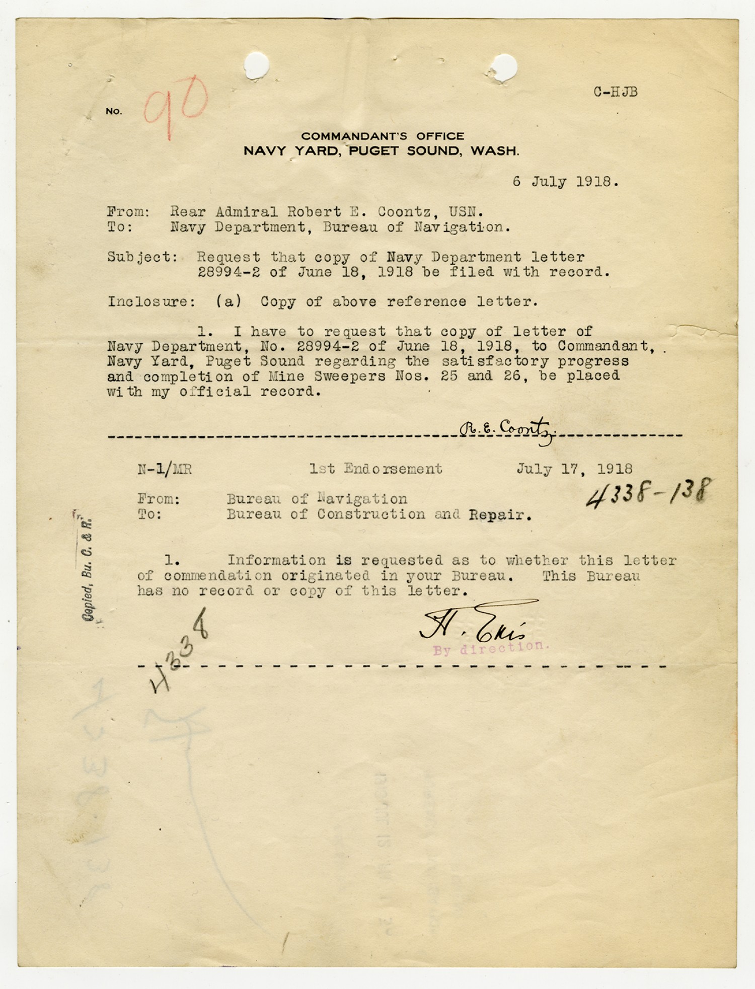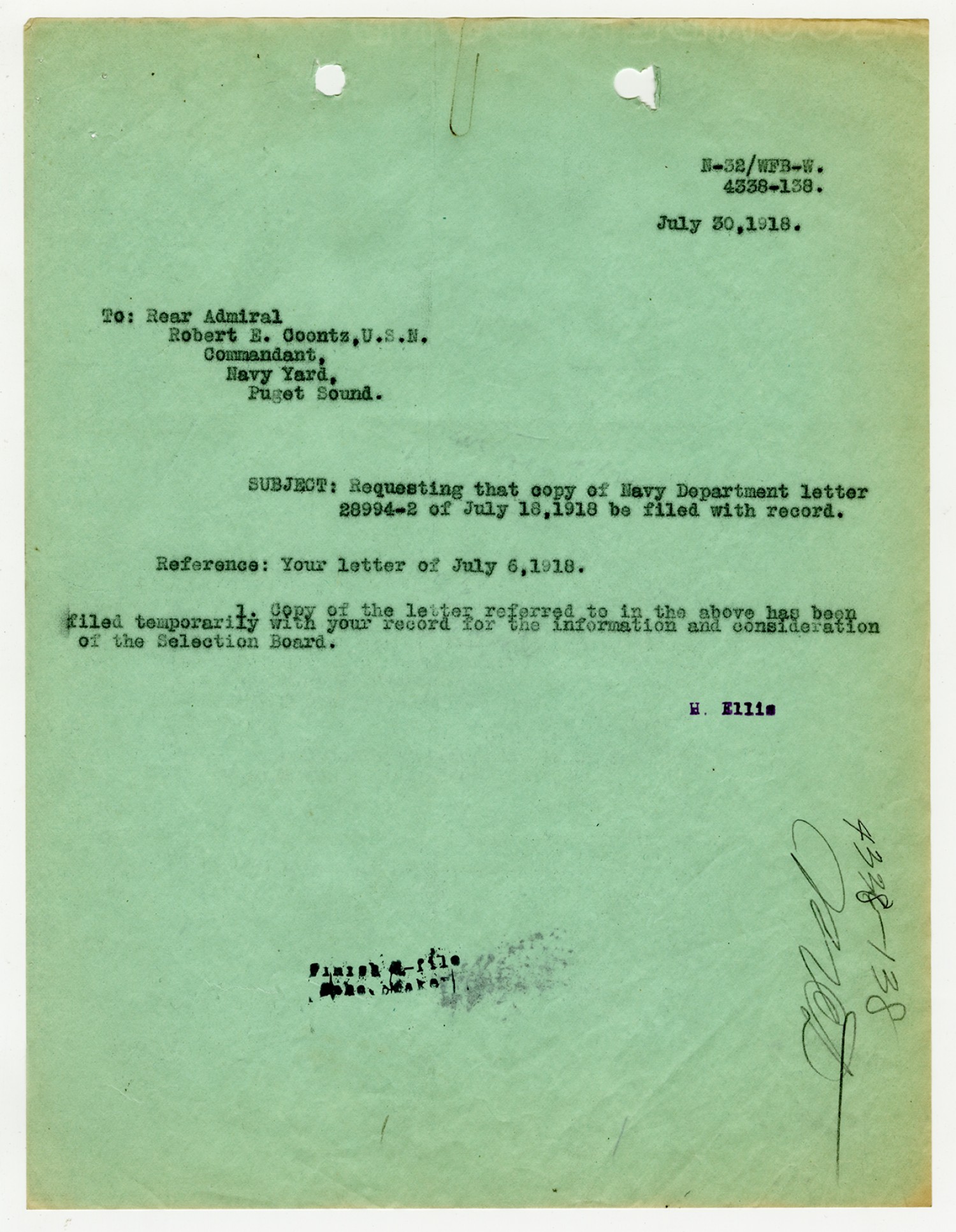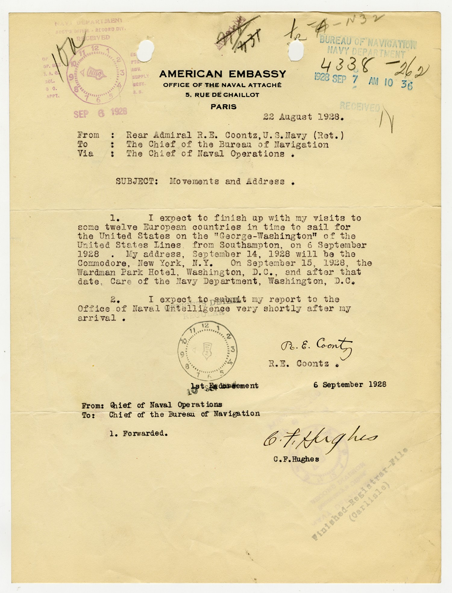 Robert E. Coontz letter to the Bureau of Navigation - September 20, 1928