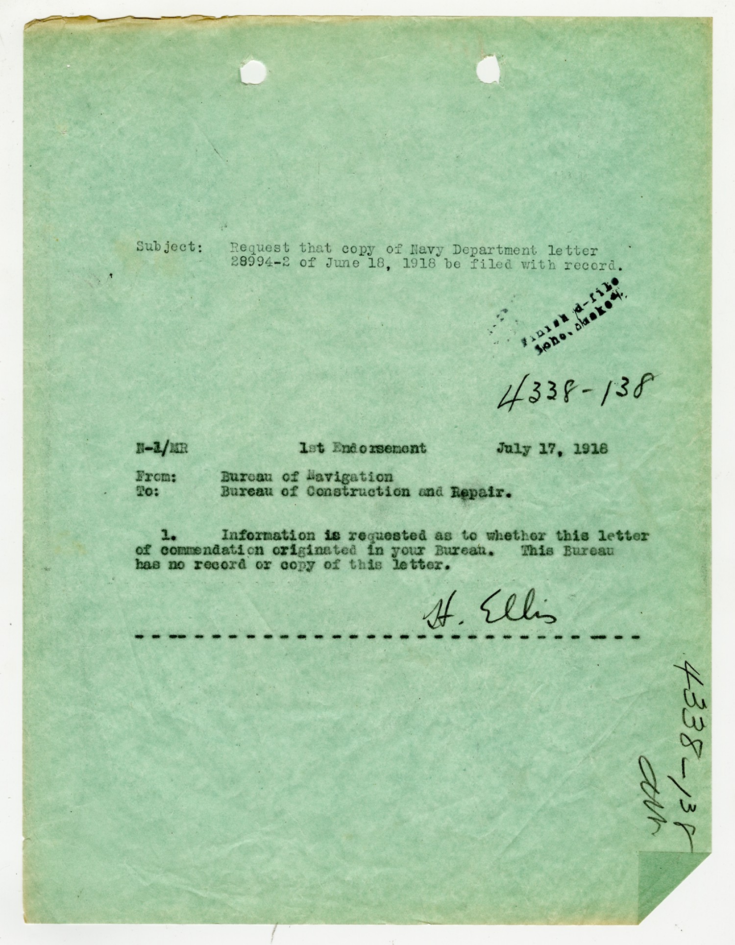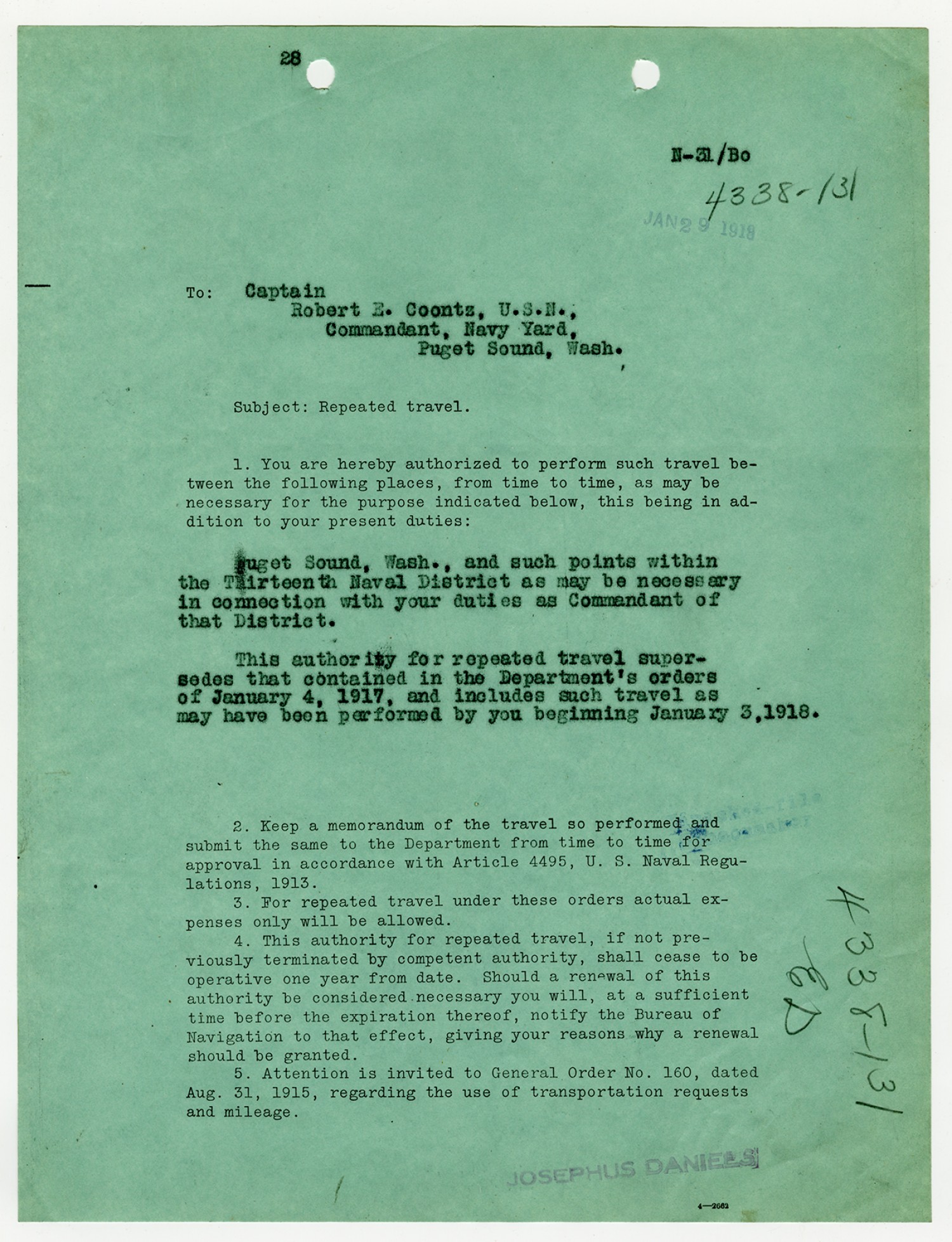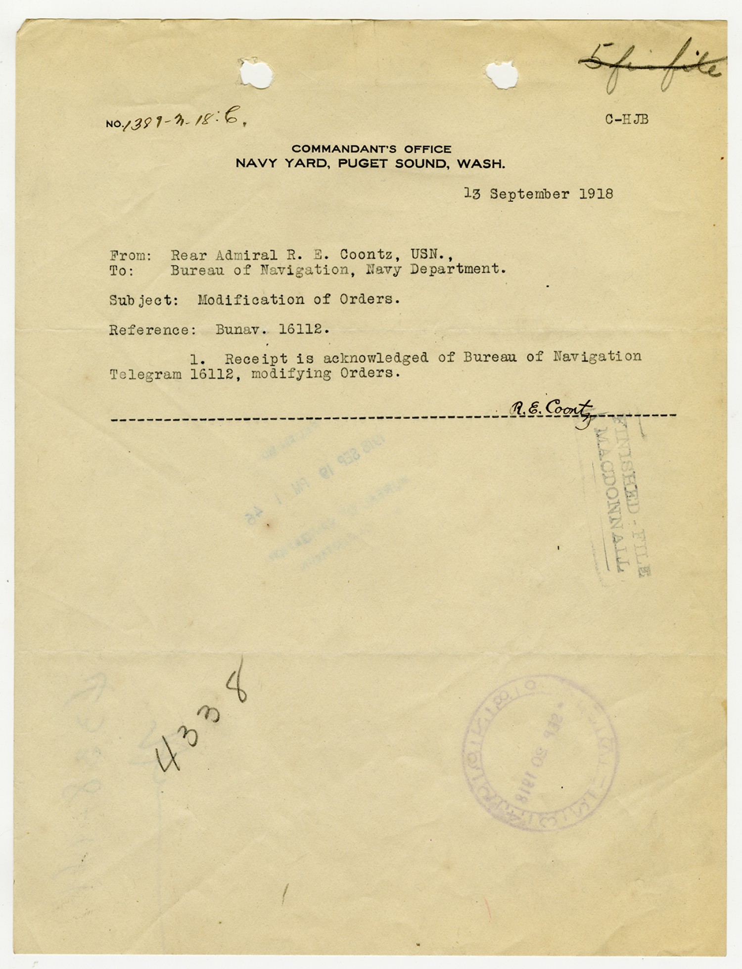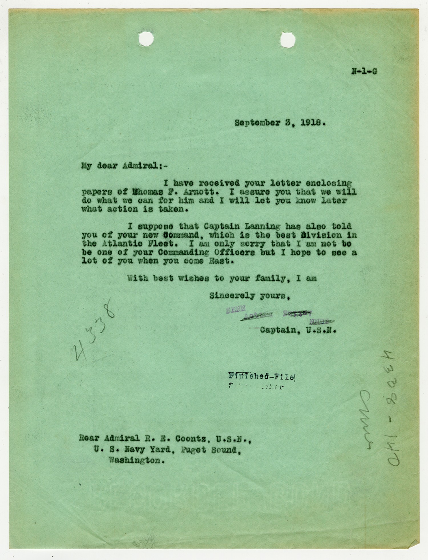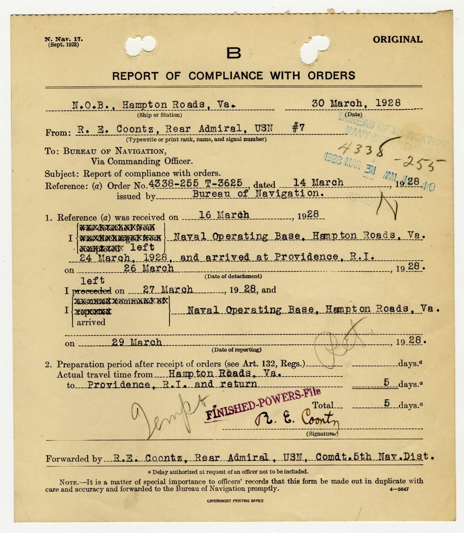 Robert E. Coontz letter to the Bureau of Navigation - September 20, 1928