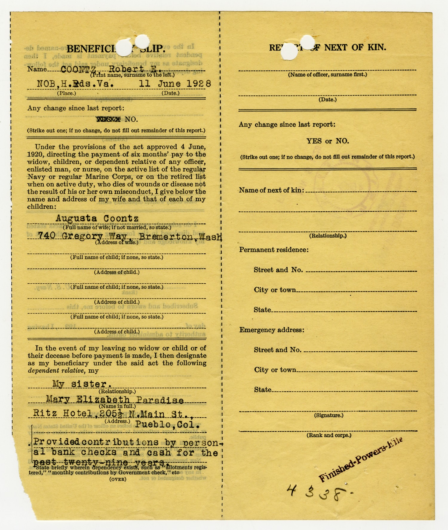 Robert E. Coontz Benificiary Slip - June 11, 1928