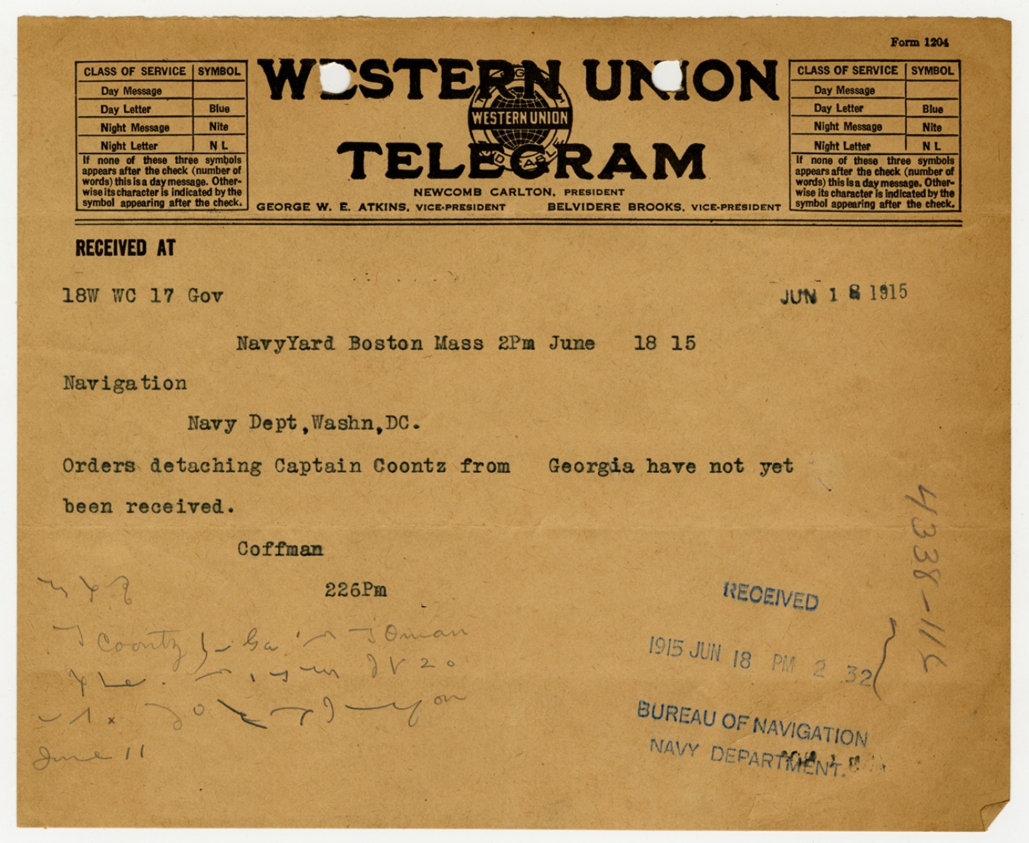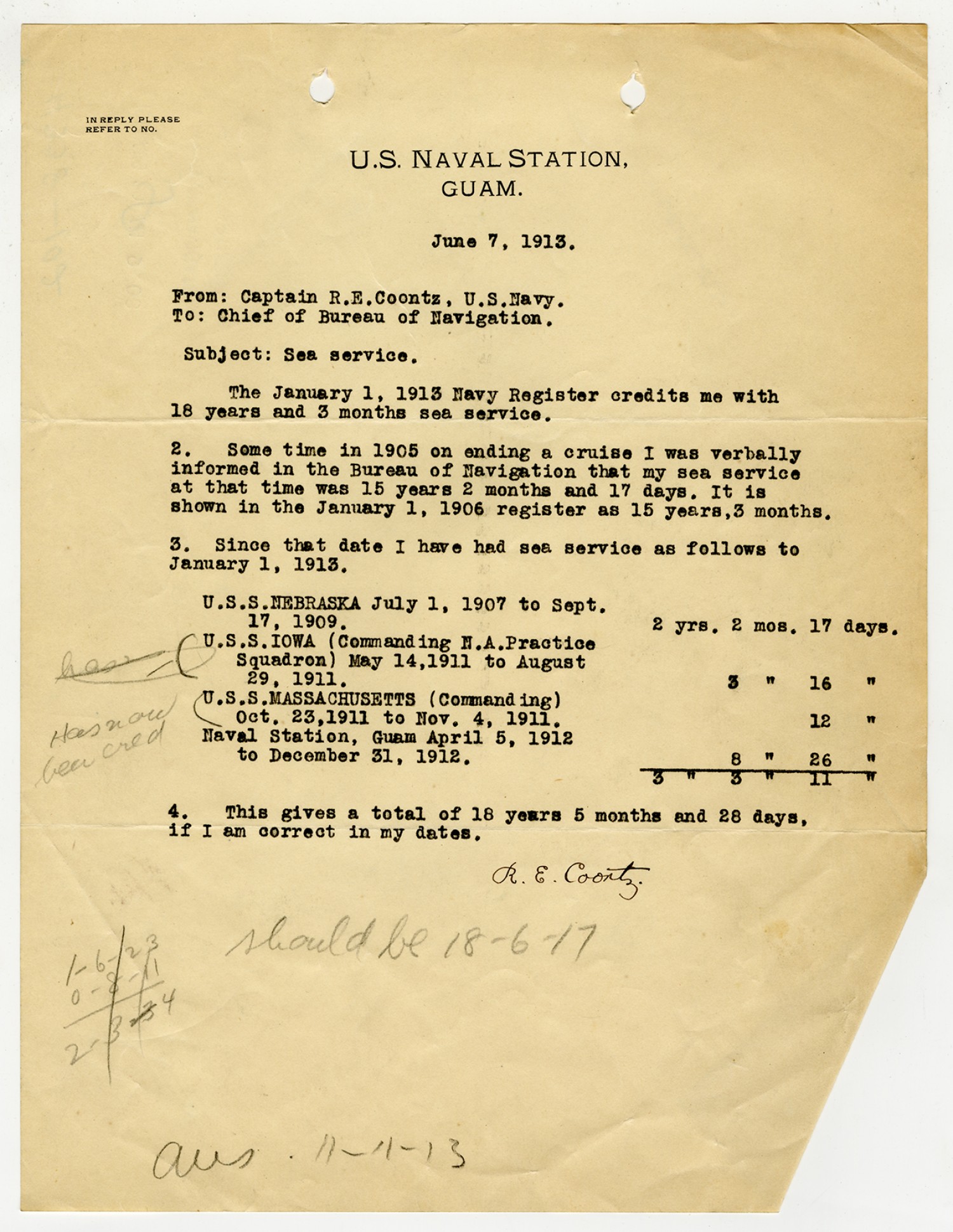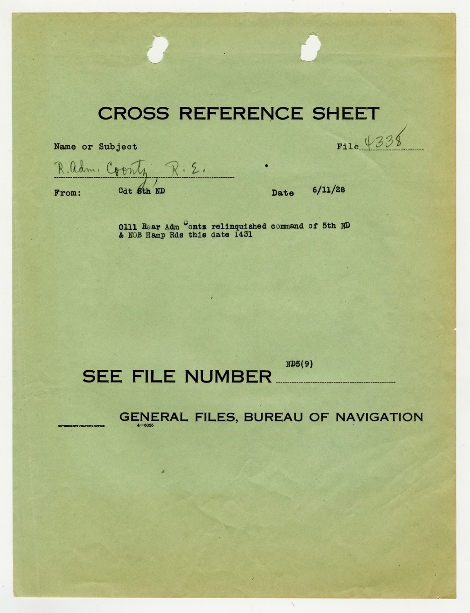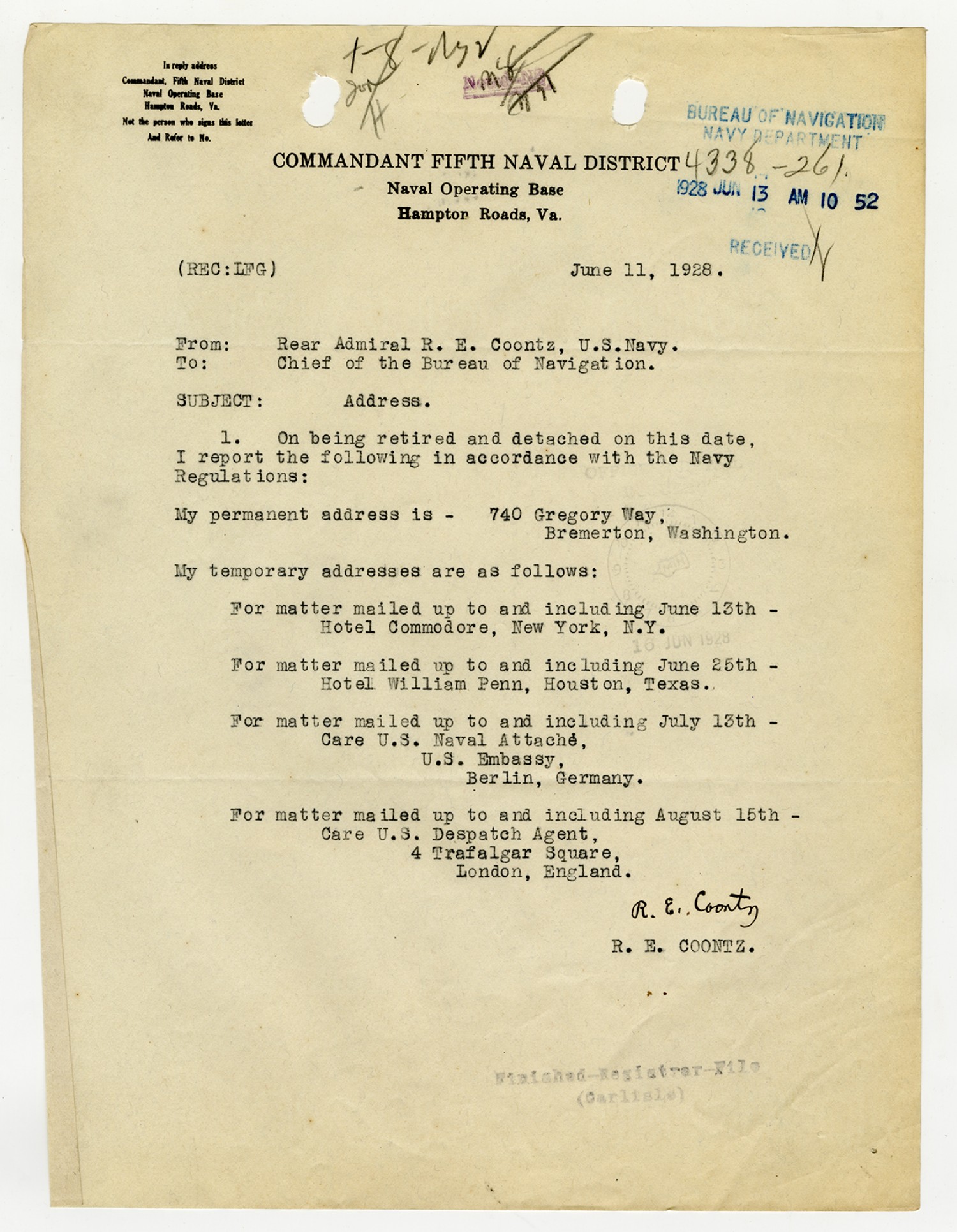 Robert E. Coontz letter to the Chief of the Bureau of Navigation - June 11, 1928