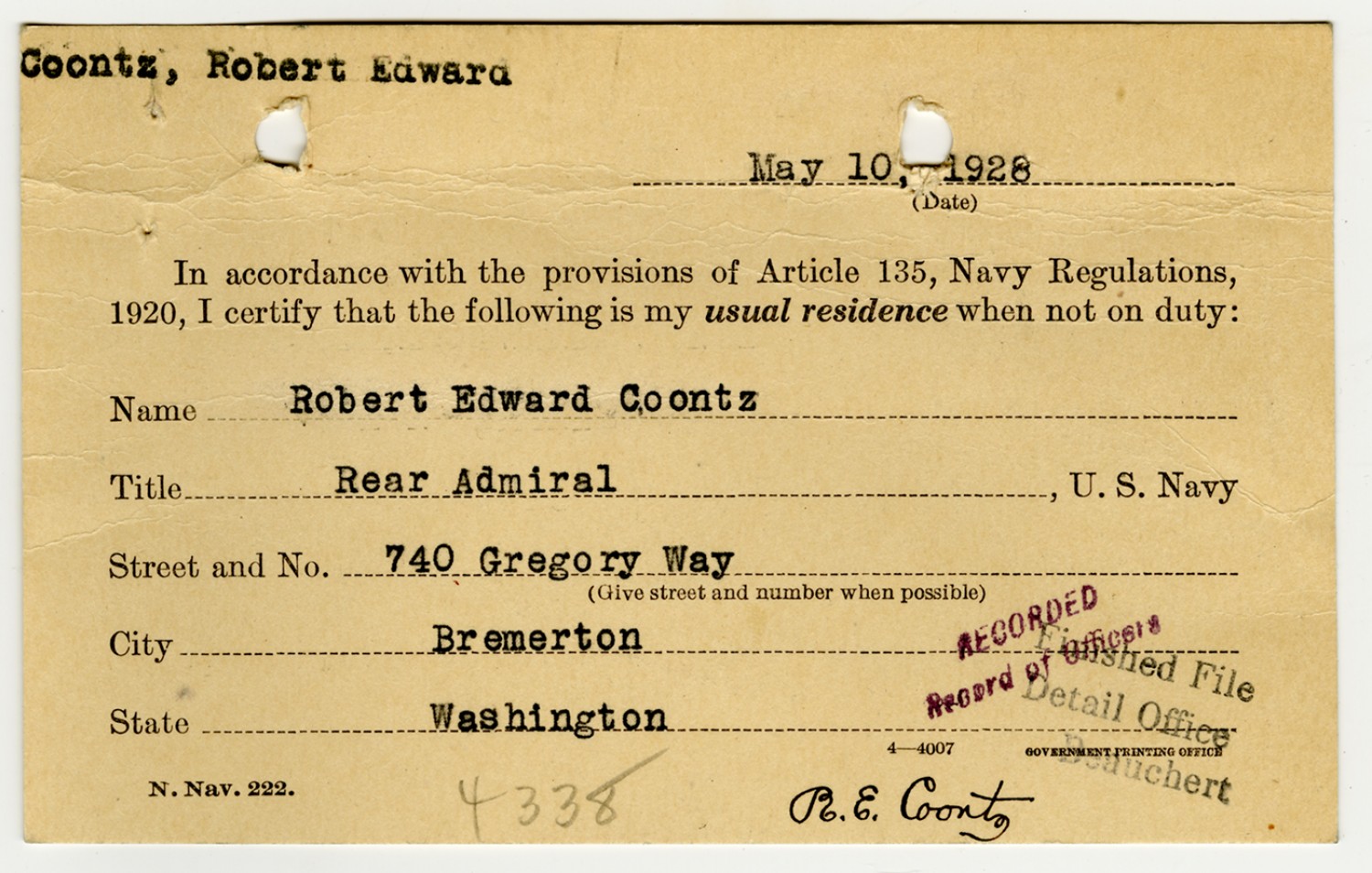 Robert E. Coontz Residence Card - May 10, 1928
