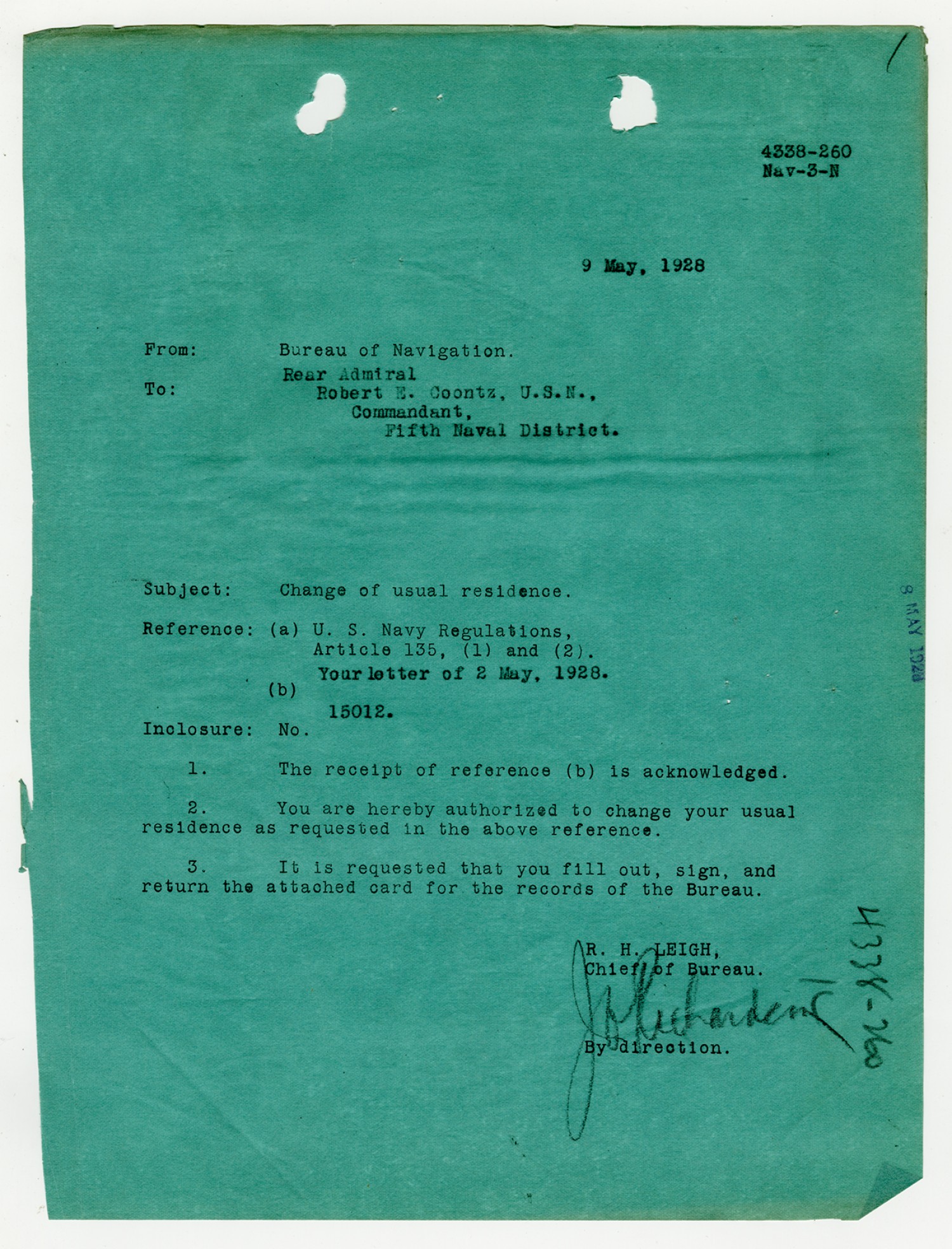 Robert E. Coontz letter to the Chief of the Bureau of Navigation - May 2, 1928
