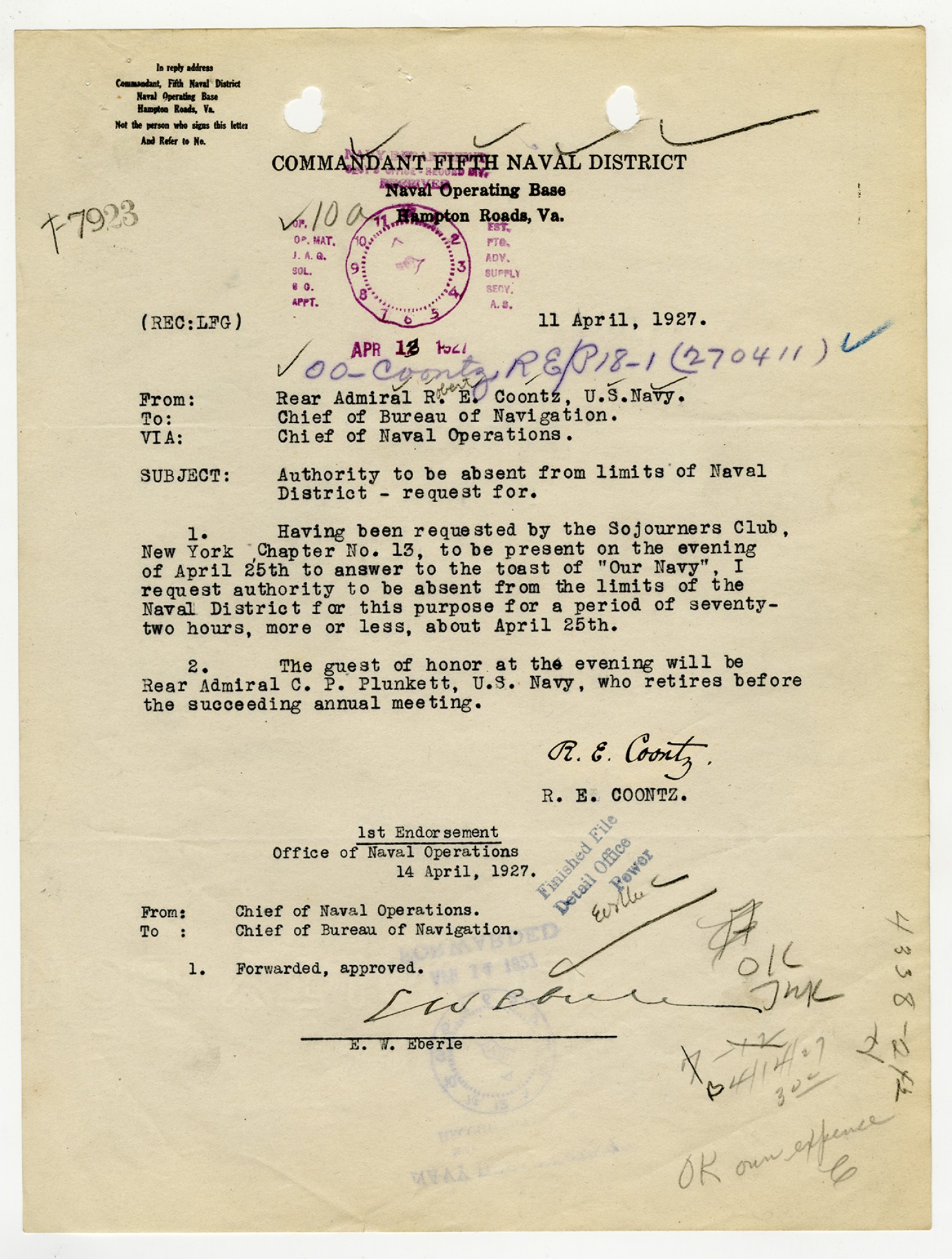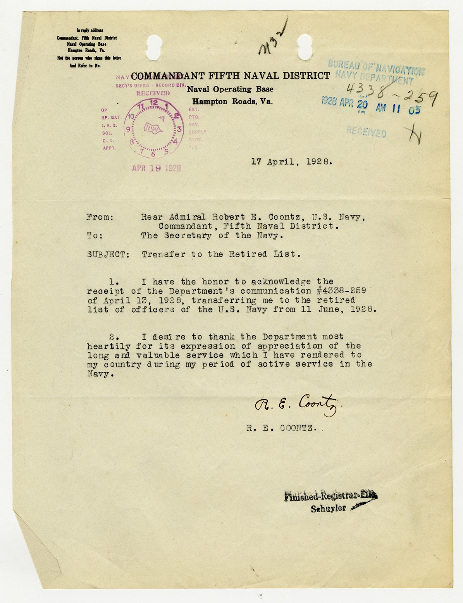 Robert E. Coontz letter to the Secretary of the Navy - April 17, 1928