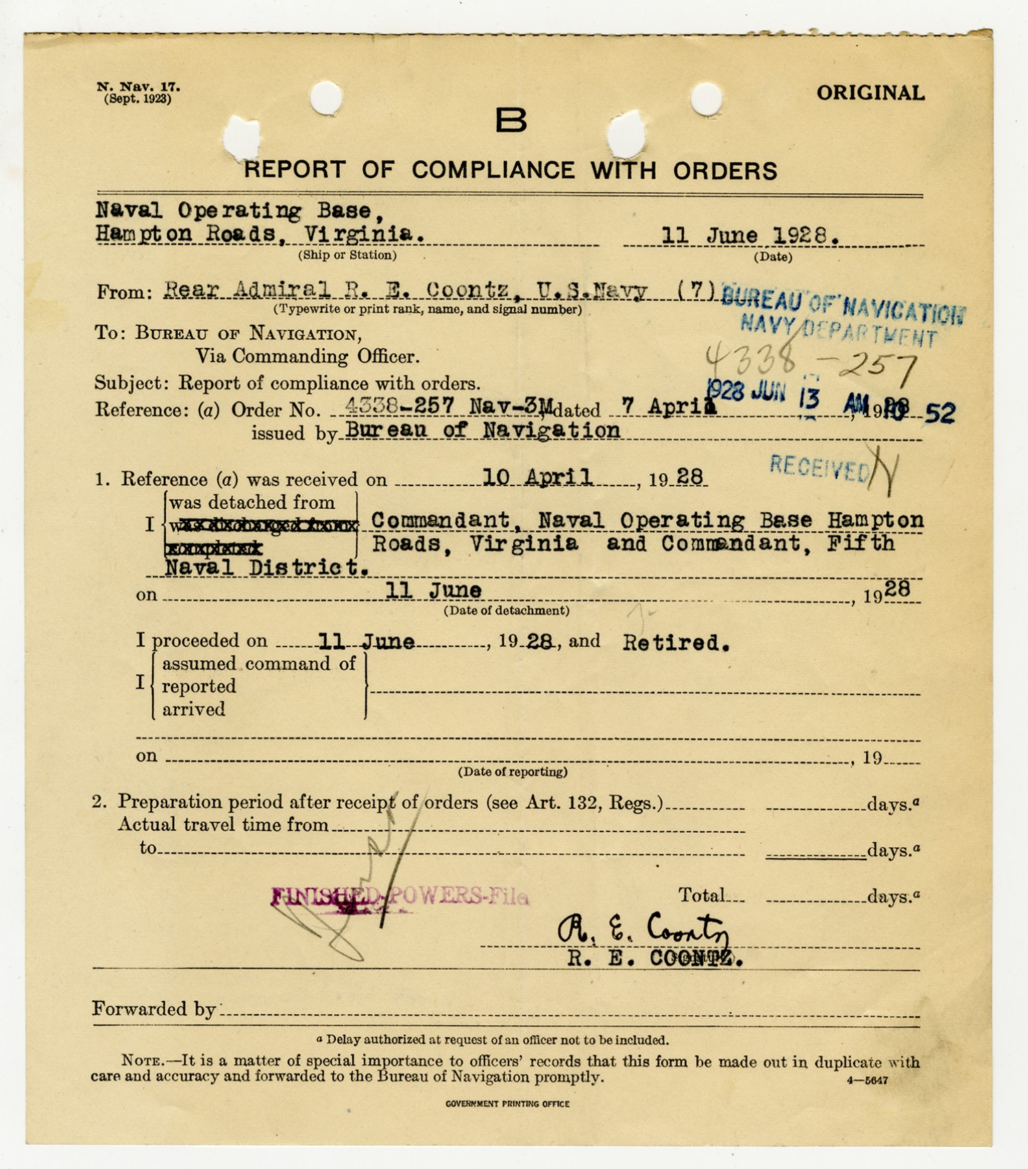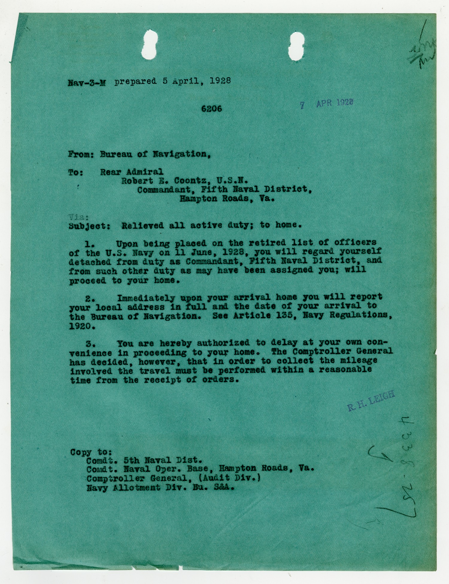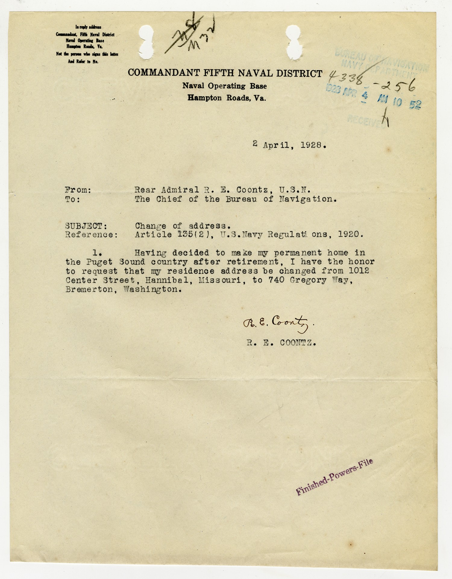 Bureau of Navigation letter to Robert E. Coontz - April 11, 1928
