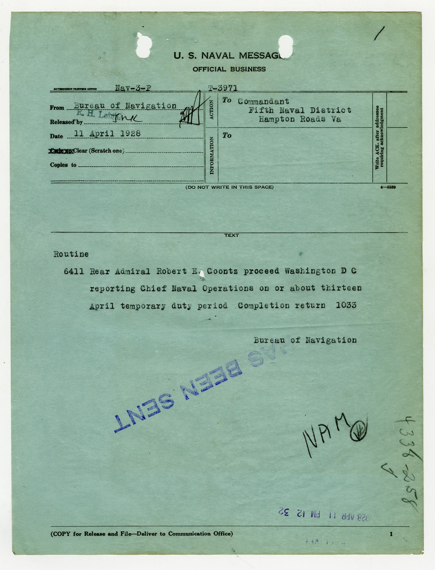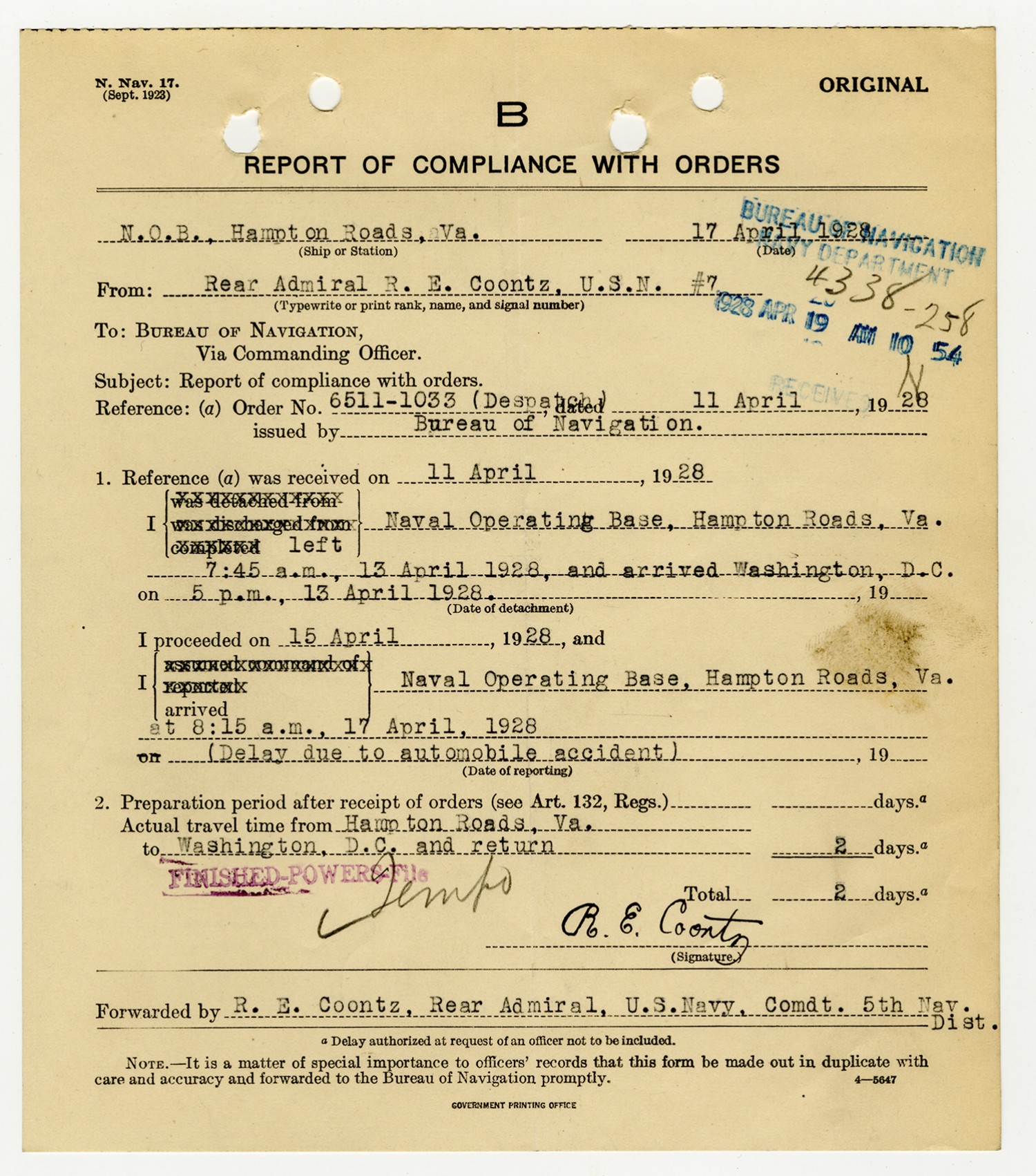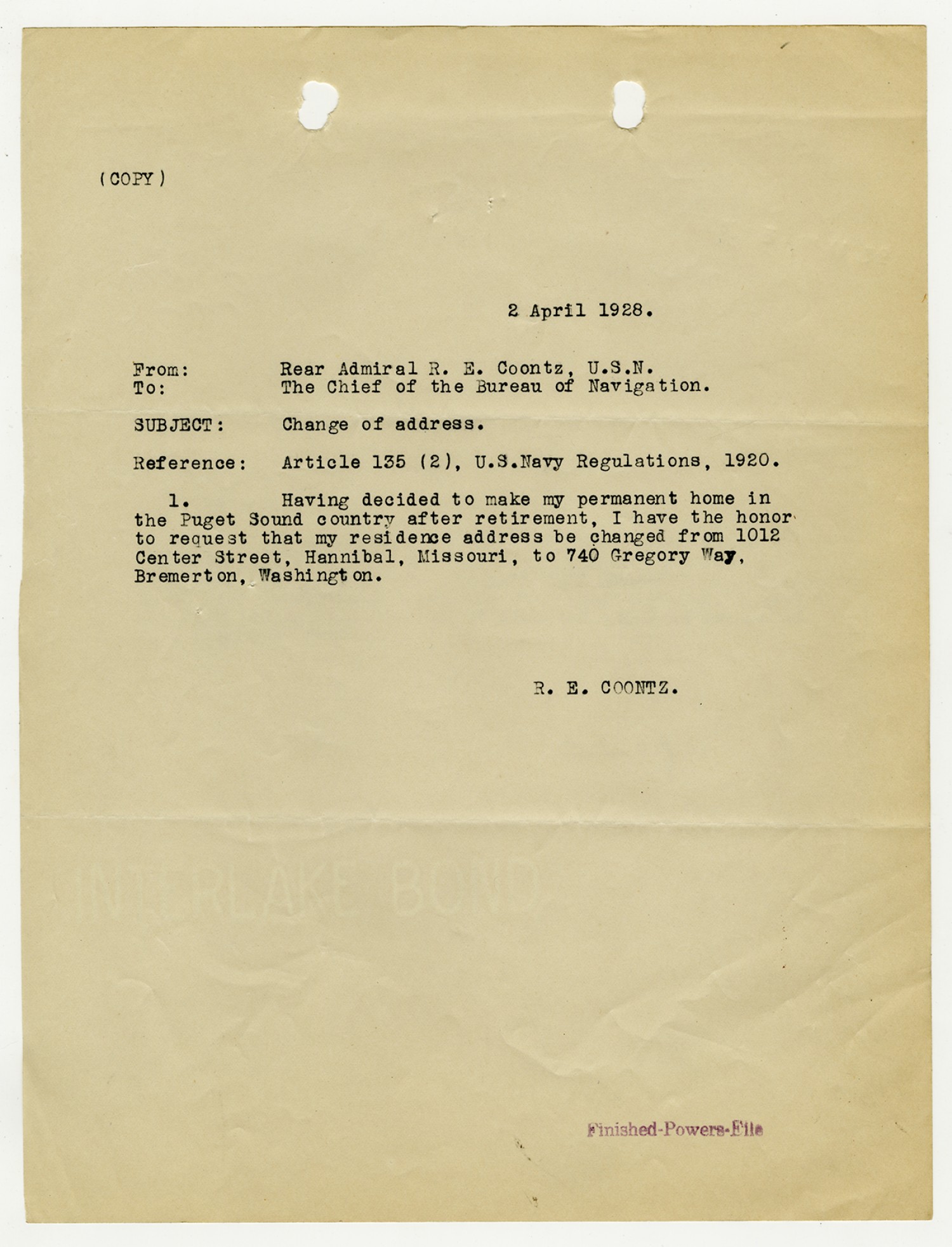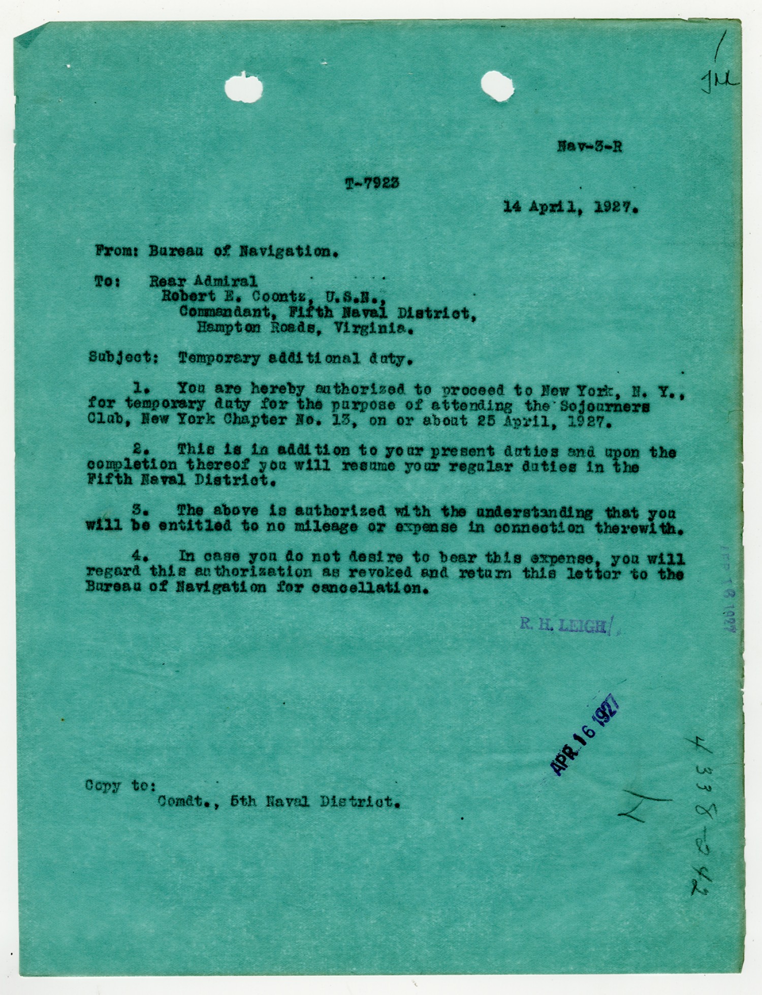 Bureau of Navigation letter to Robert E. Coontz - April 11, 1928