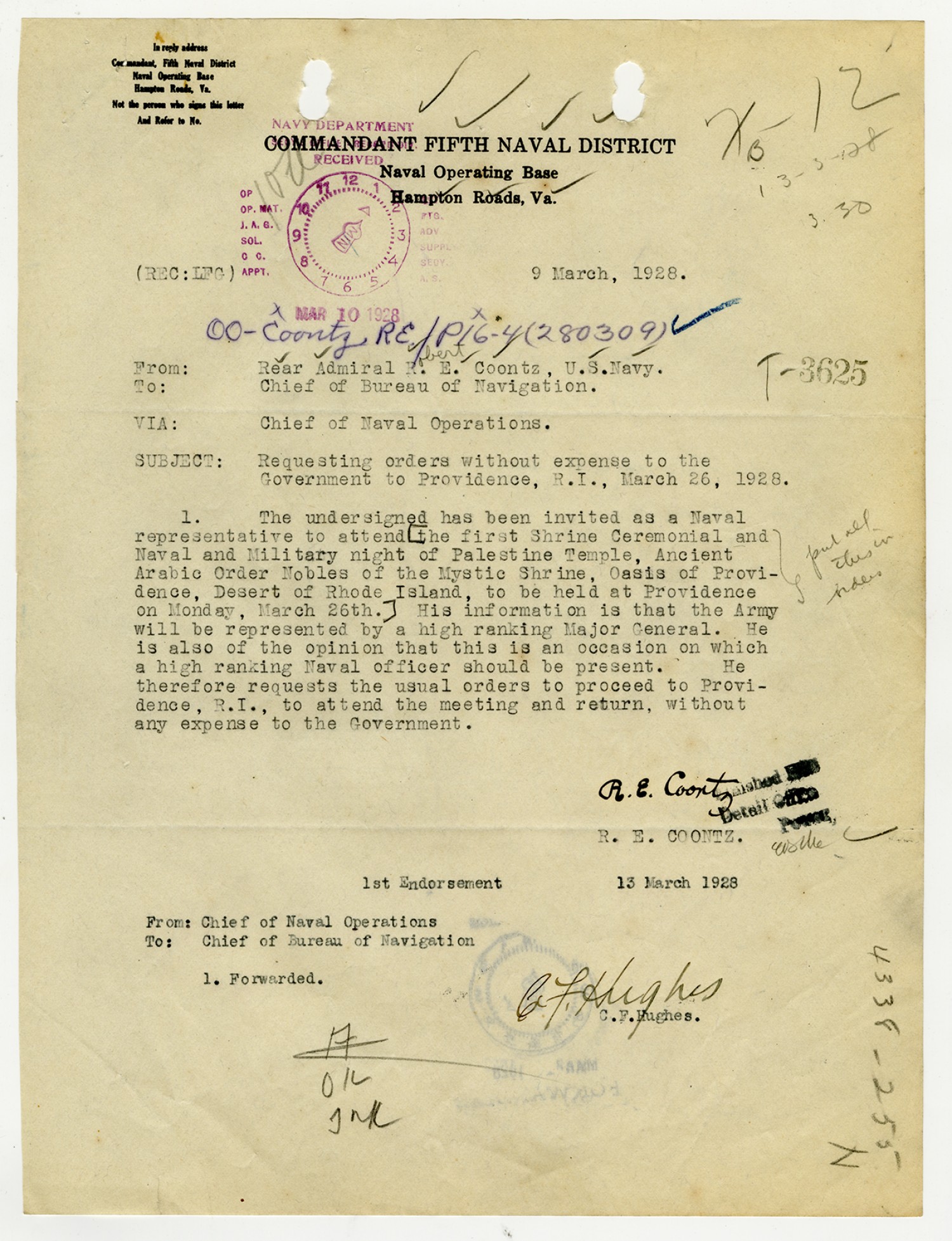 Robert E. Coontz letter to the Chief of the Bureau of Navigation - March 9, 1928