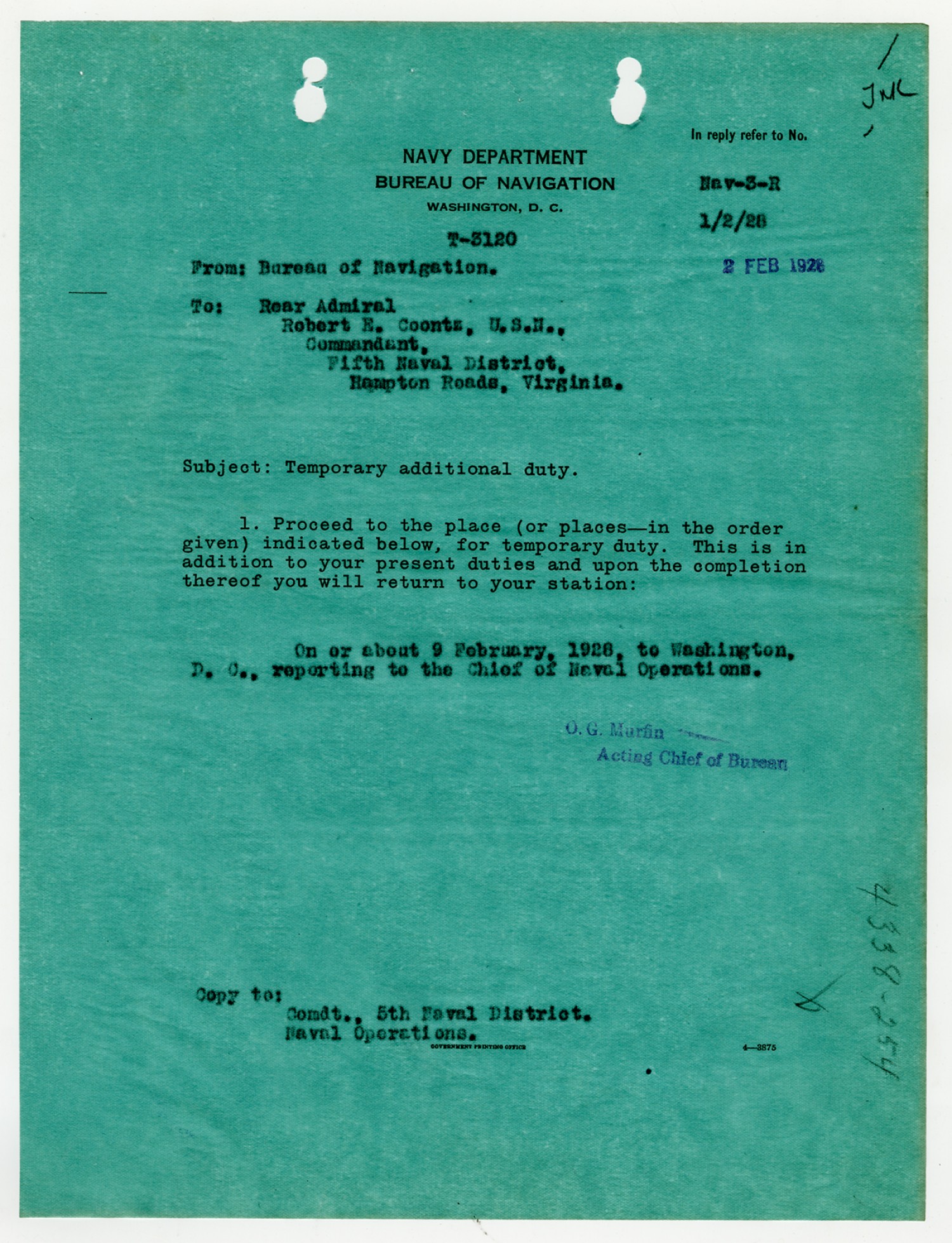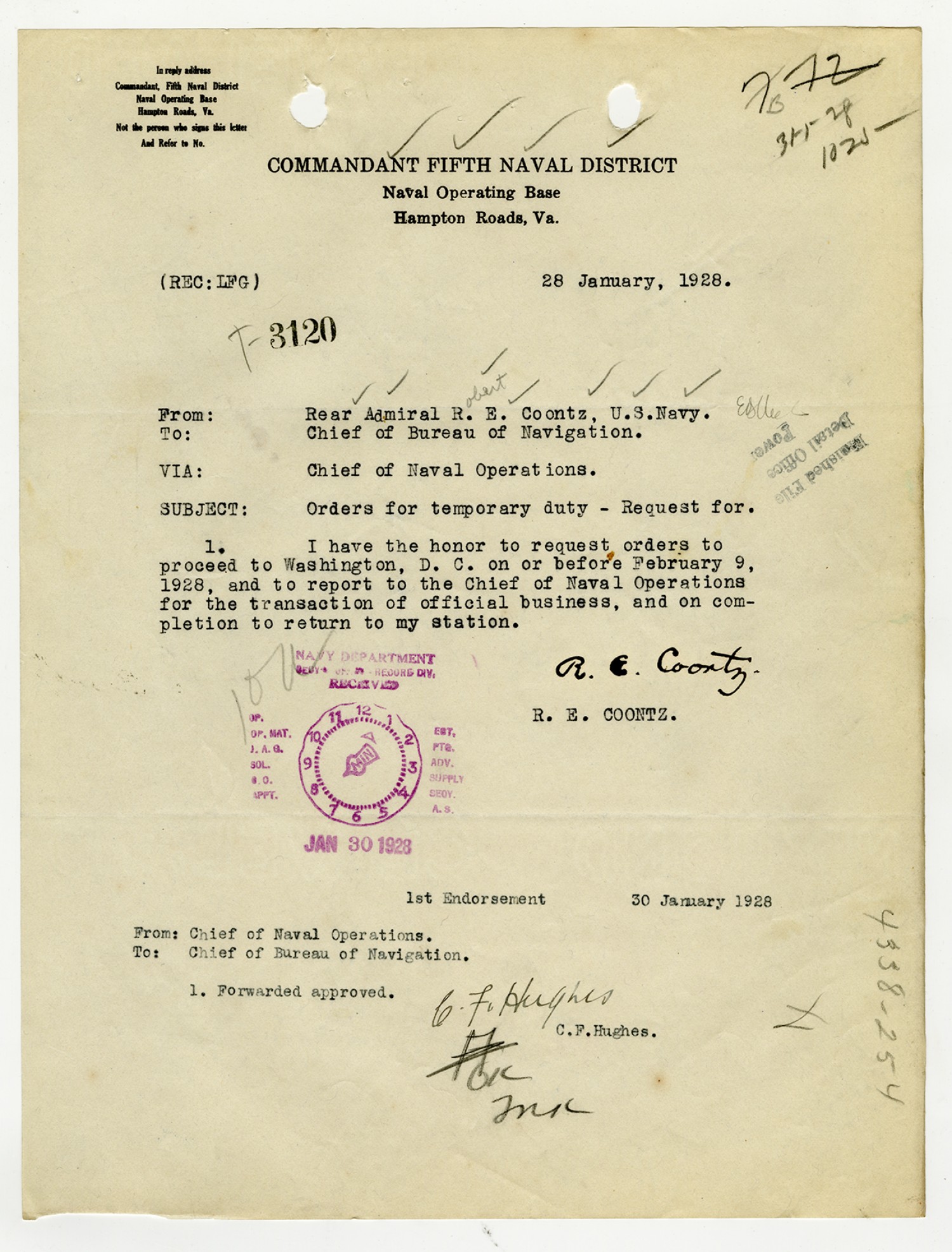 Robert E. Coontz letter to the Chief of the Bureau of Navigation - January 28, 1928