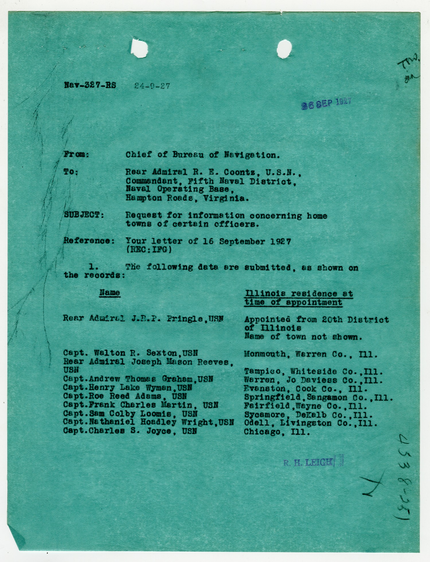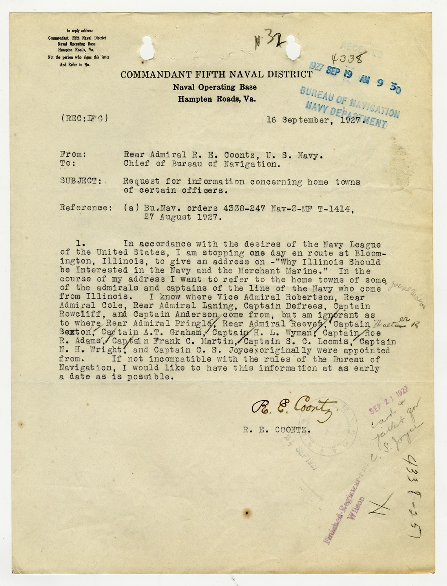 Robert E. Coontz letter to the Chief of the Bureau of Navigation - September 16, 1927