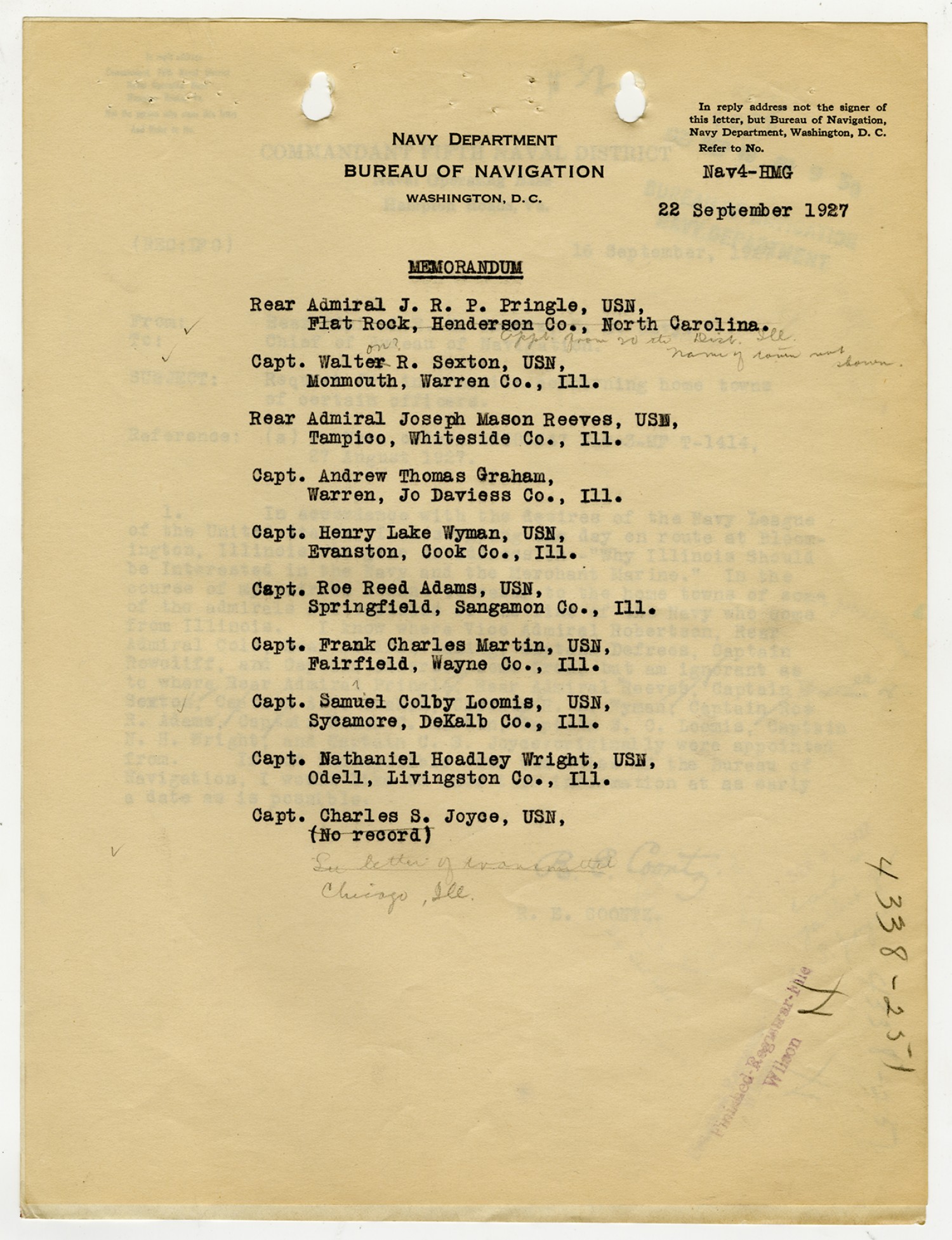 Memorandum for Chief of Bureau of Navigation - March 22, 1927