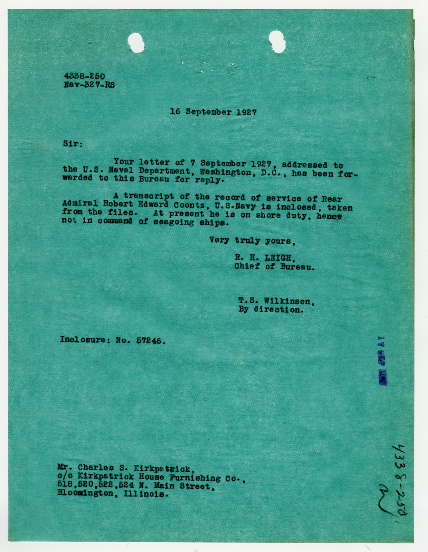 T.S. Wilkinson letter to Charles S. Kirkpatrick - September 16, 1927