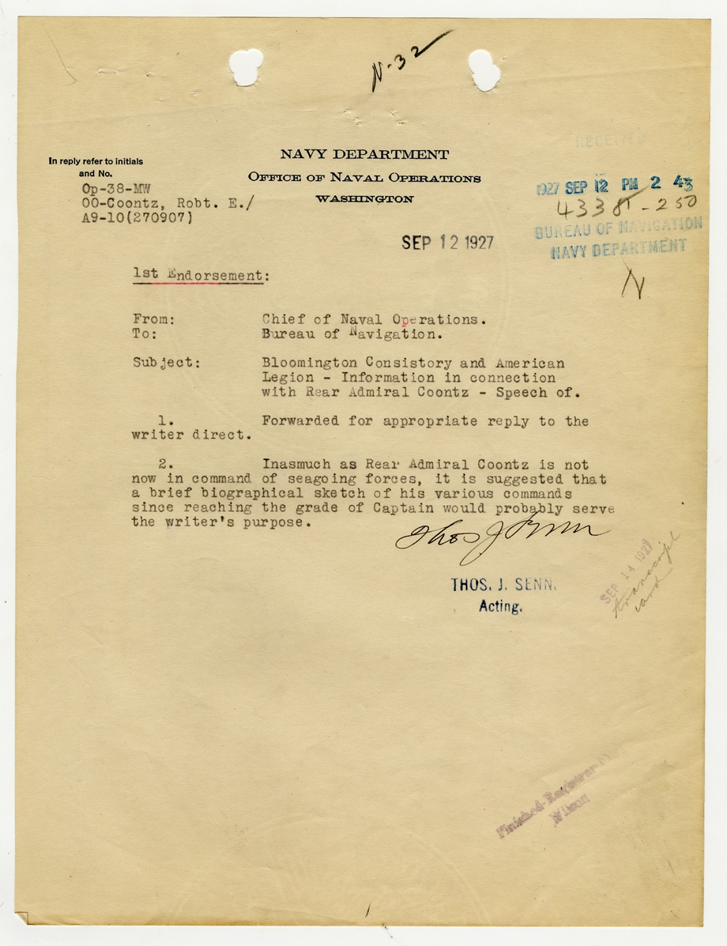 Chief of the Bureau of Navigation letter to Robert E. Coontz - September 16, 1927