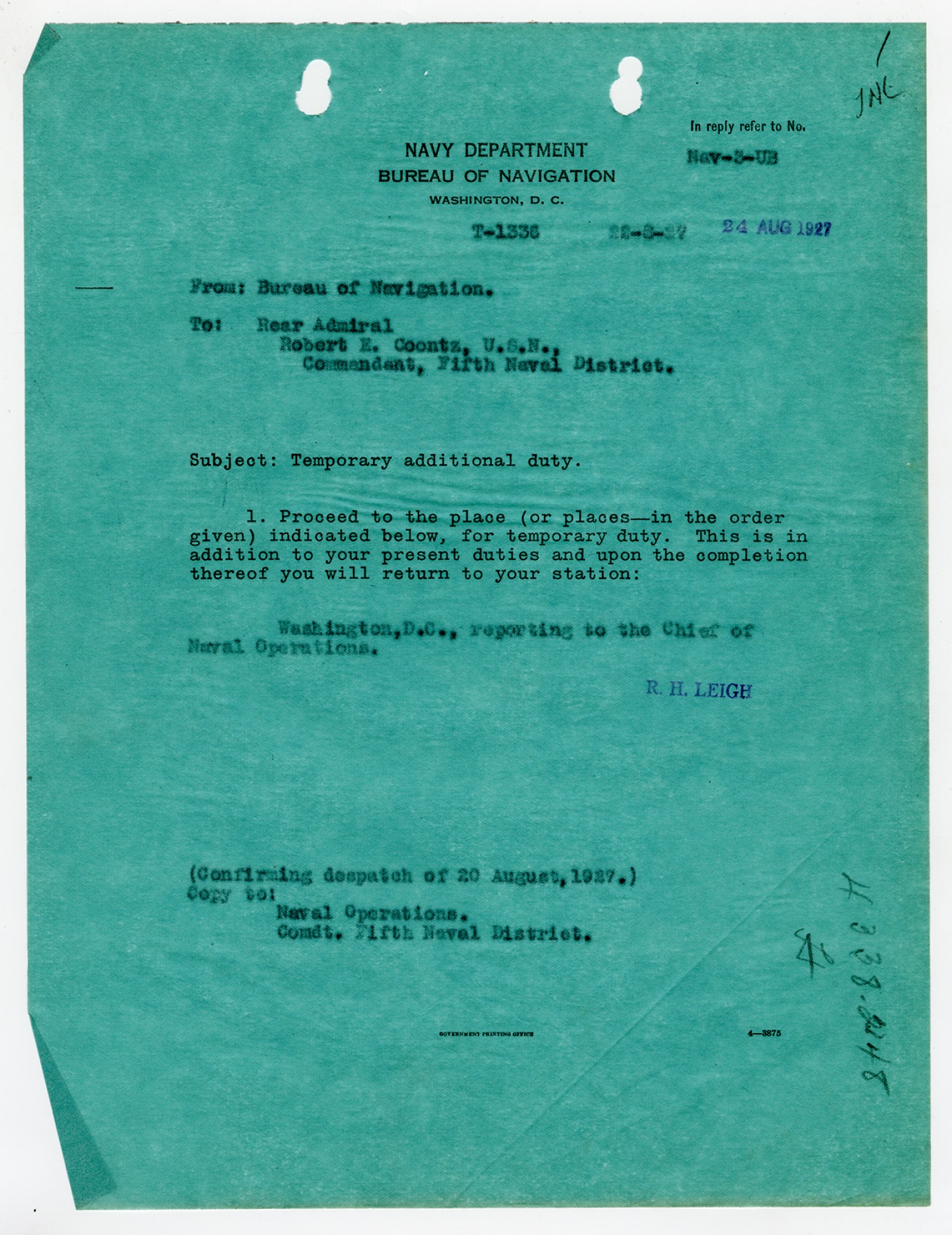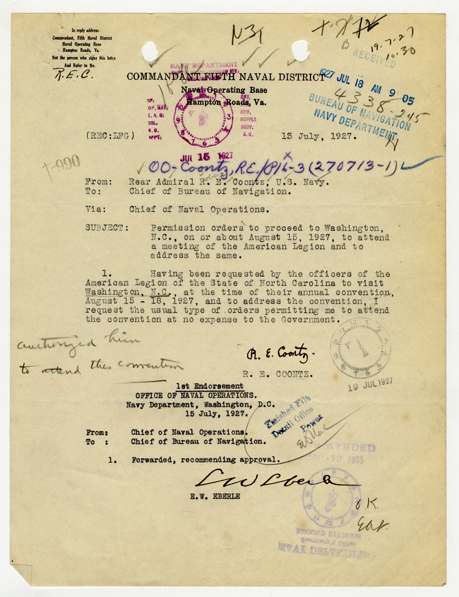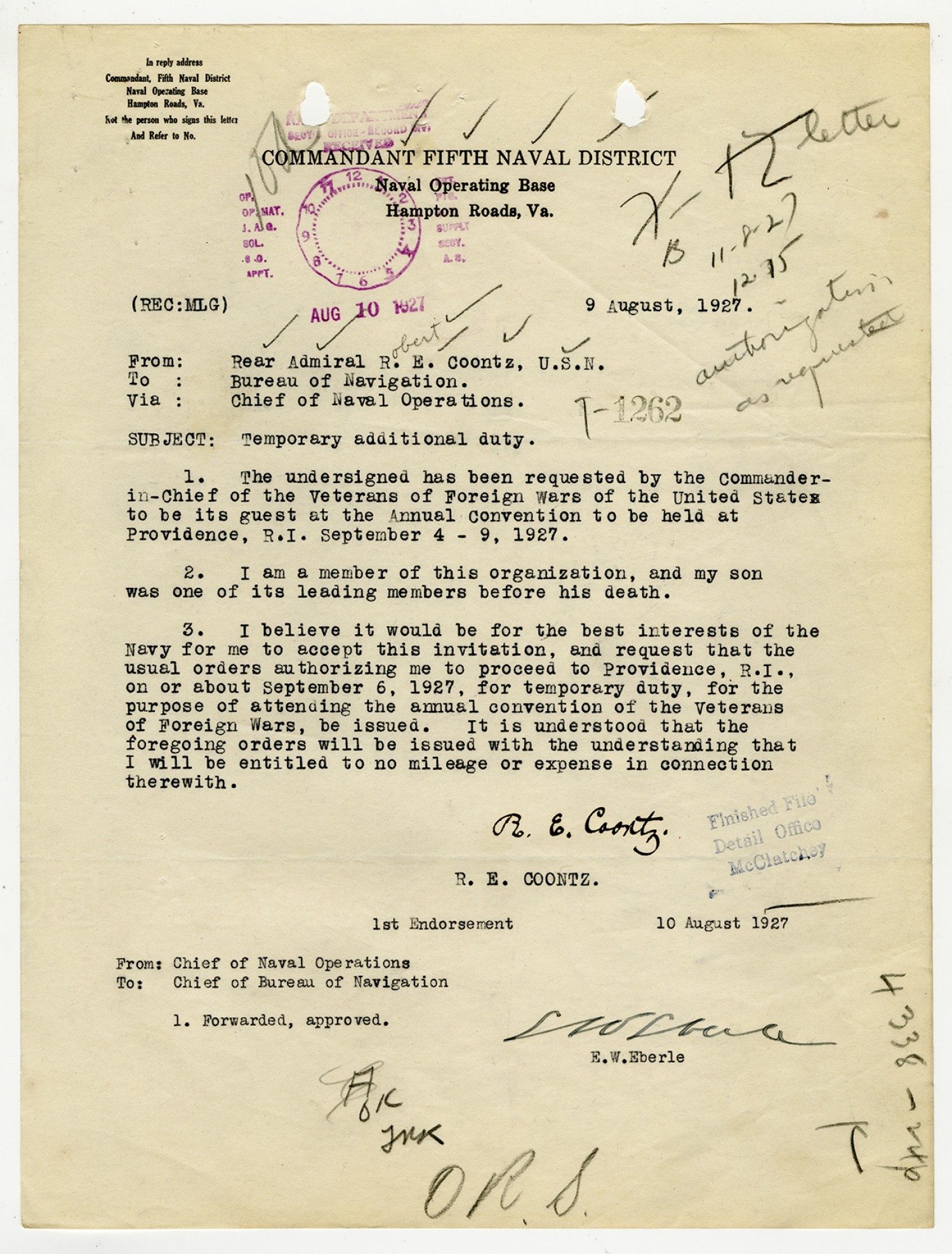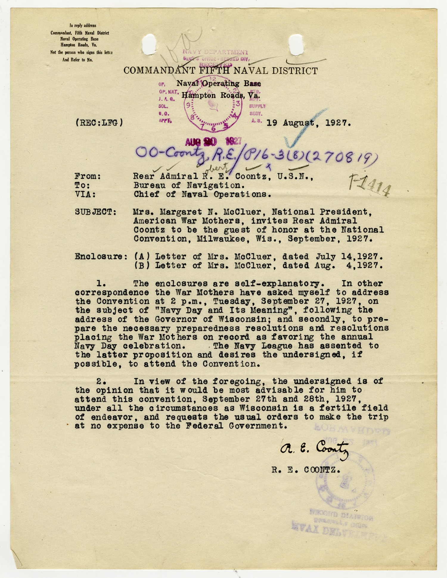 Robert E. Coontz letter to the Bureau of Navigation - August 19, 1927