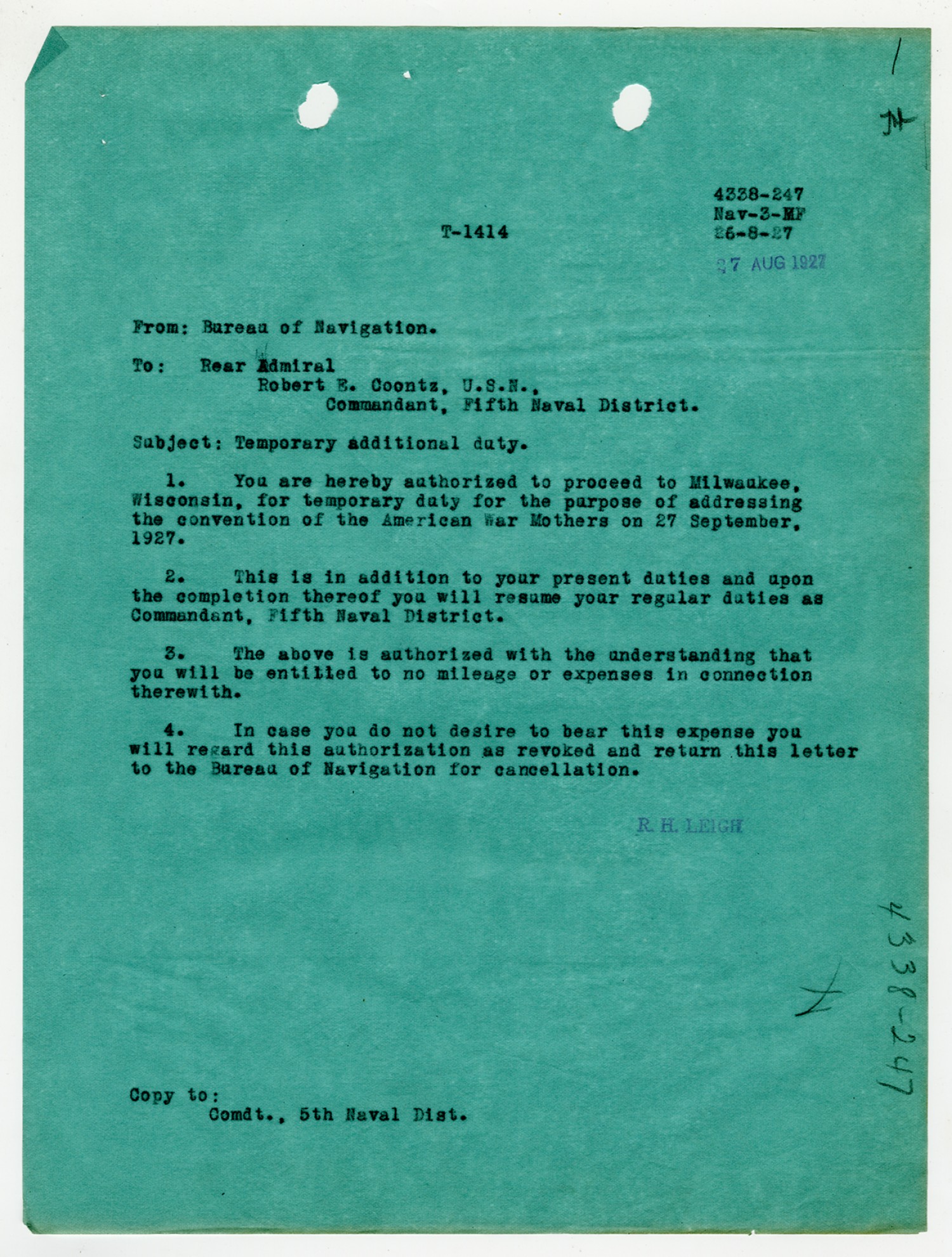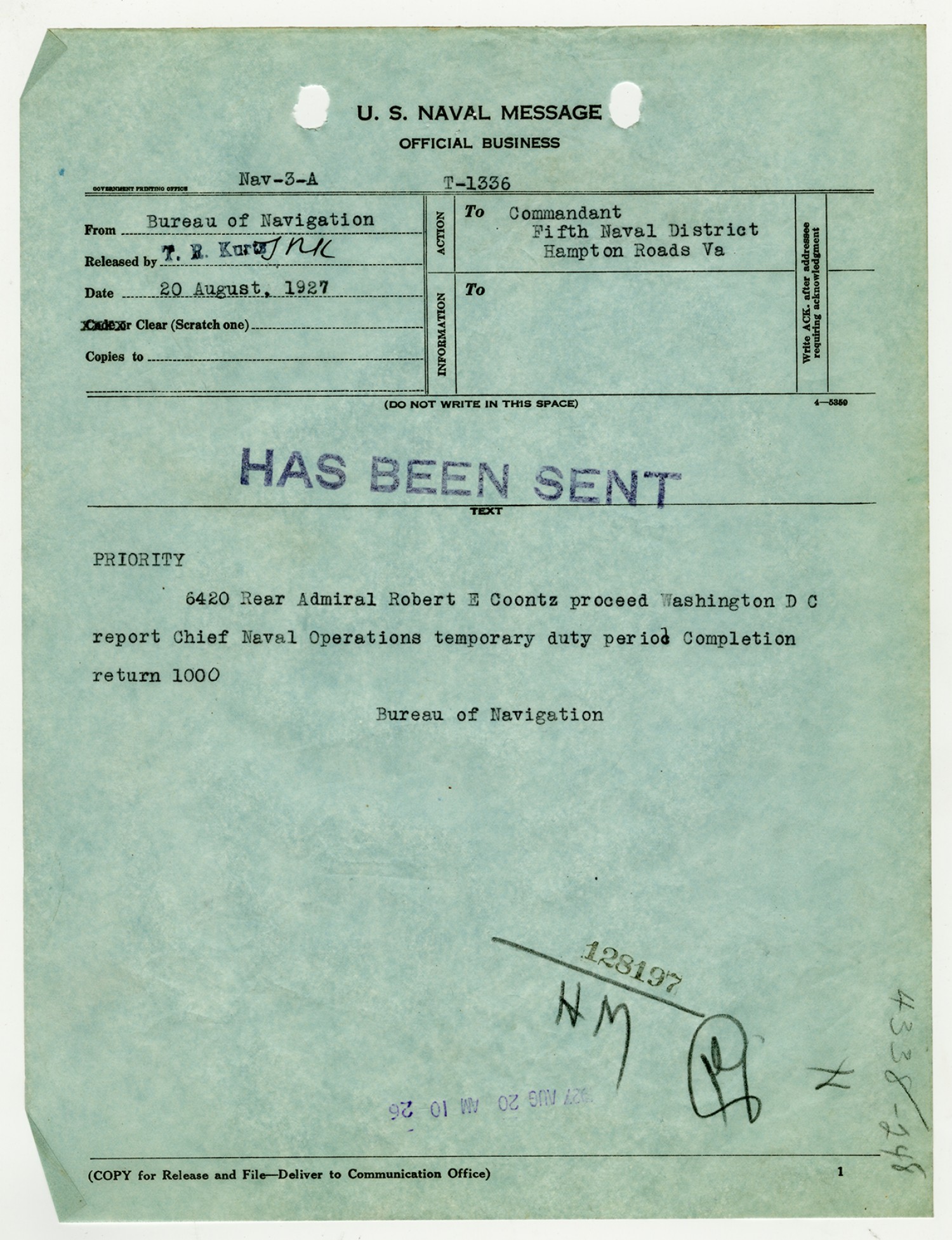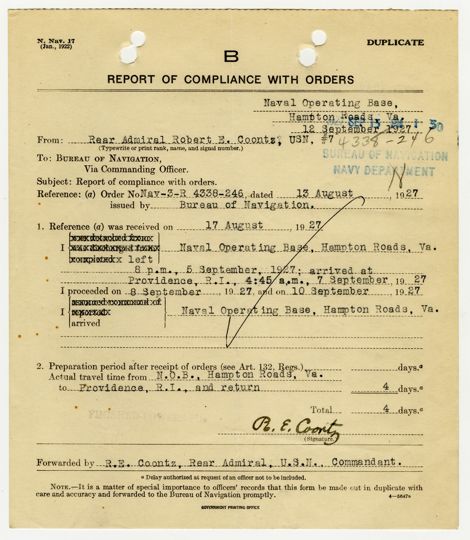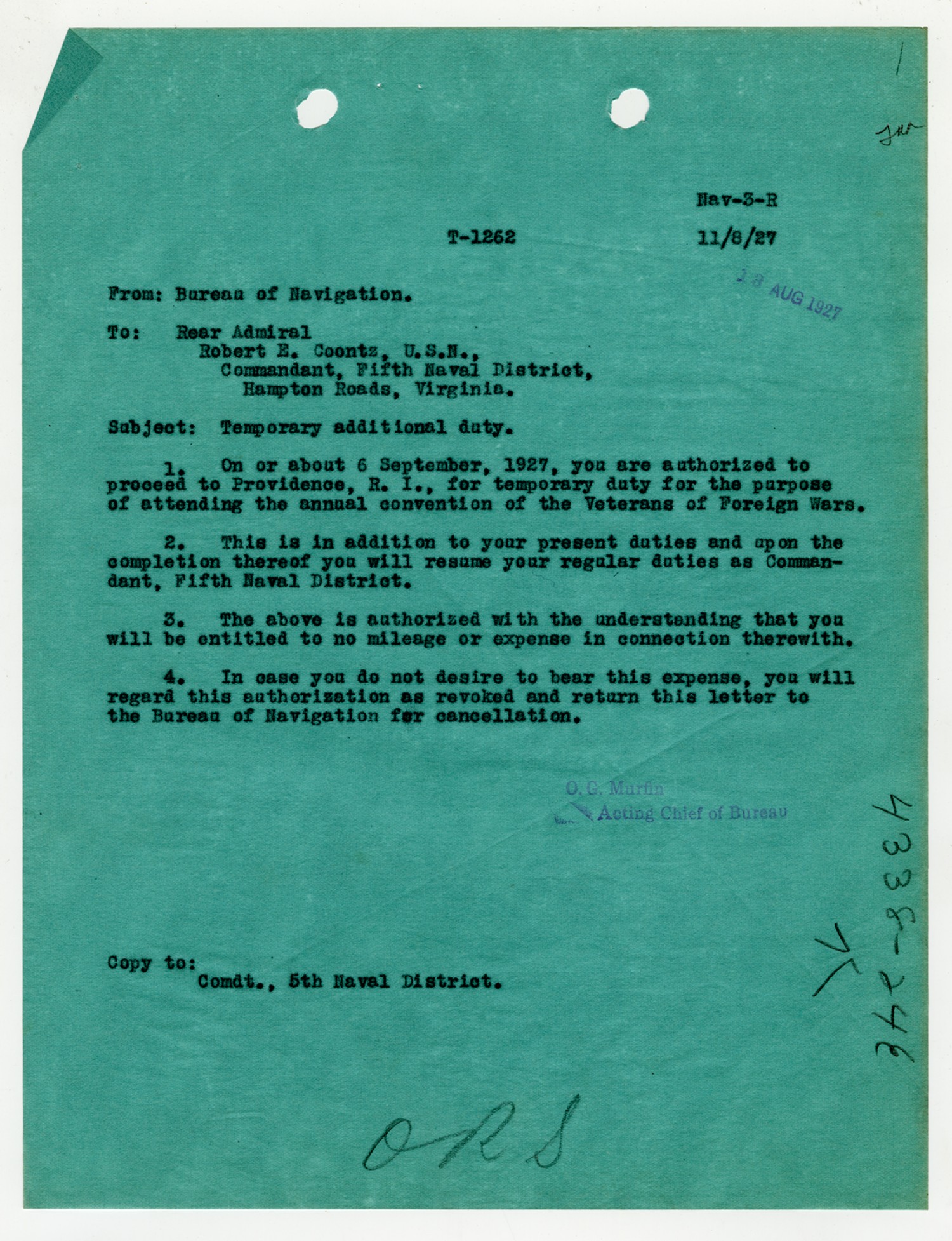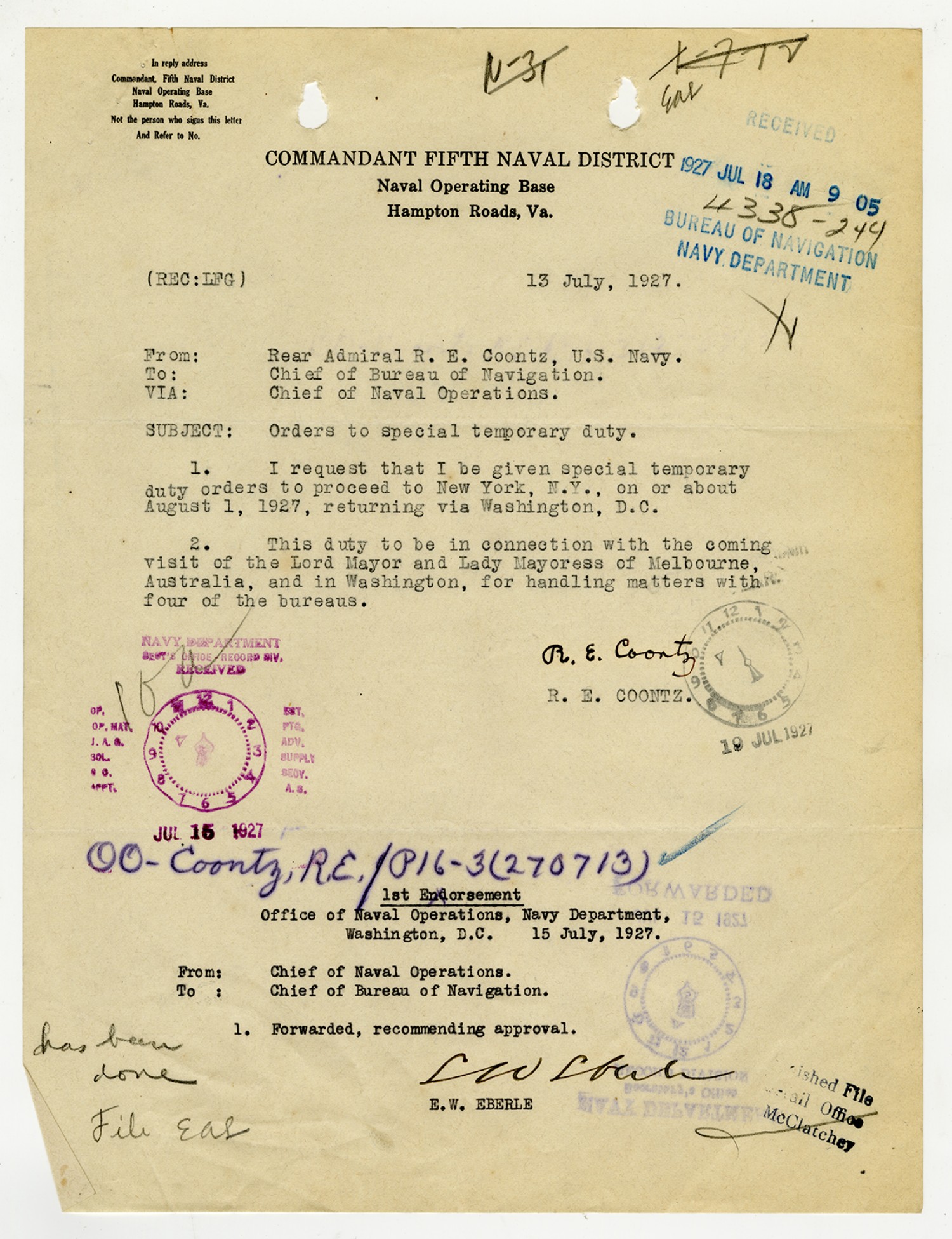 Robert E. Coontz letter to the Bureau of Navigation - August 19, 1927