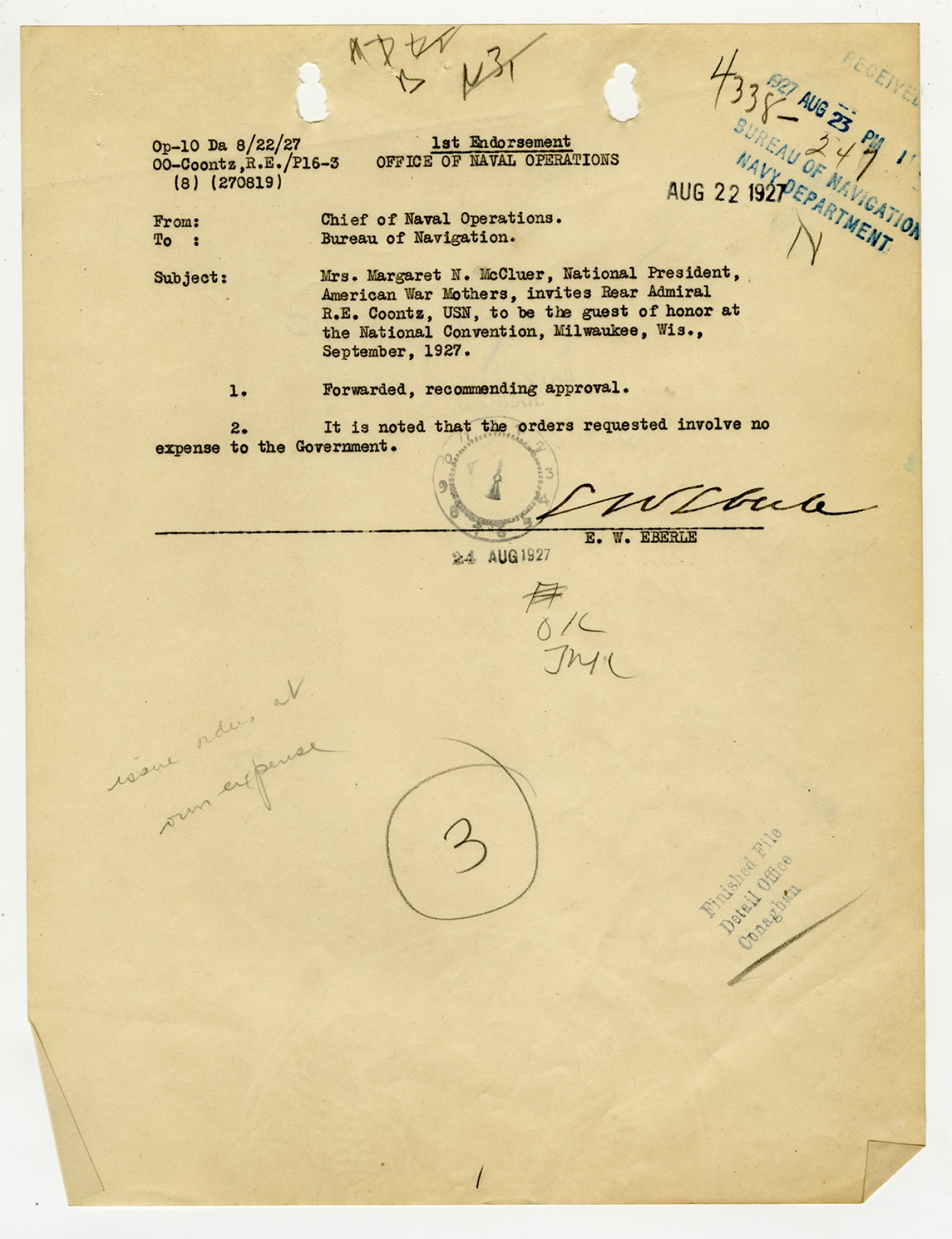 E.W. Eberle letter to the Bureau of Navigation - August 22, 1927