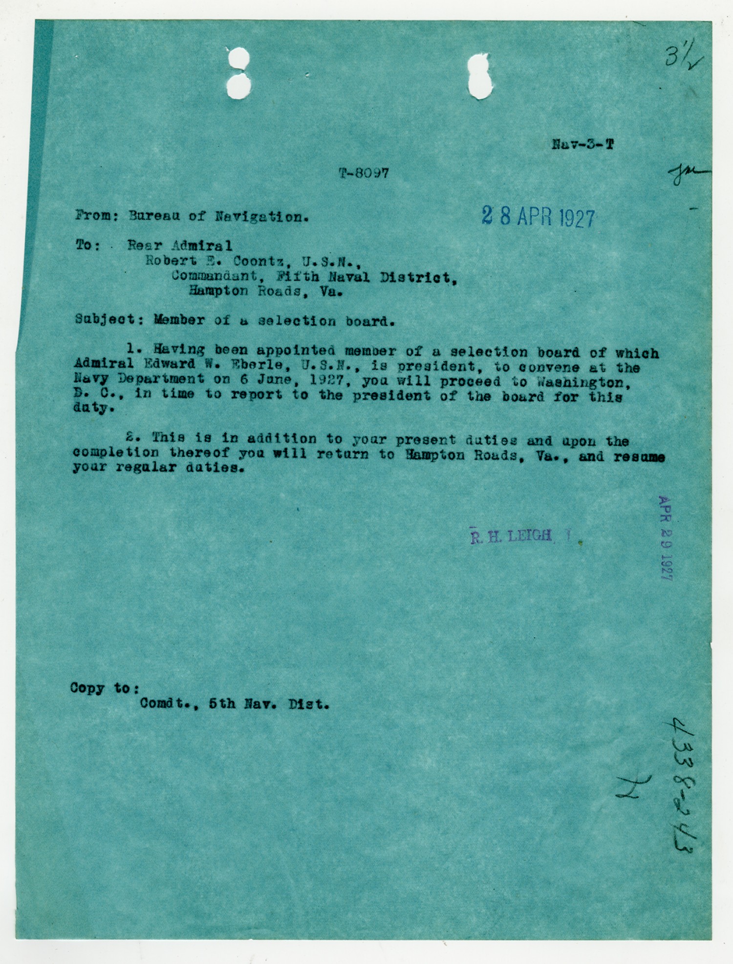 Robert E. Coontz letter to the Chief of the Bureau of Navigation - April 11, 1927