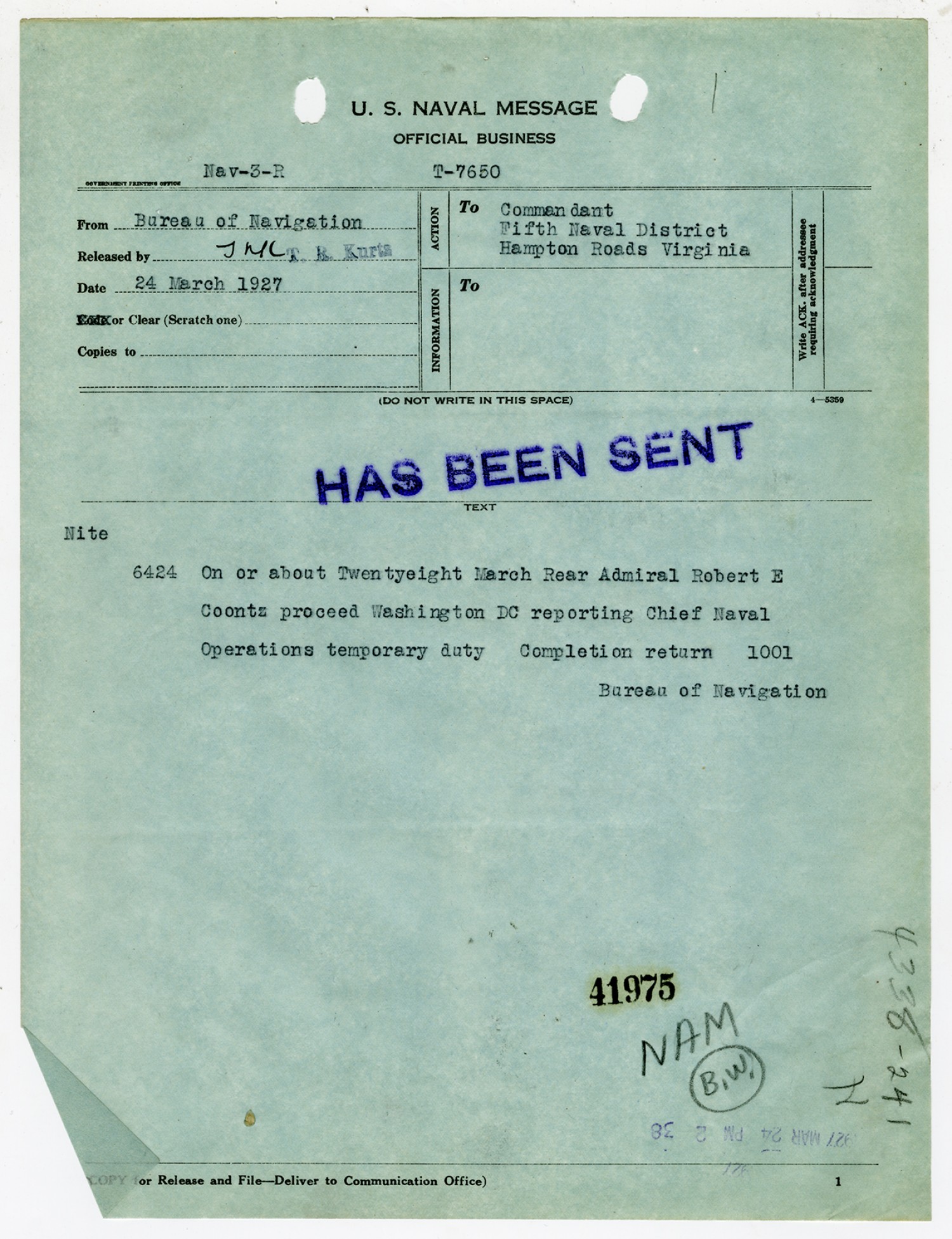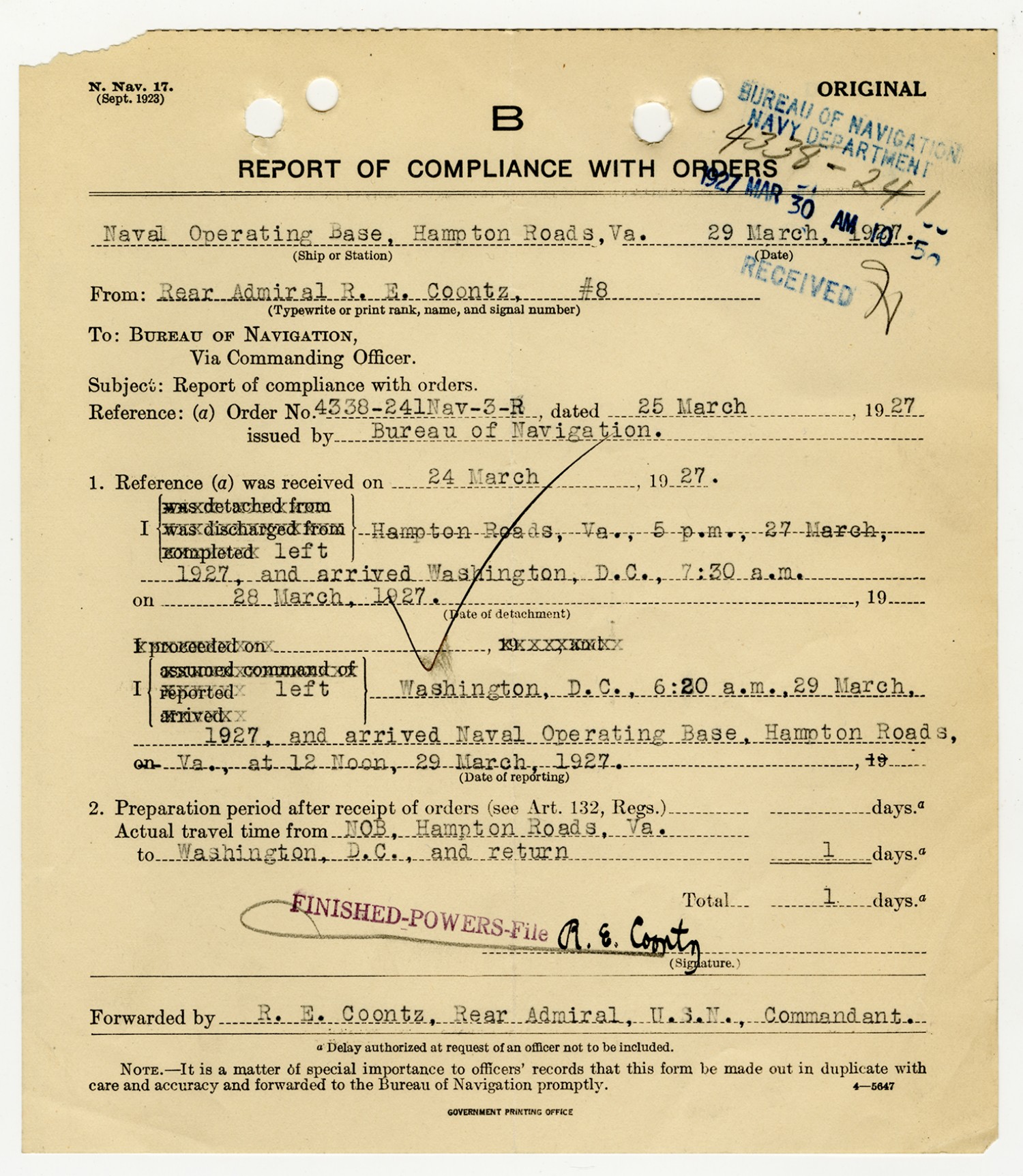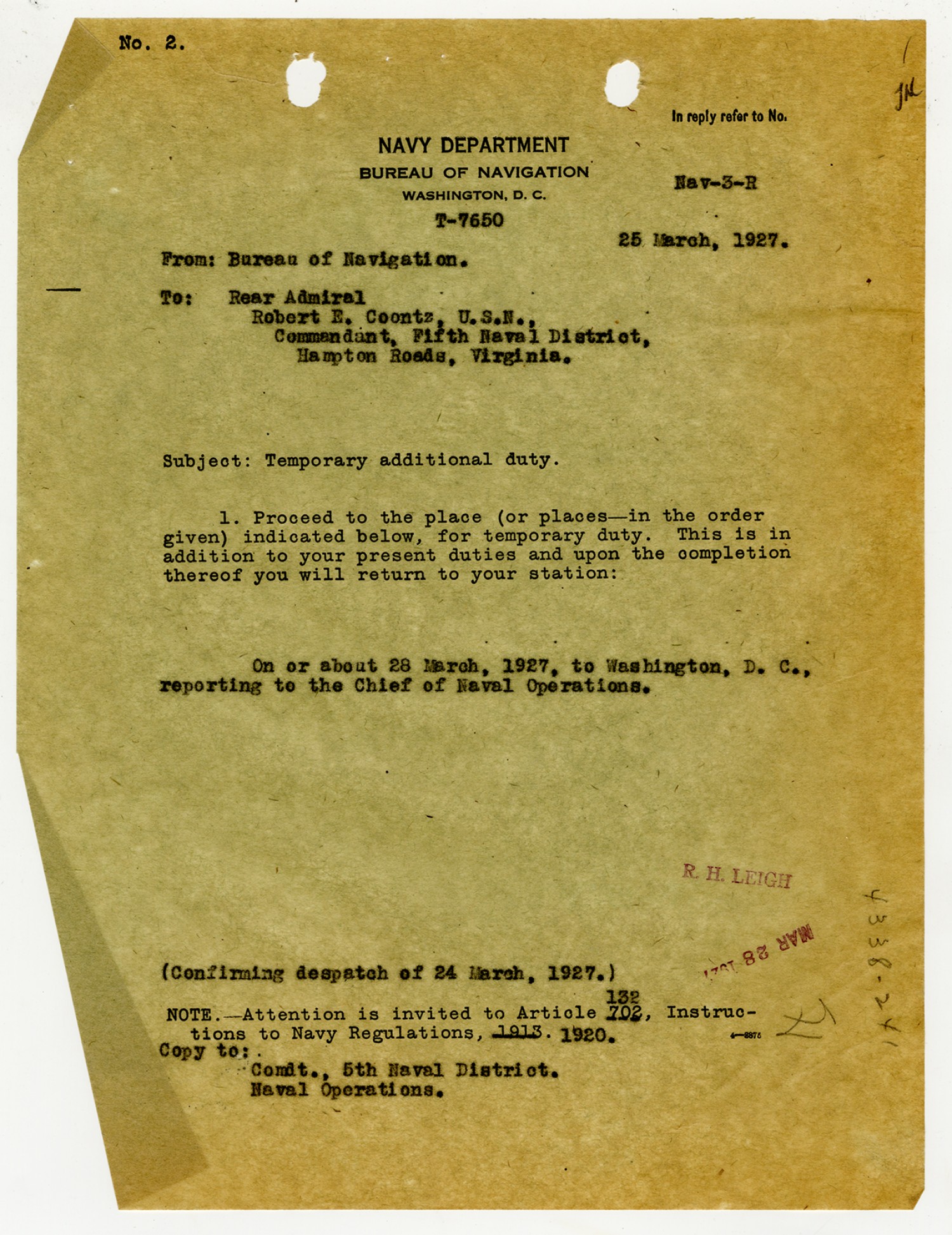 Bureau of Navigation letter to Robert E. Coontz - March 24, 1927