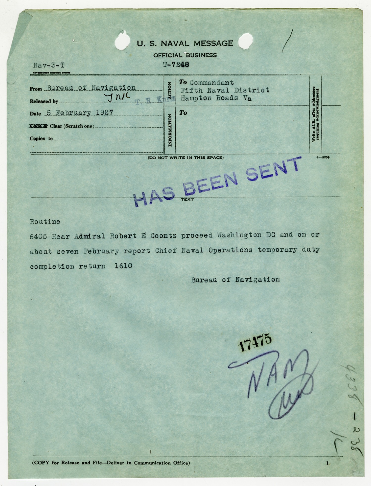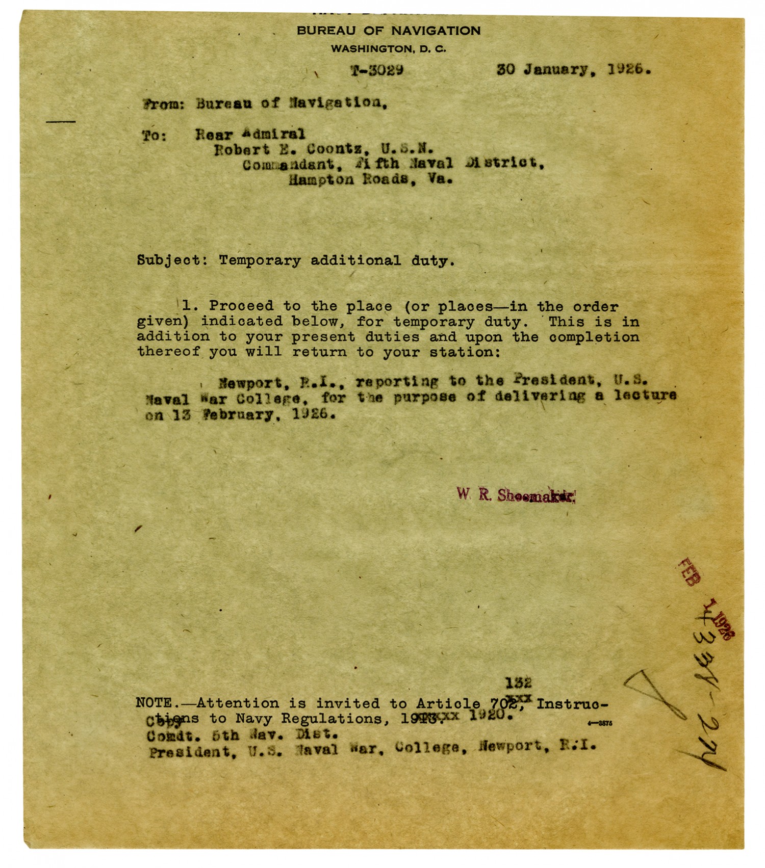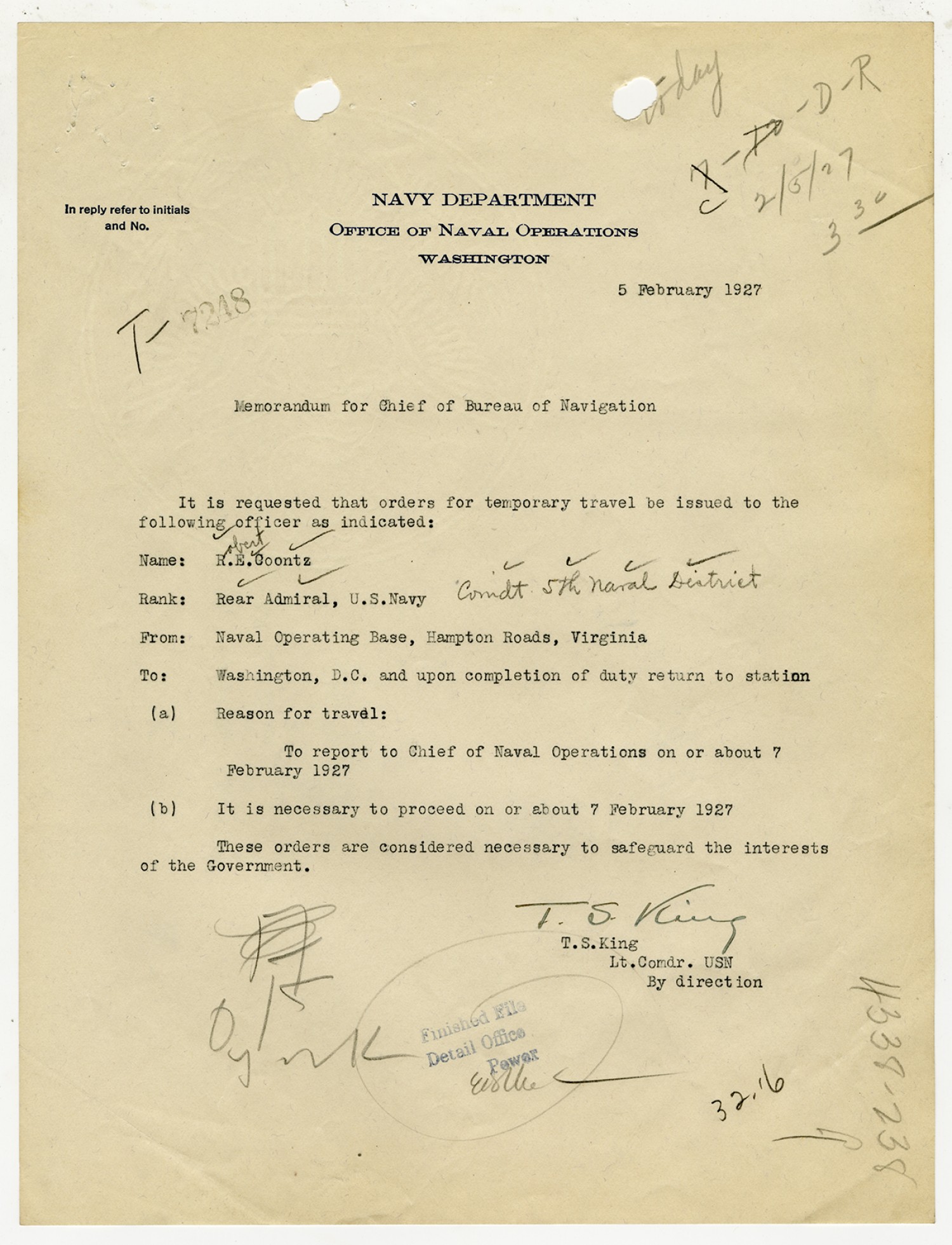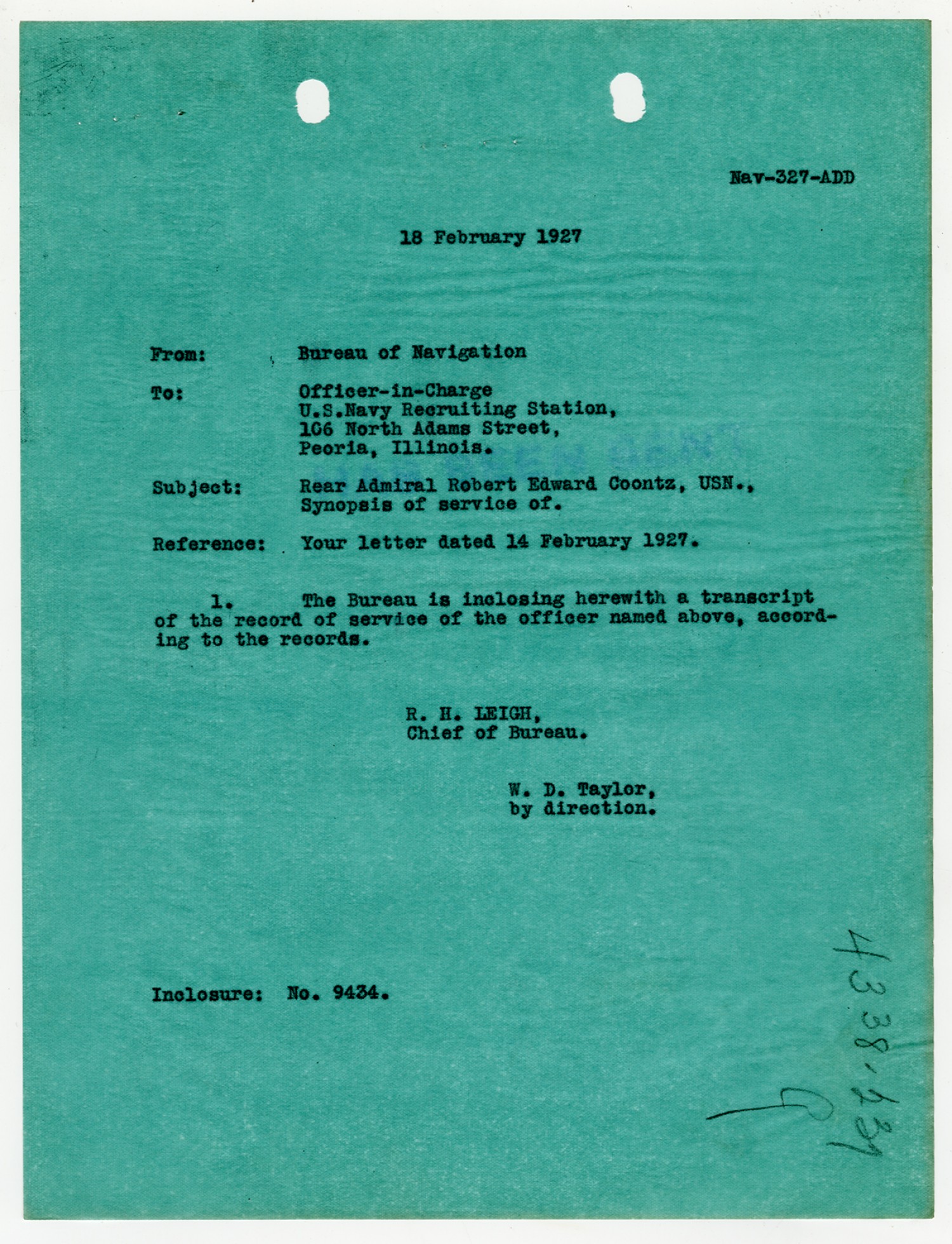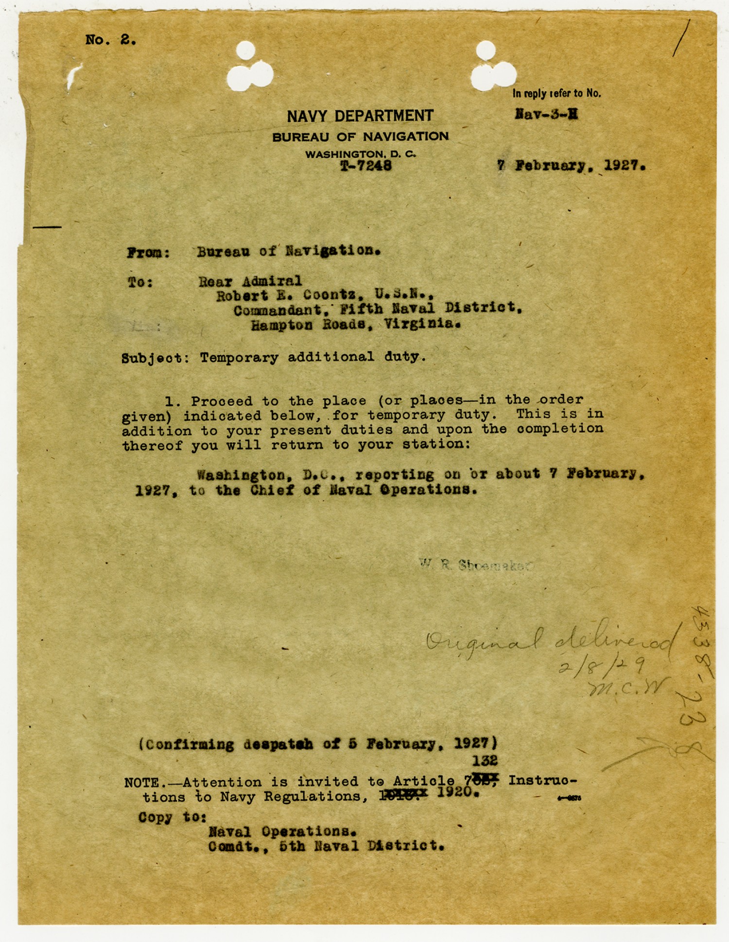 Bureau of Navigation letter to Robert E. Coontz - February 5, 1927