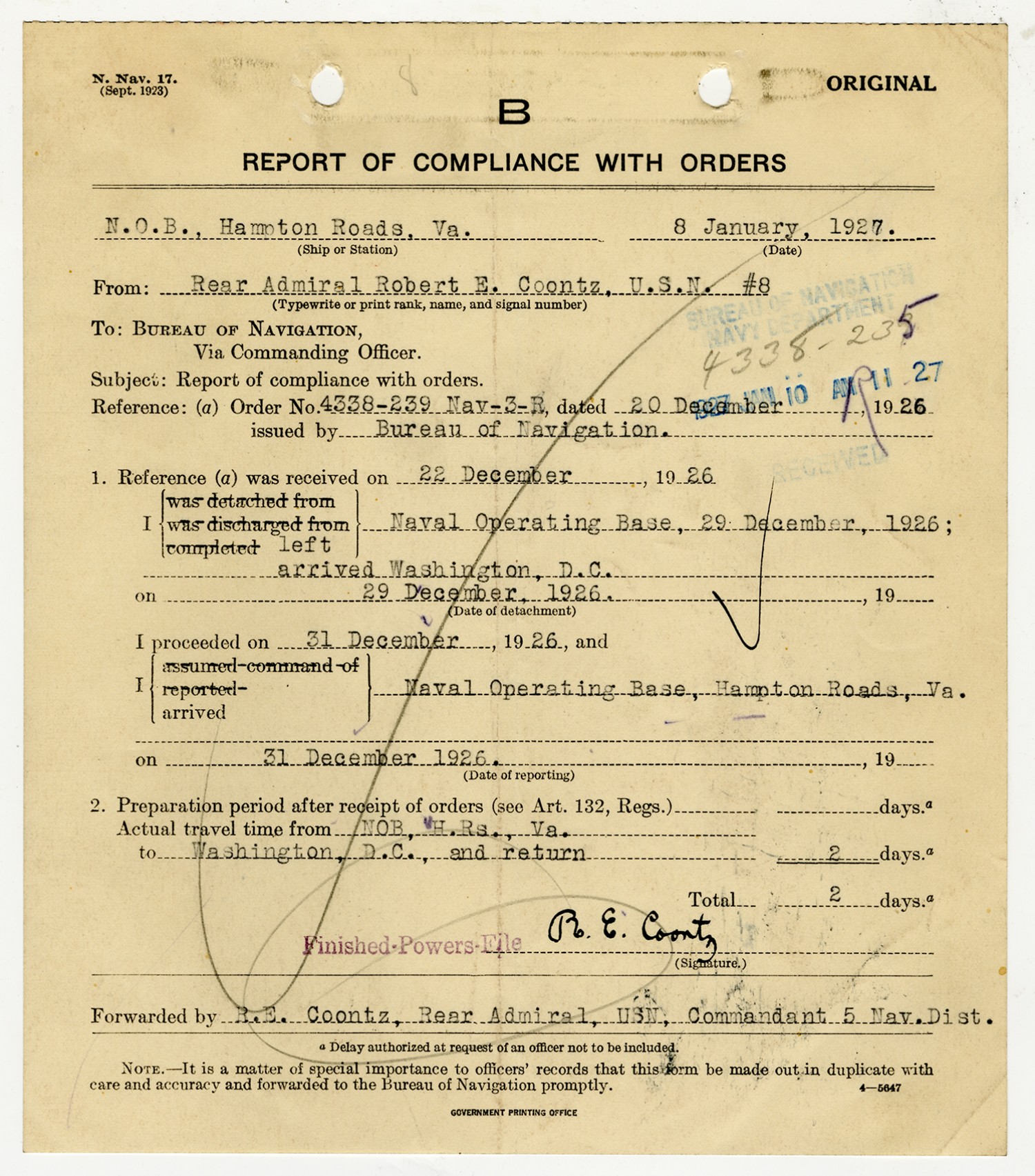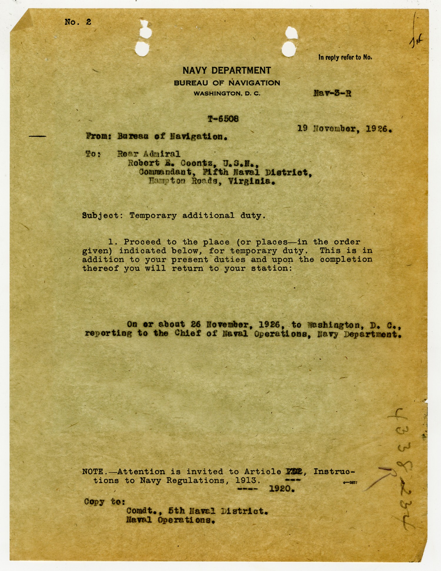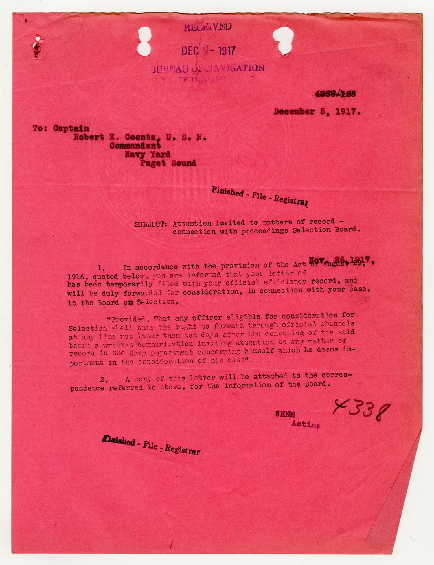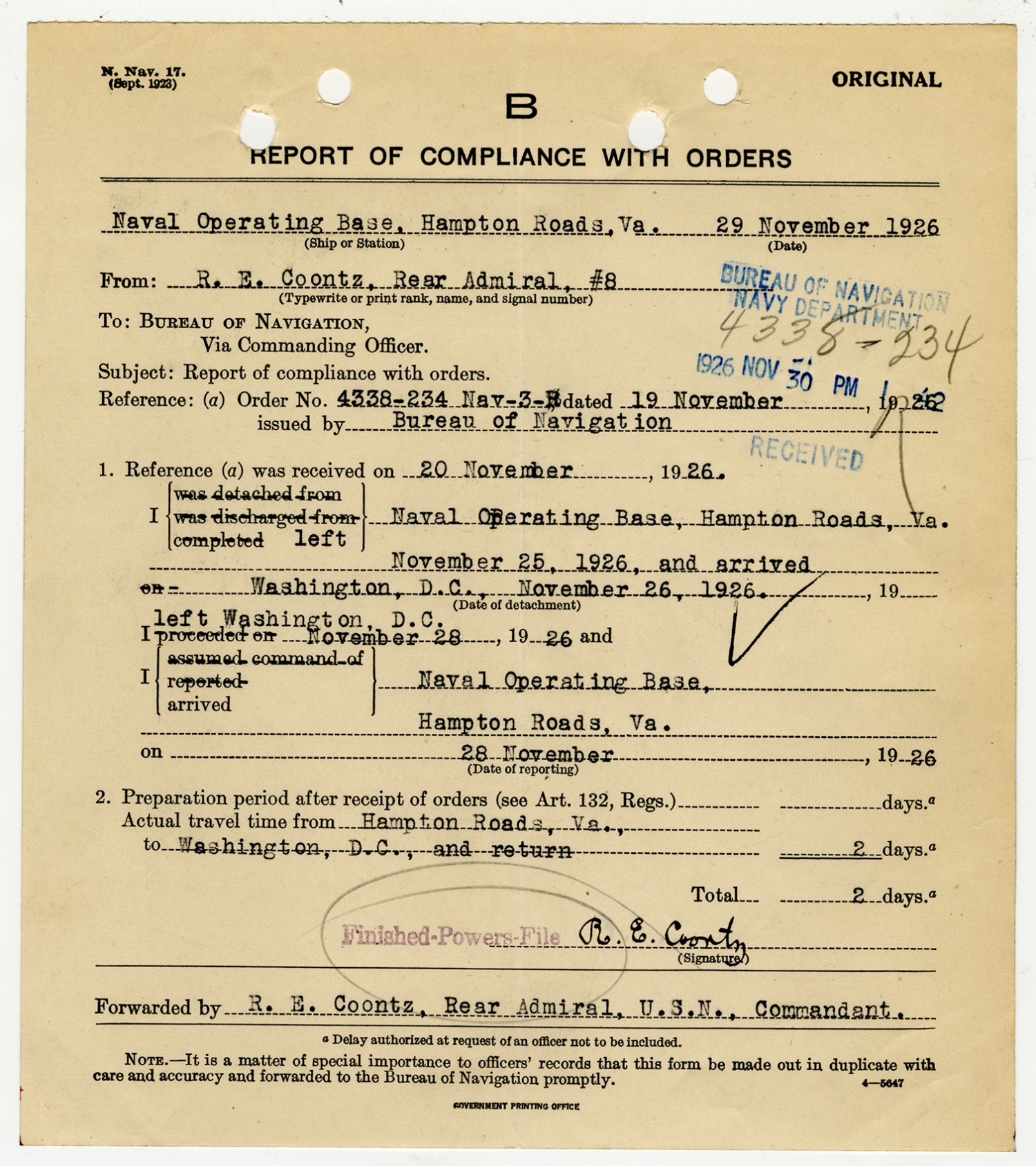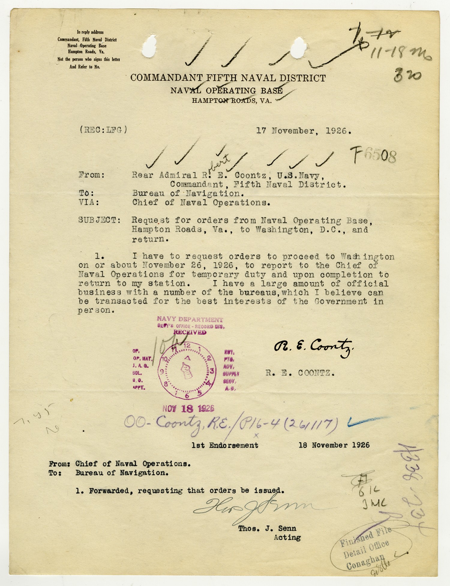 Robert E. Coontz letter to the Bureau of Navigation - November 17, 1926