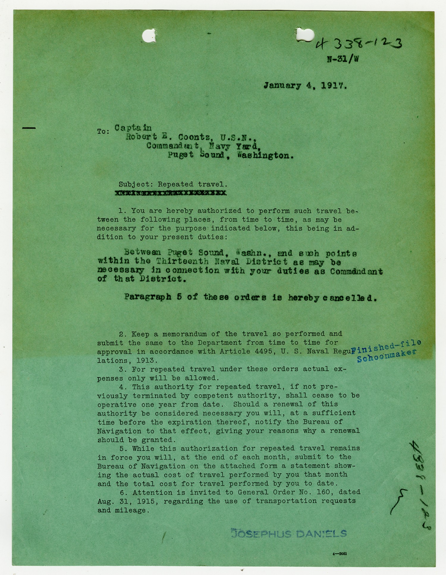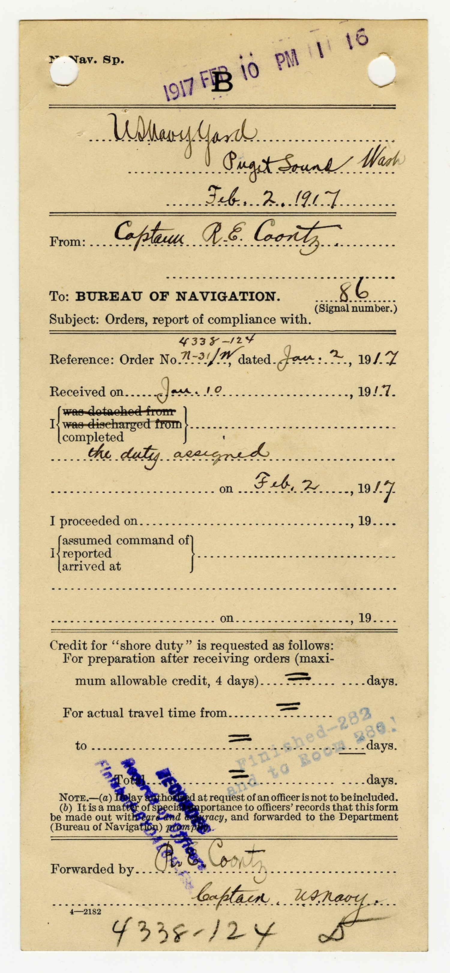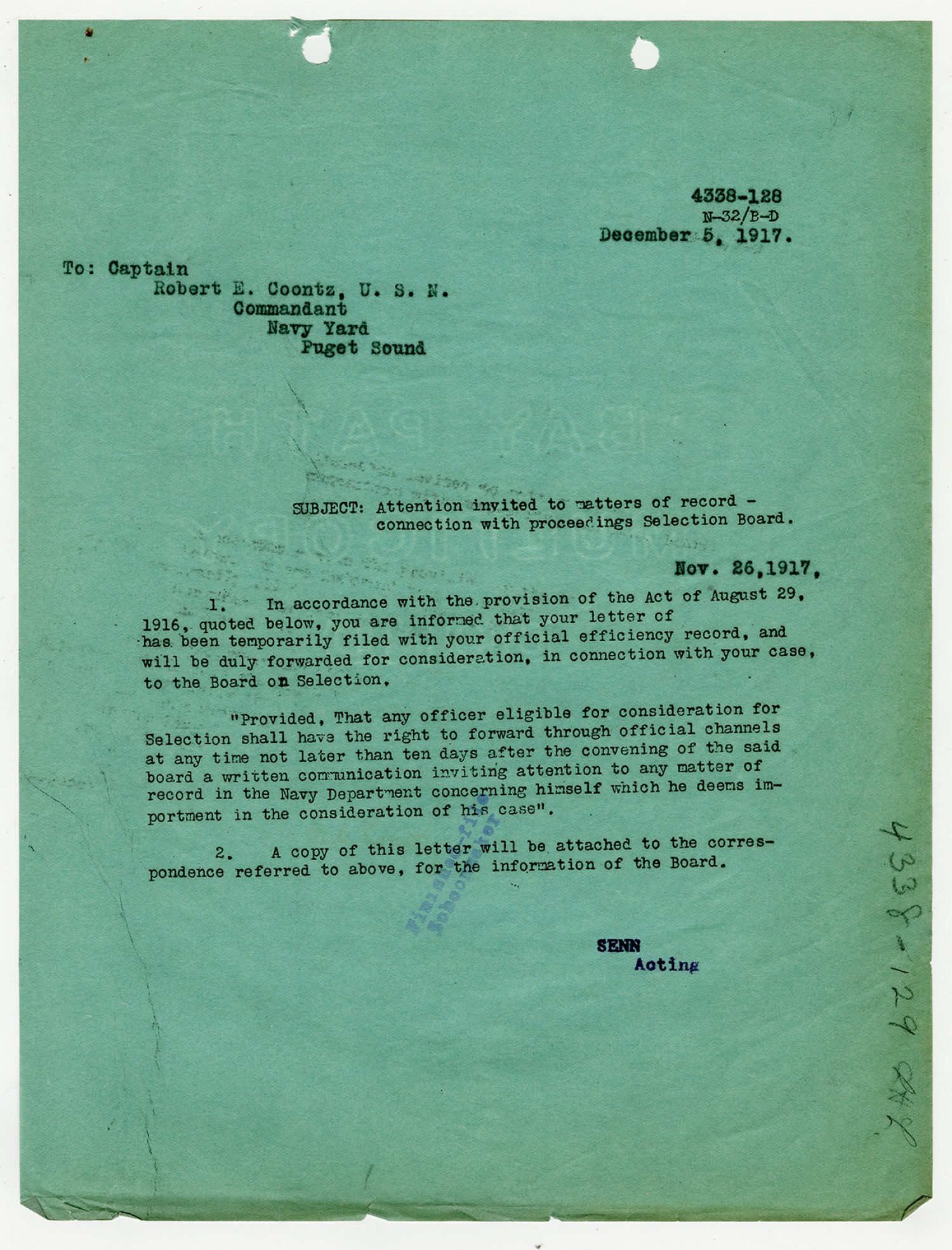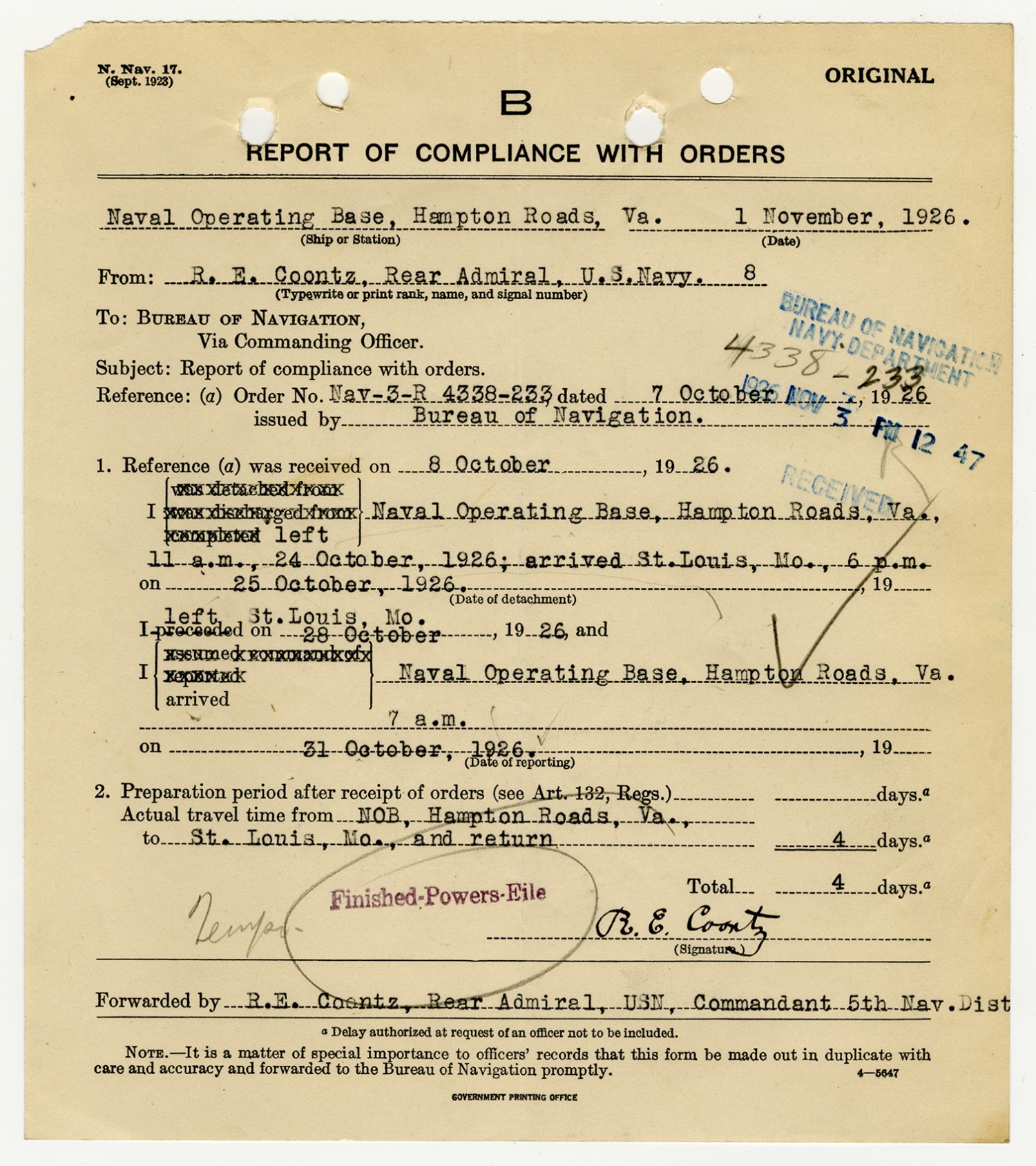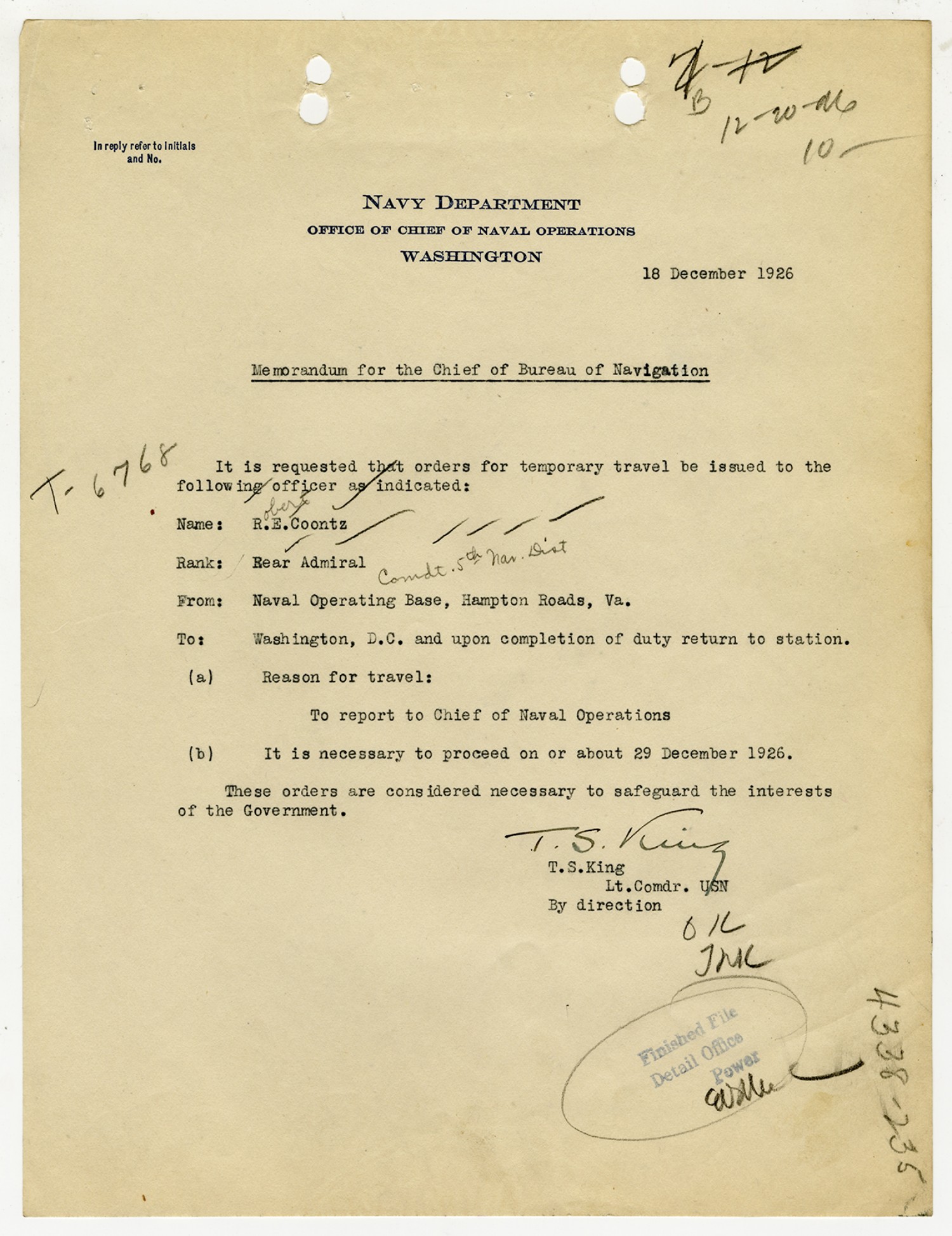 Robert E. Coontz letter to the Bureau of Navigation - November 17, 1926