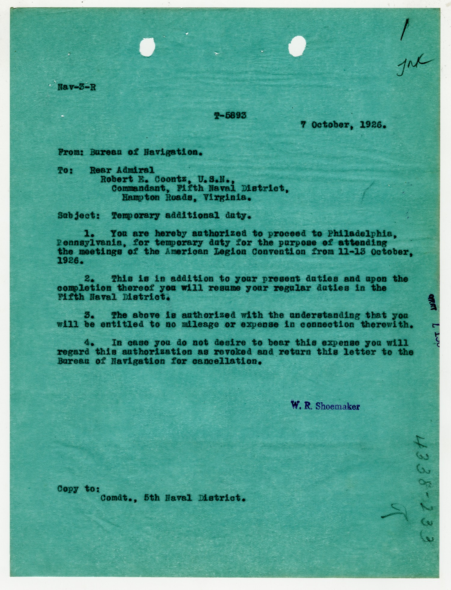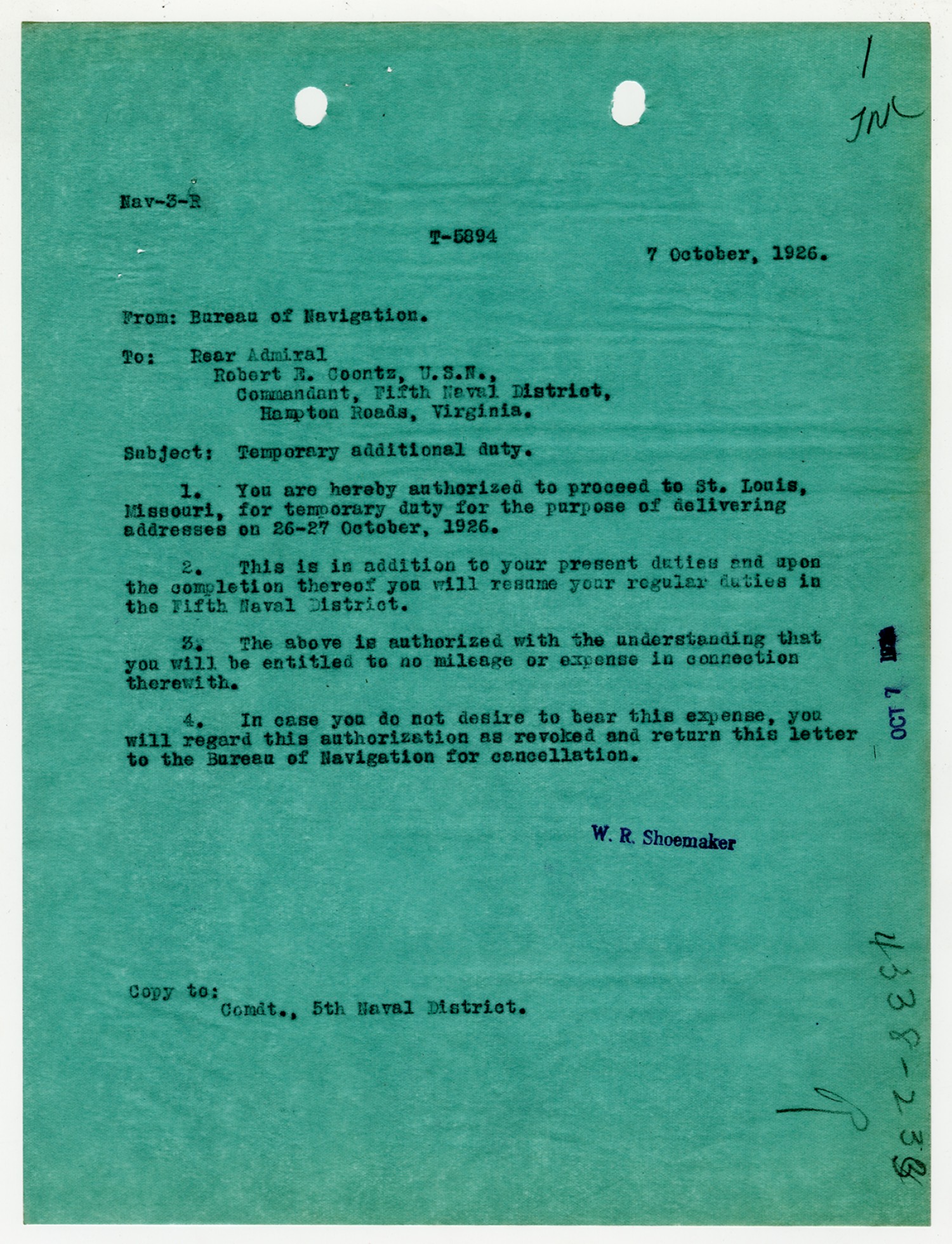 W.R. Shoemaker letter to Robert E. Coontz - October 7, 1926