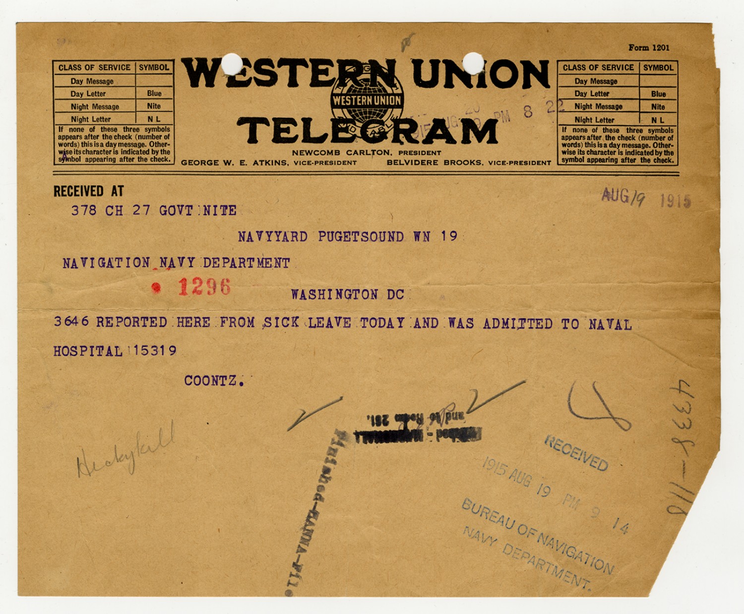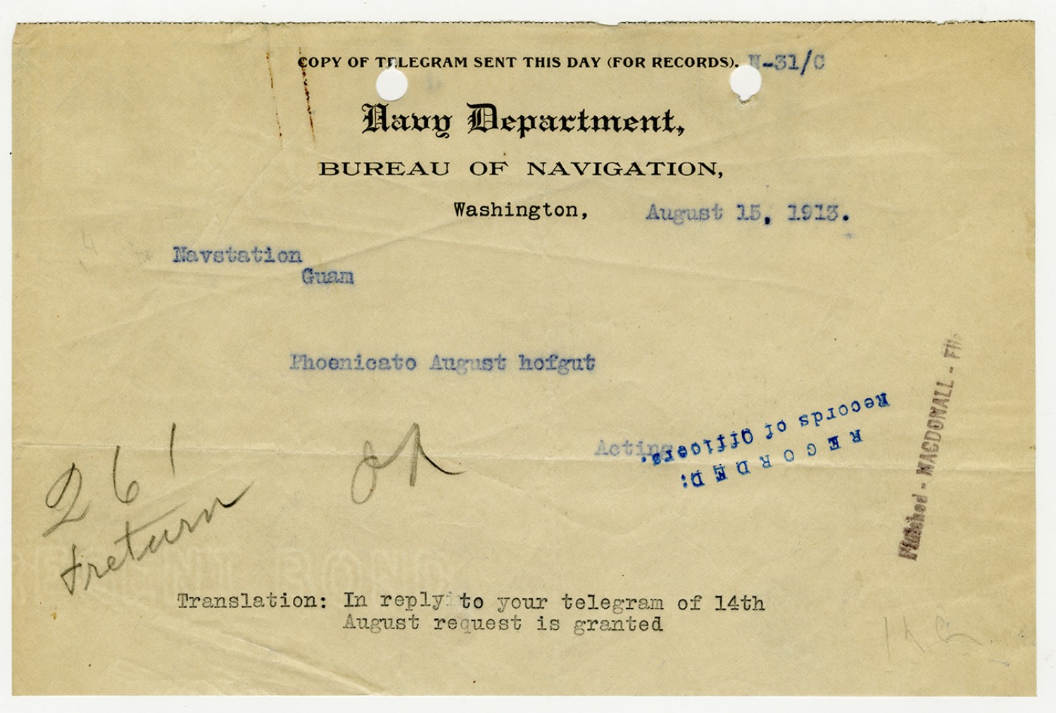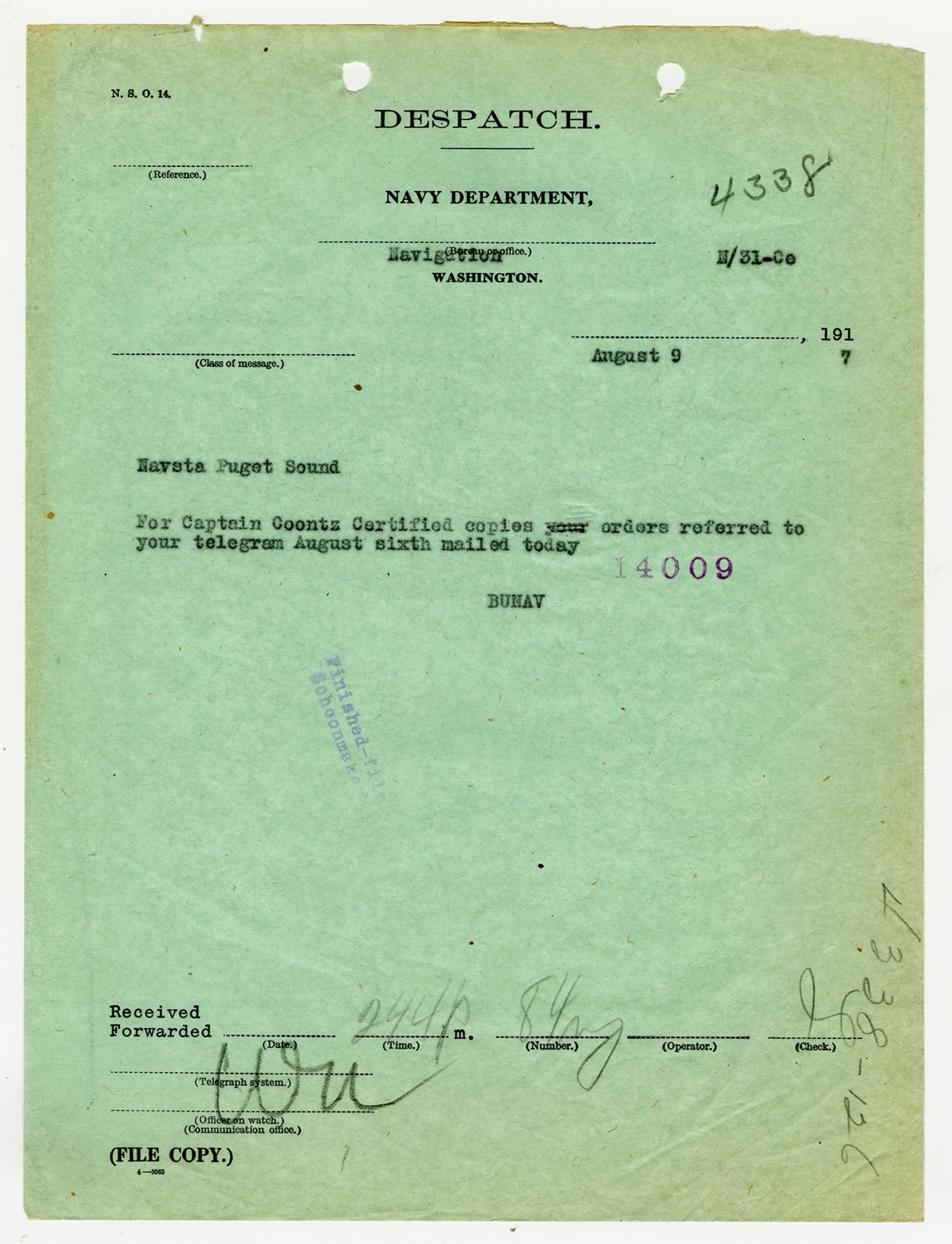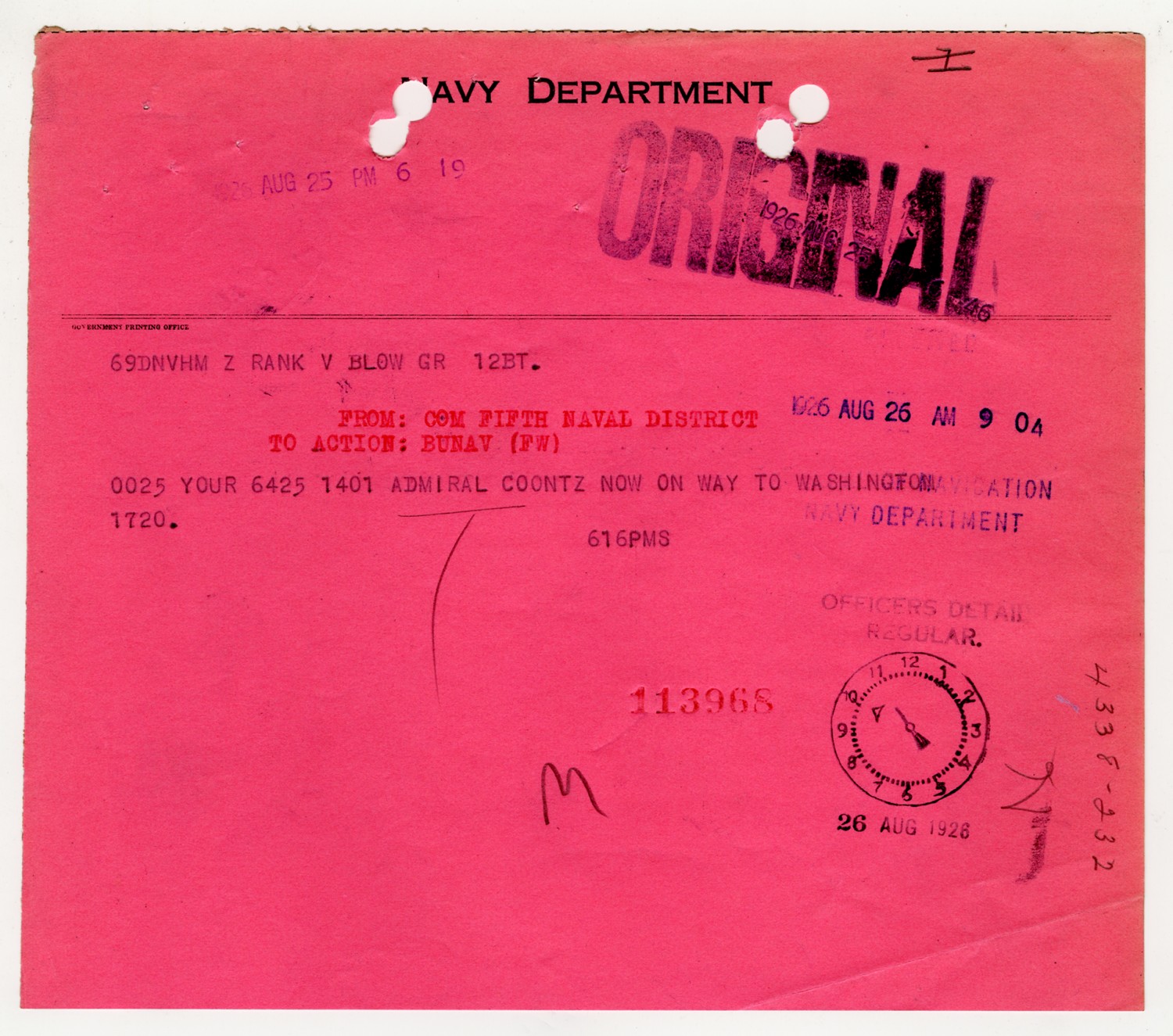 Commander of the Fifth Naval District Telegram - August 26, 1926