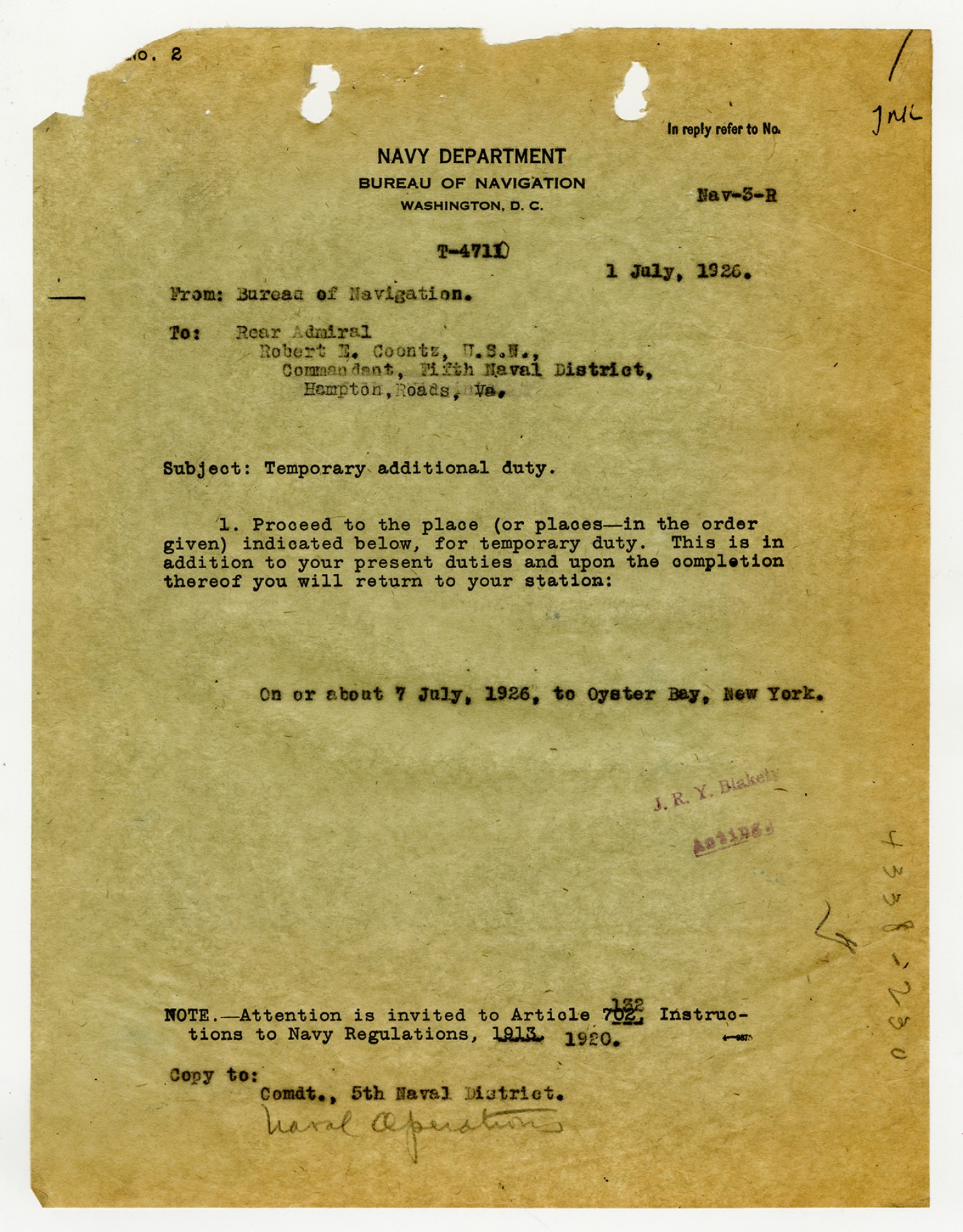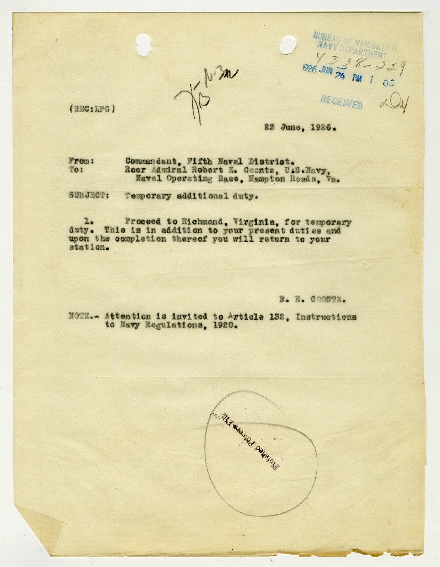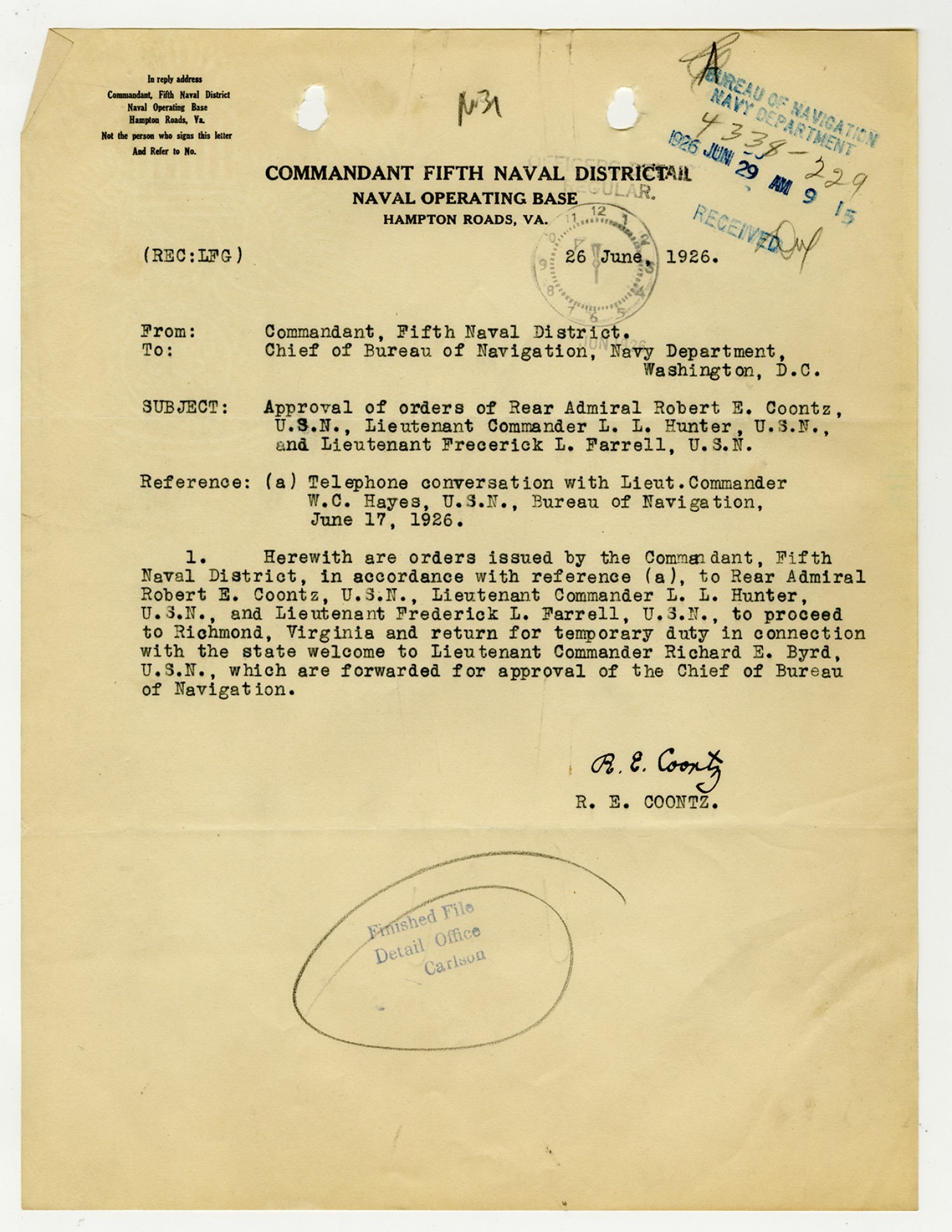 Bureau of Navigation letter to Commandant of the Fifth Naval District - August 25, 1926