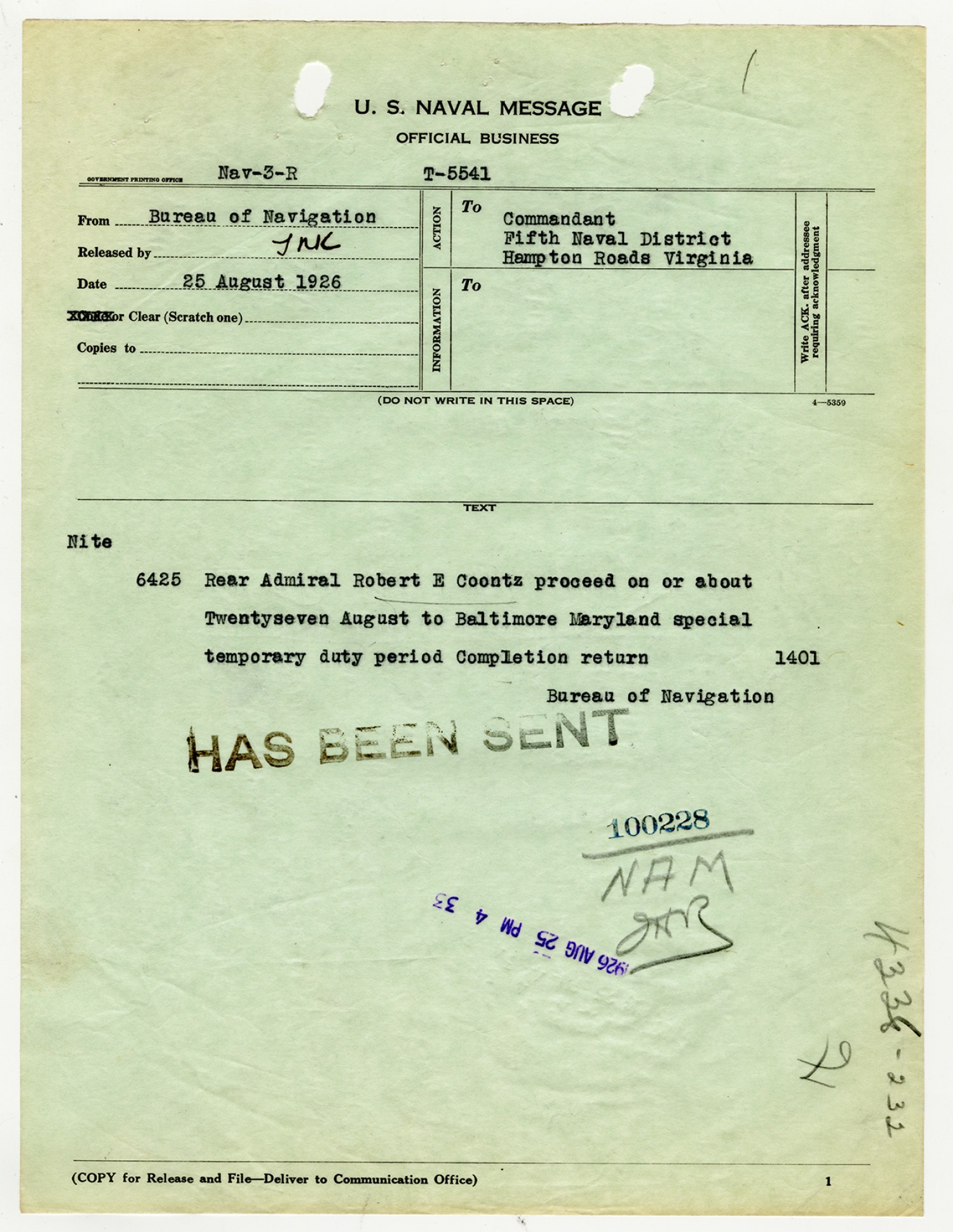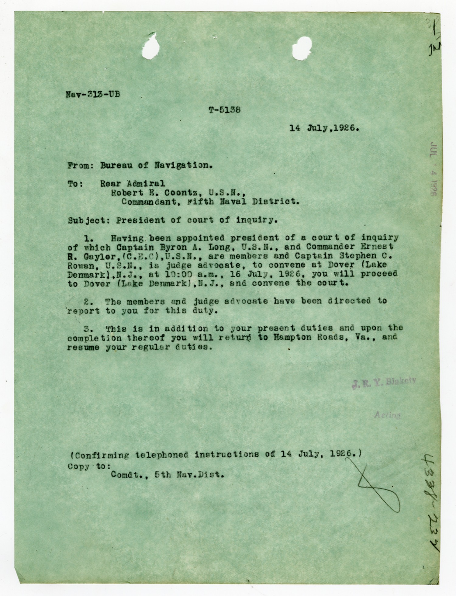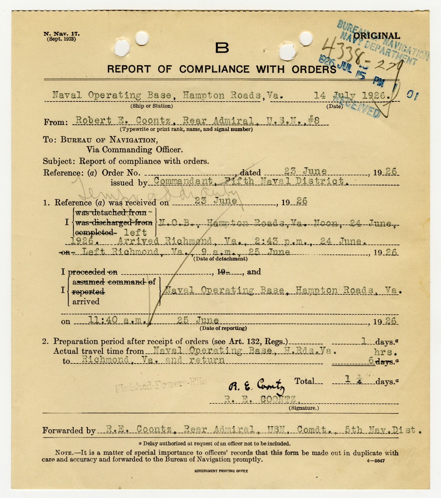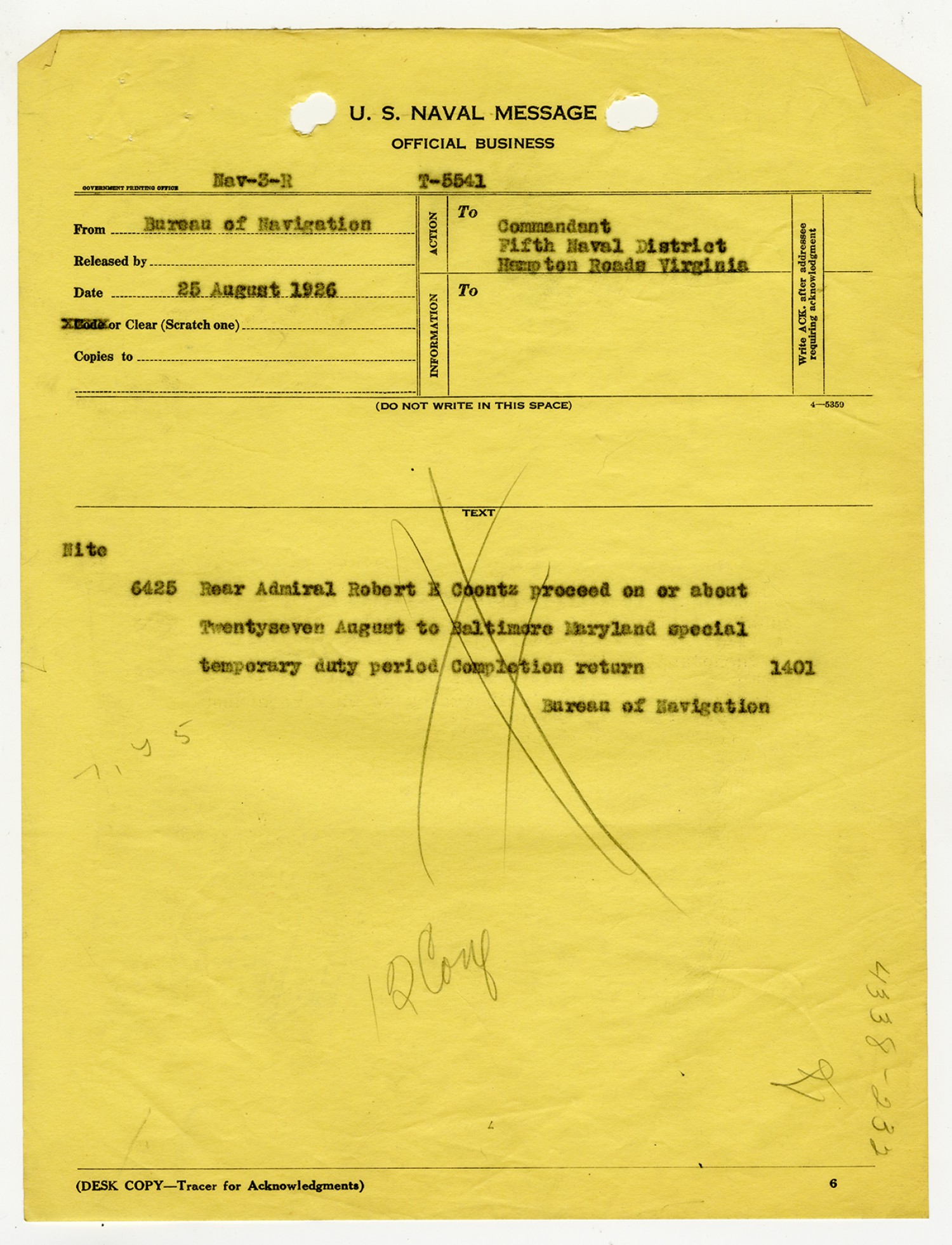Bureau of Navigation letter to Commandant of the Fifth Naval District - August 25, 1926