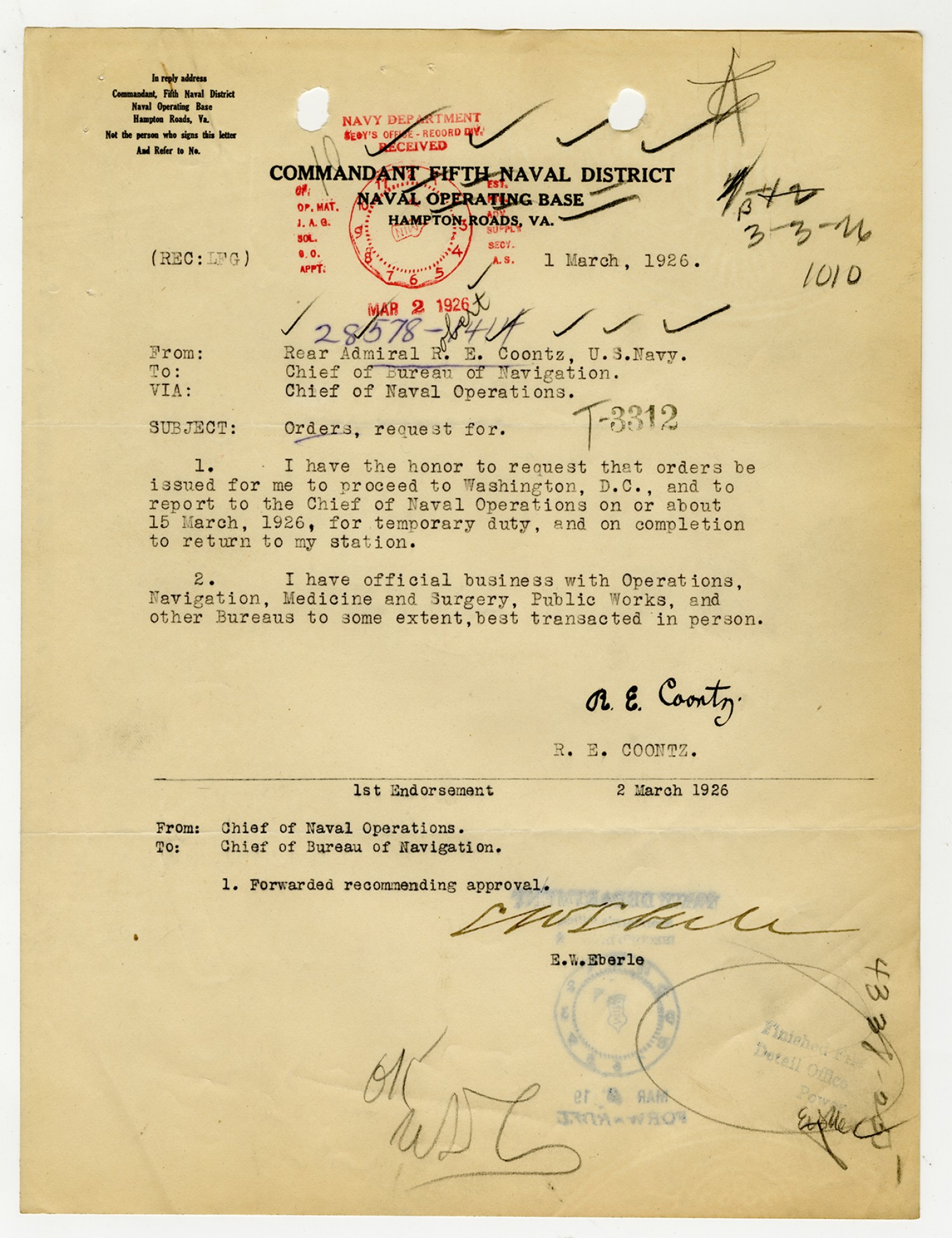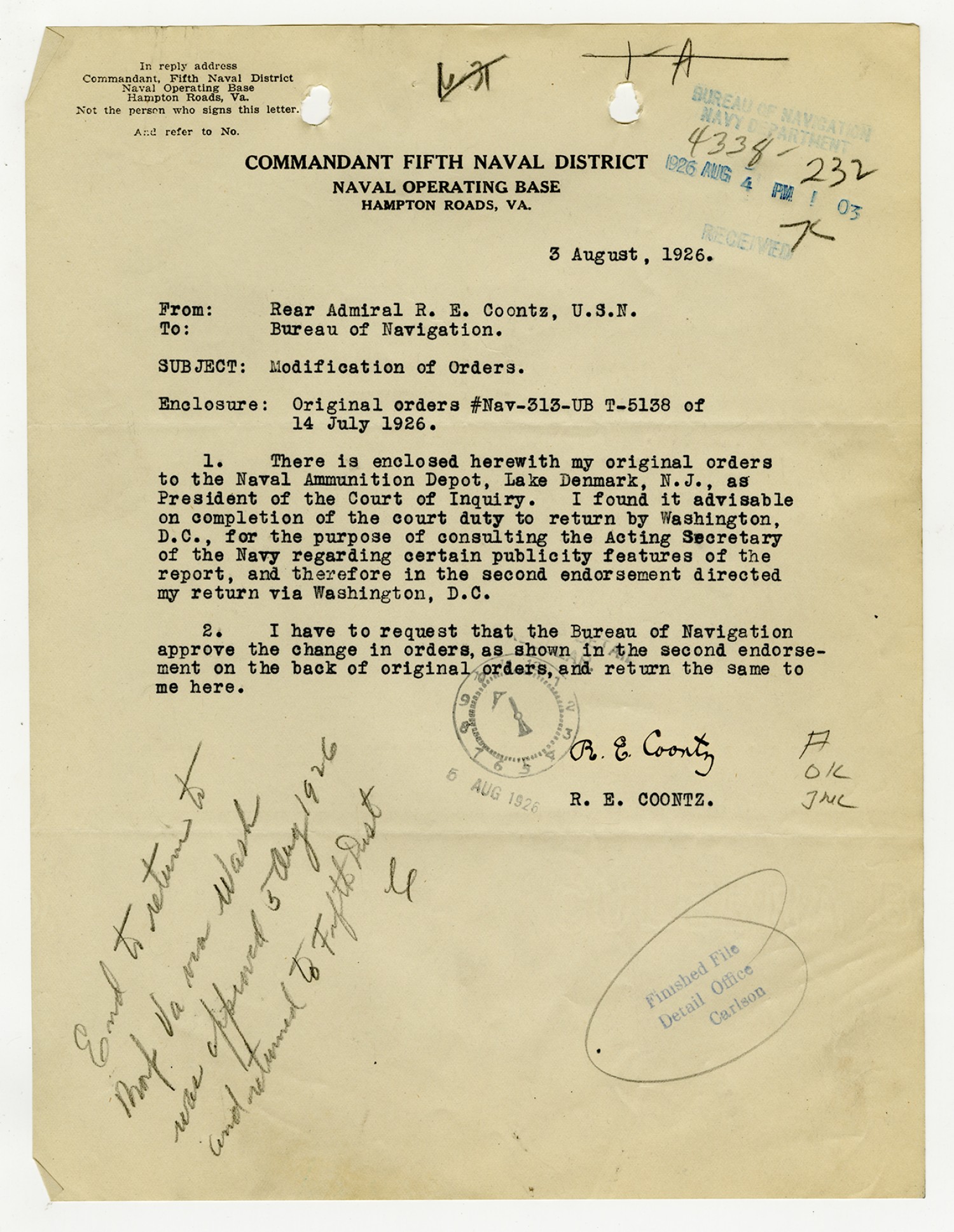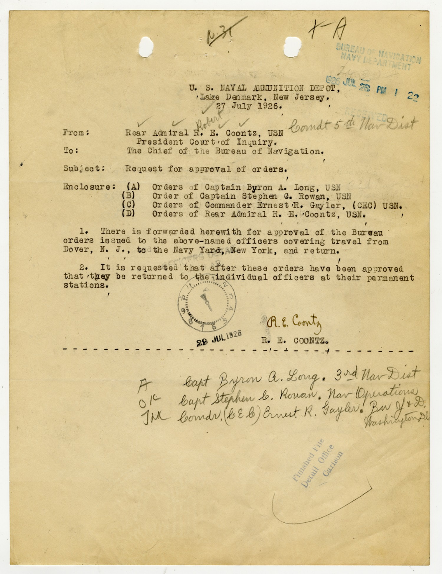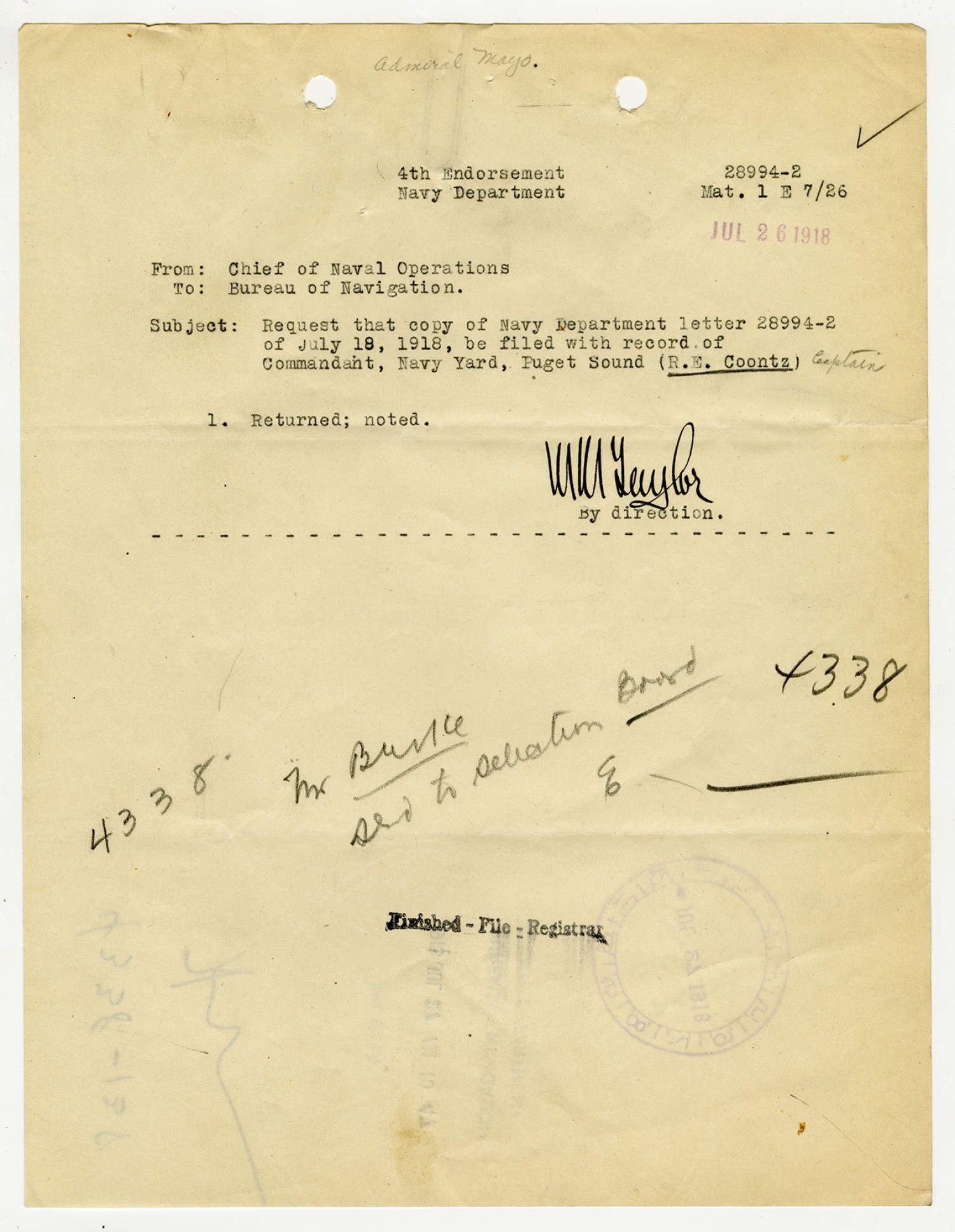 Robert E. Coontz letter to the Bureau of Navigation - August 3, 1926