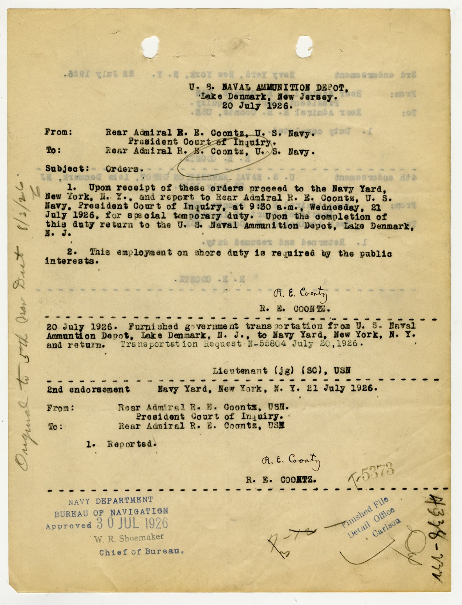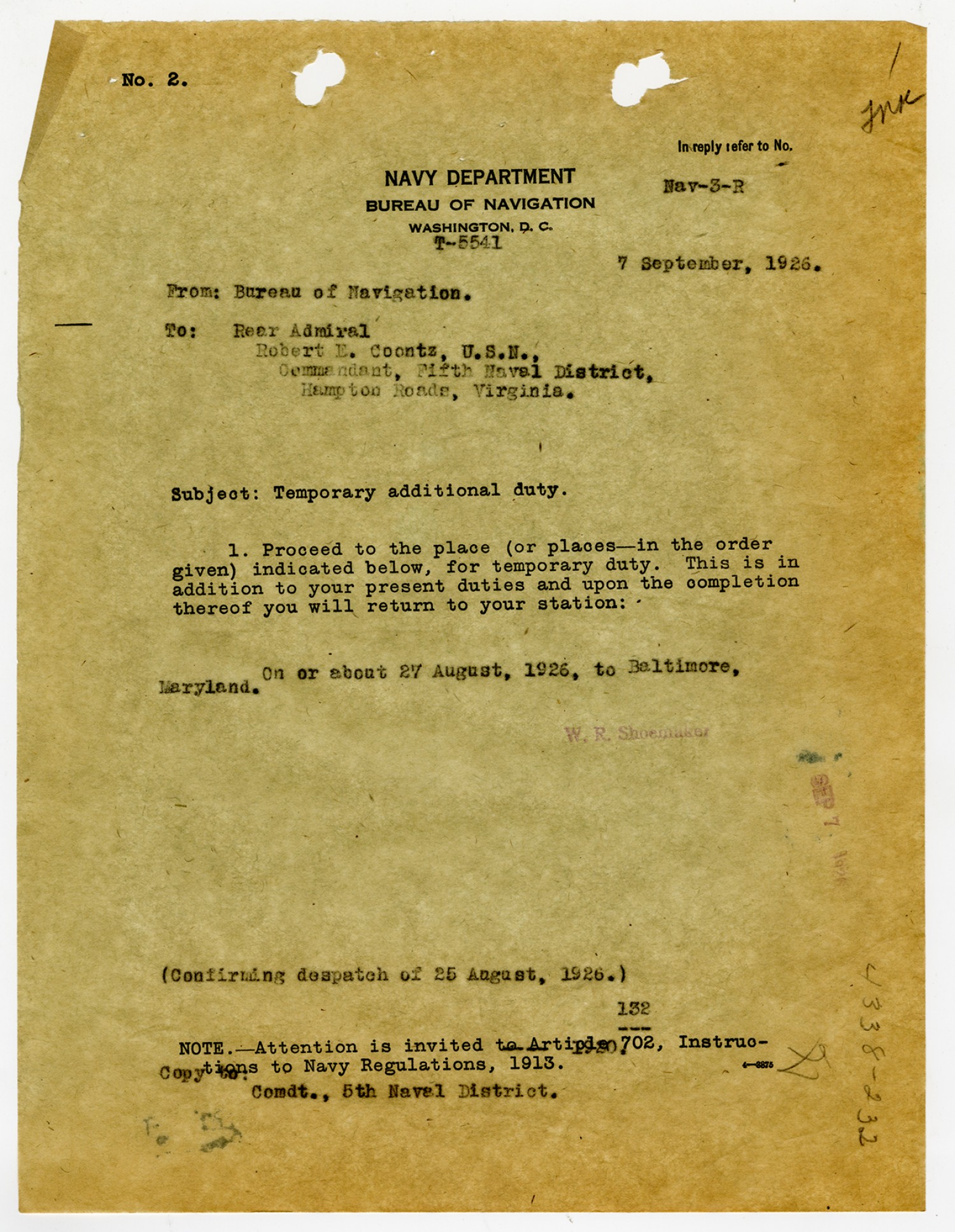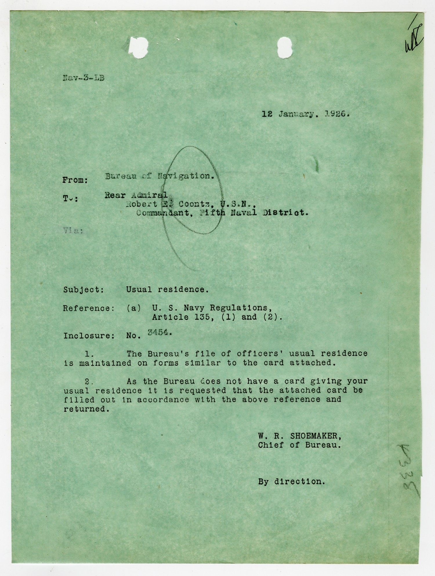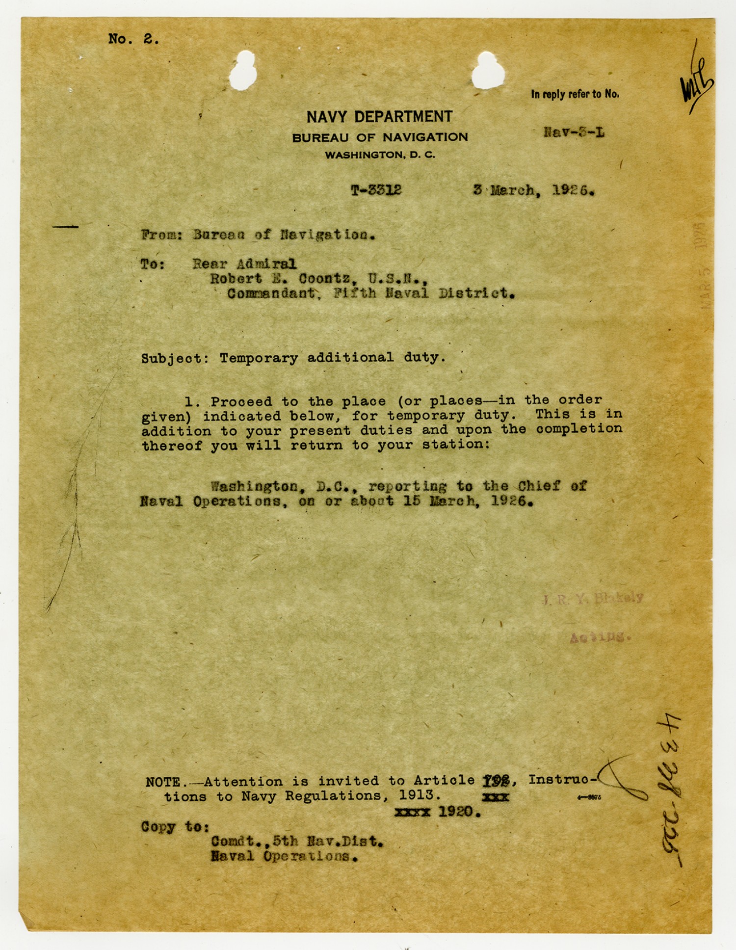 Robert E. Coontz letter to the Bureau of Navigation - August 3, 1926
