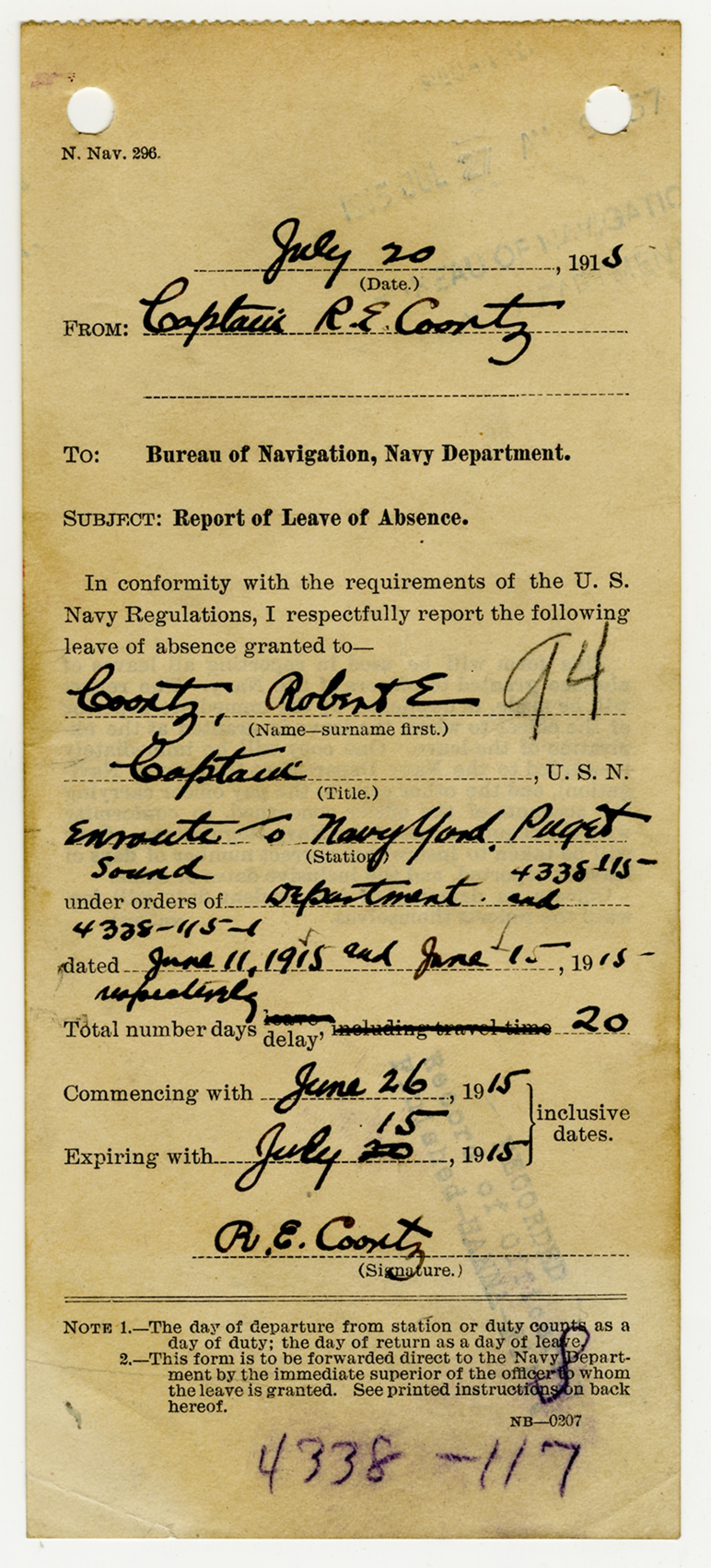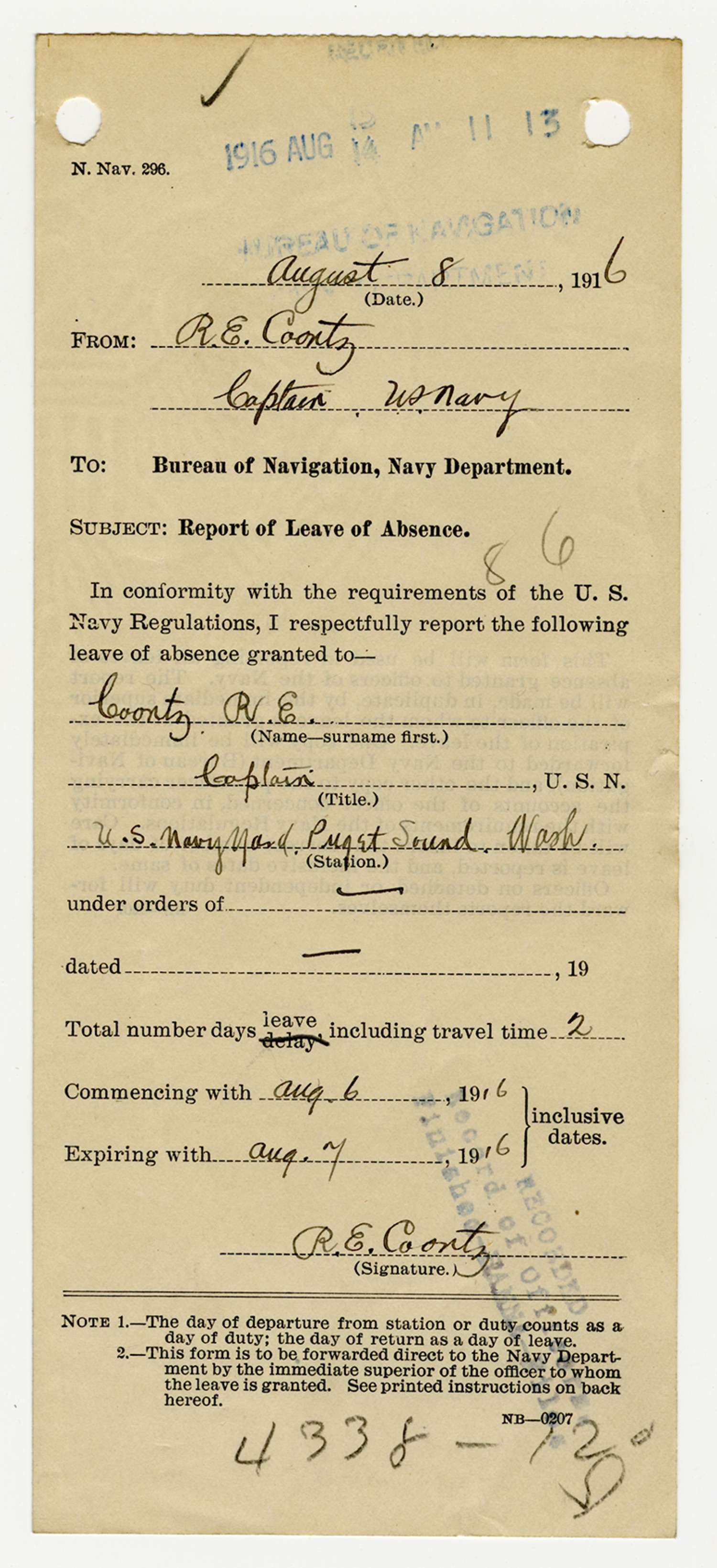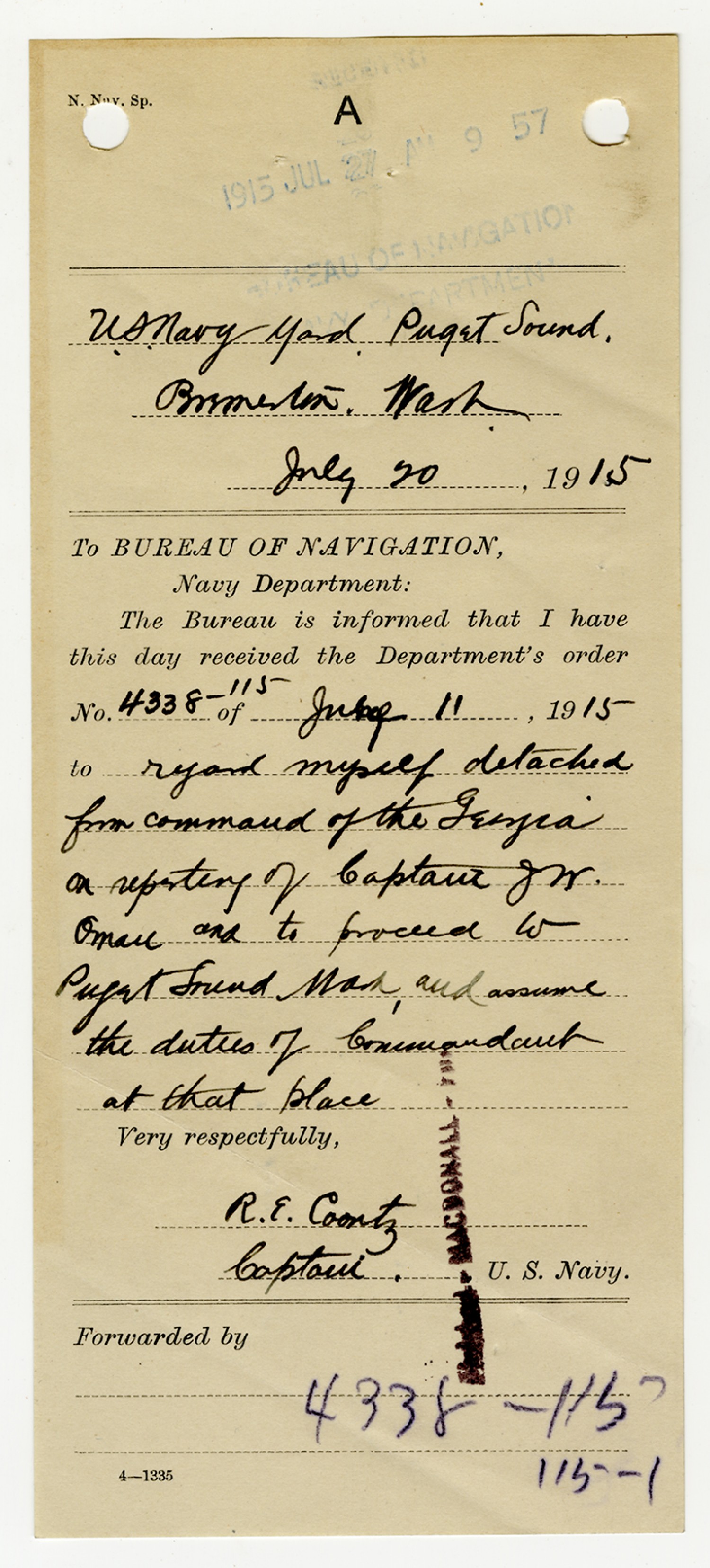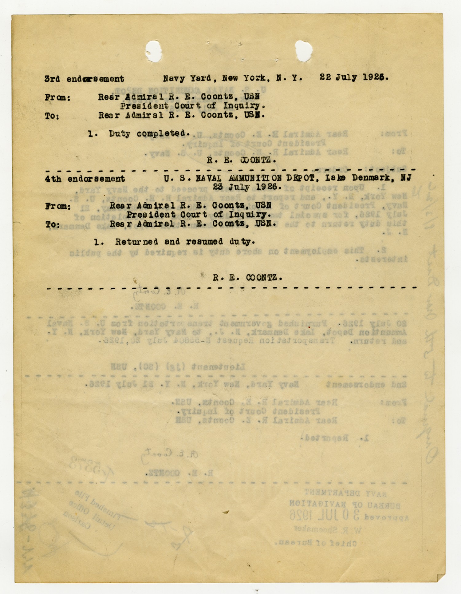 Robert E. Coontz letter to the Bureau of Navigation - August 3, 1926
