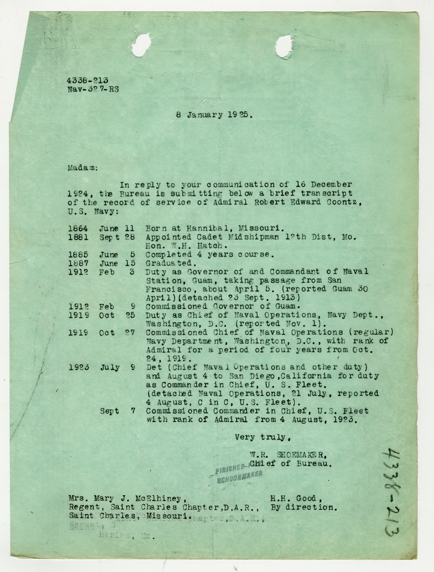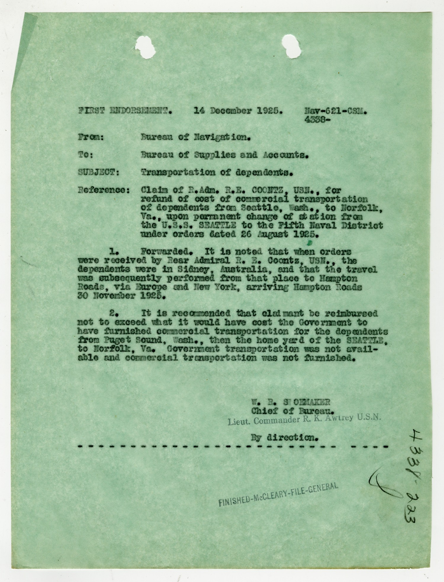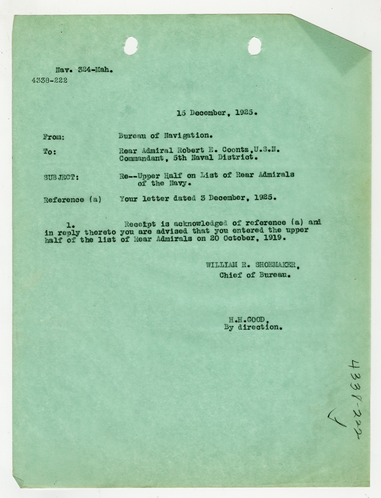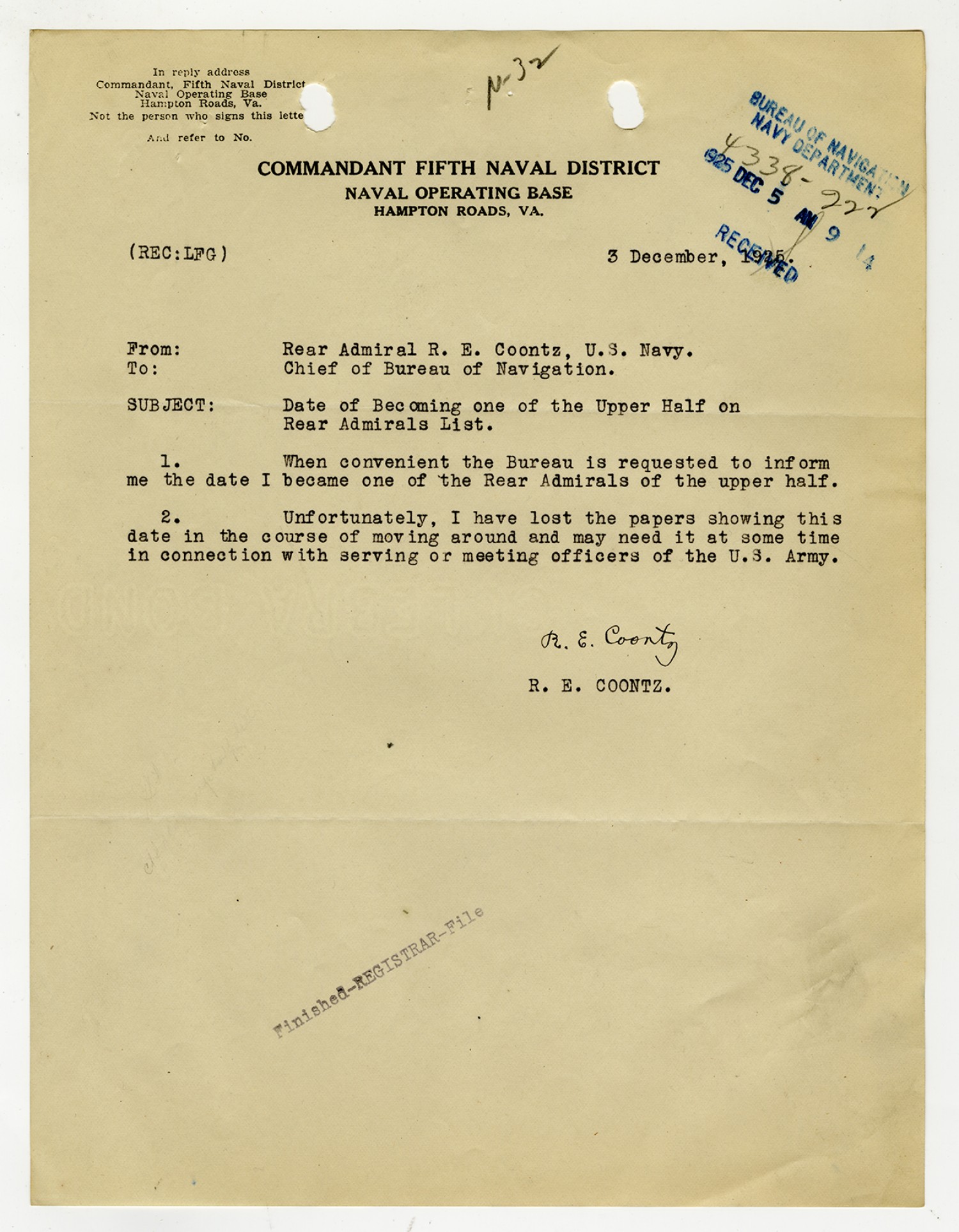 Robert E. Coontz letter to the Chief of the Bureau of Navigation - December 3, 1925