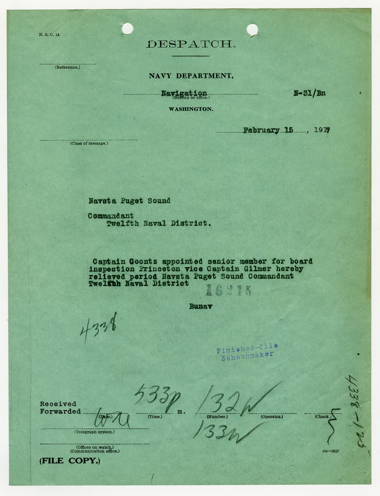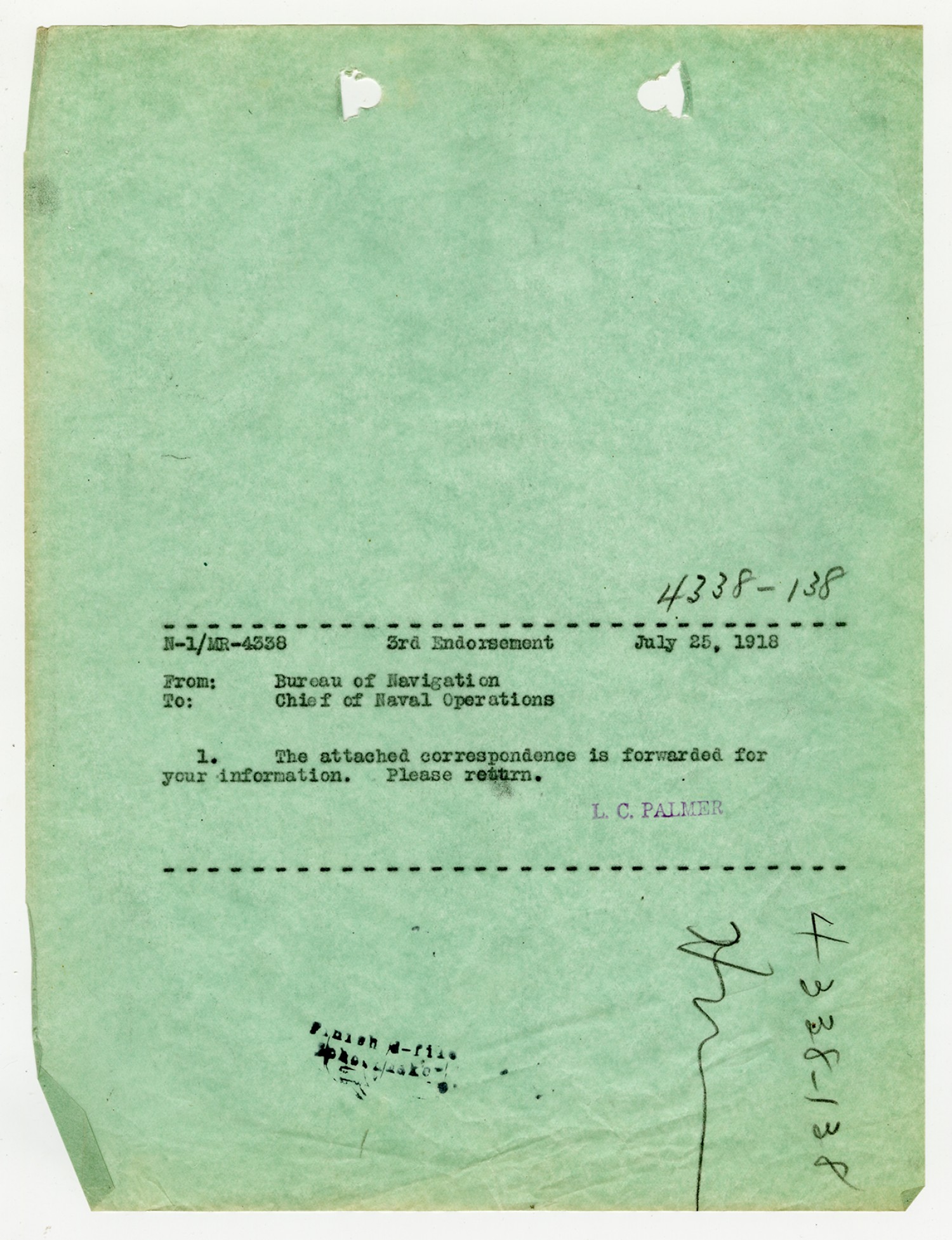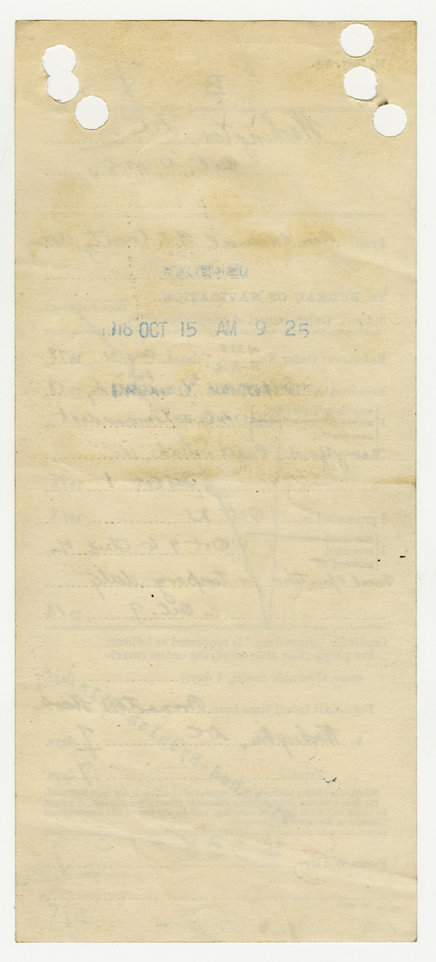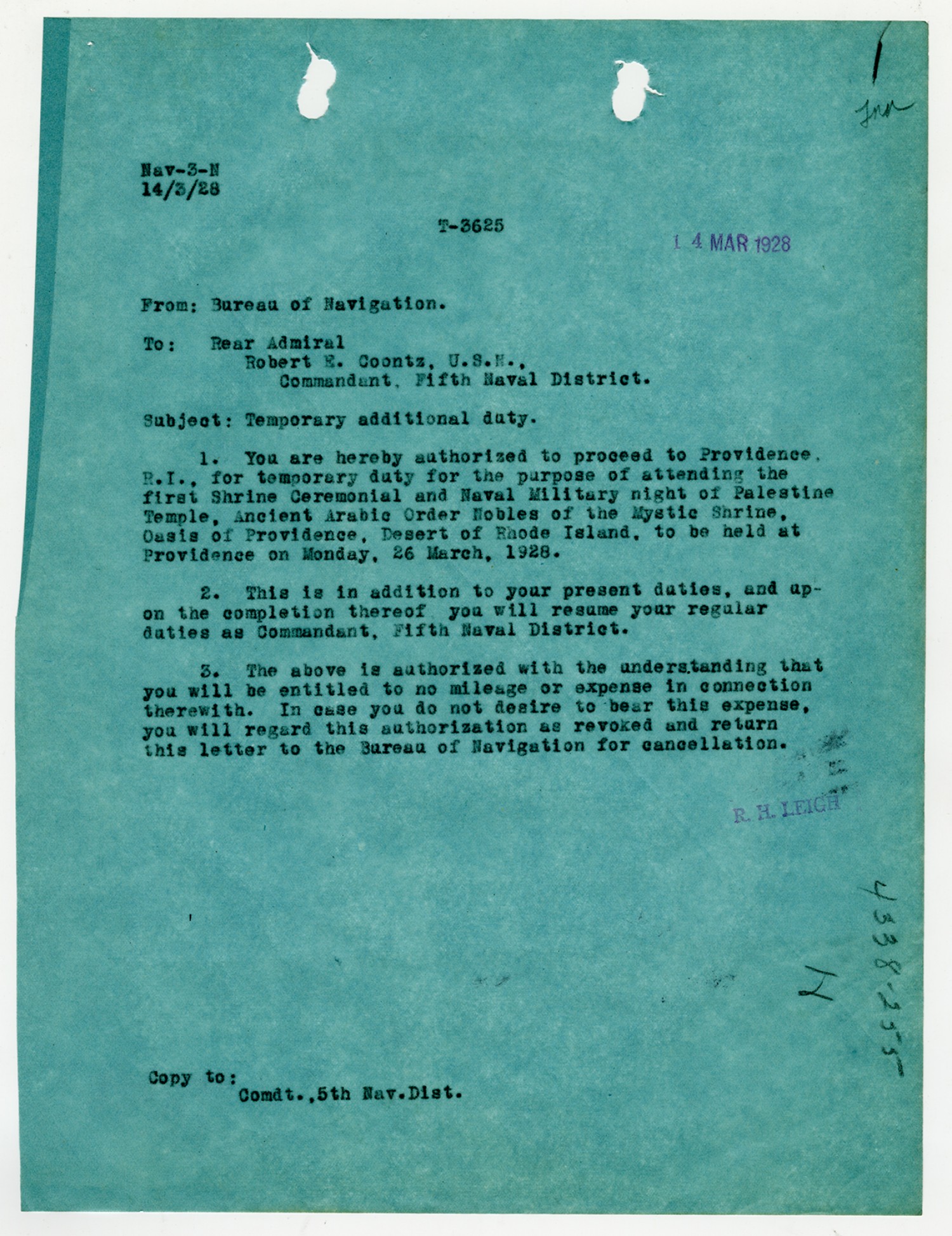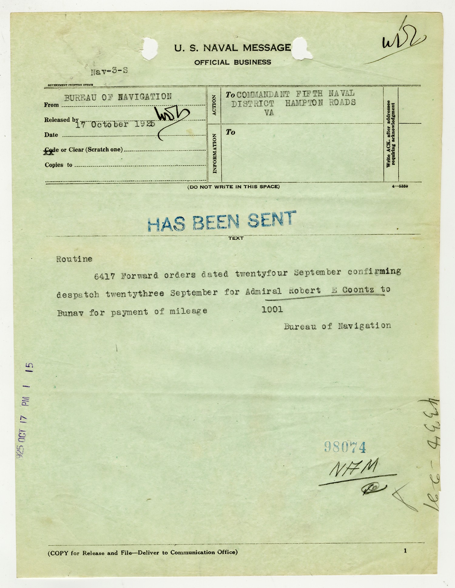 Bureau of Navigation letter to the Commandant of the Fifth Naval District - October 17, 1925