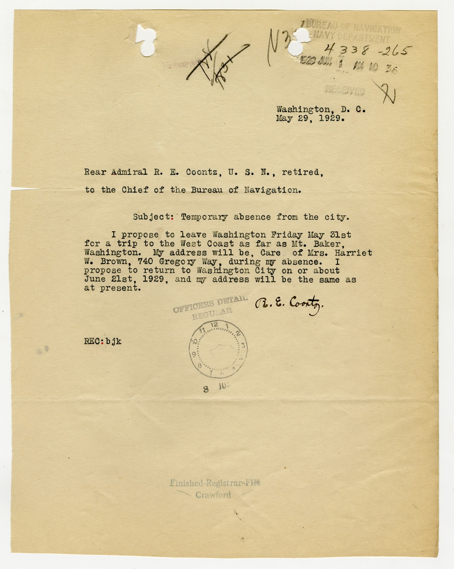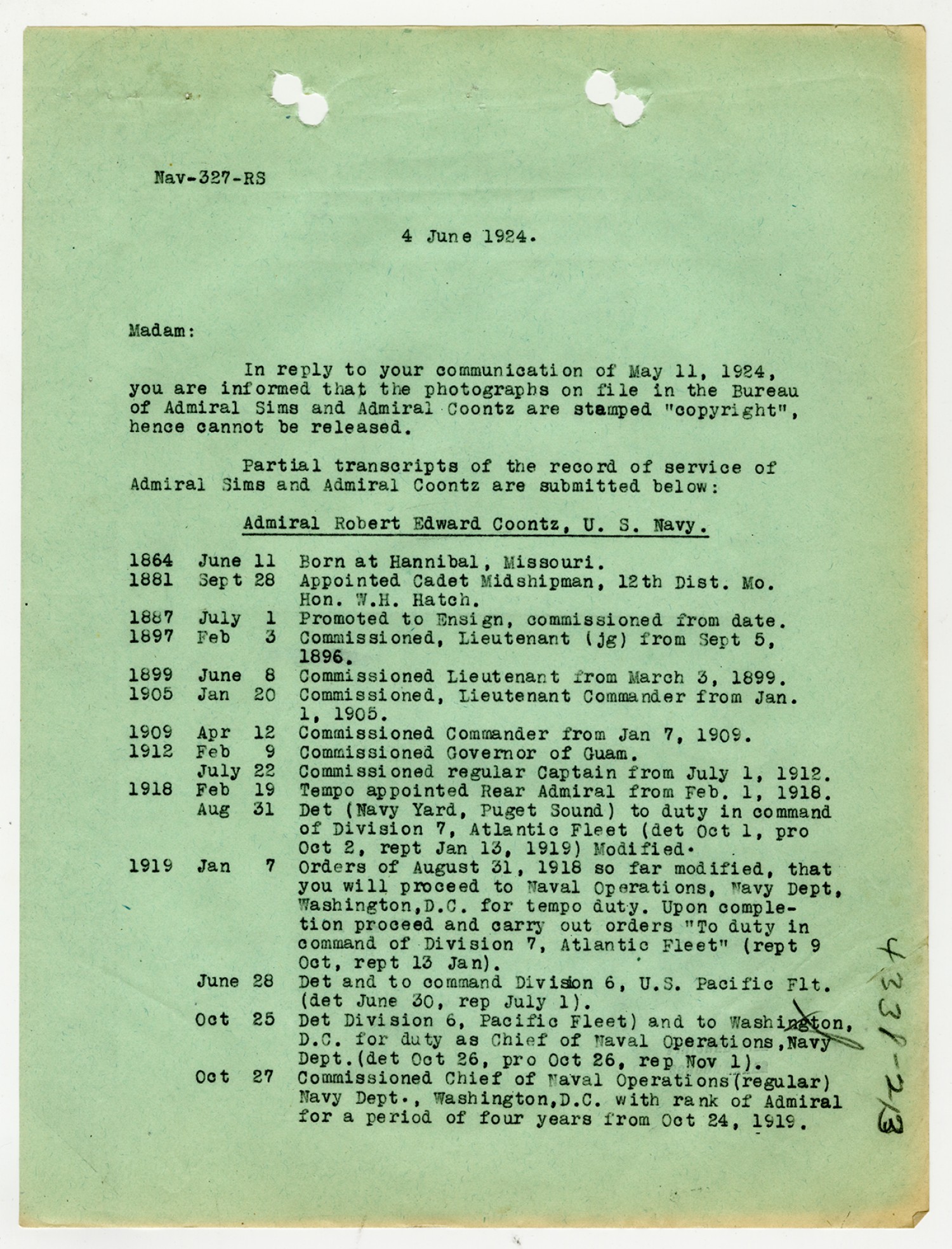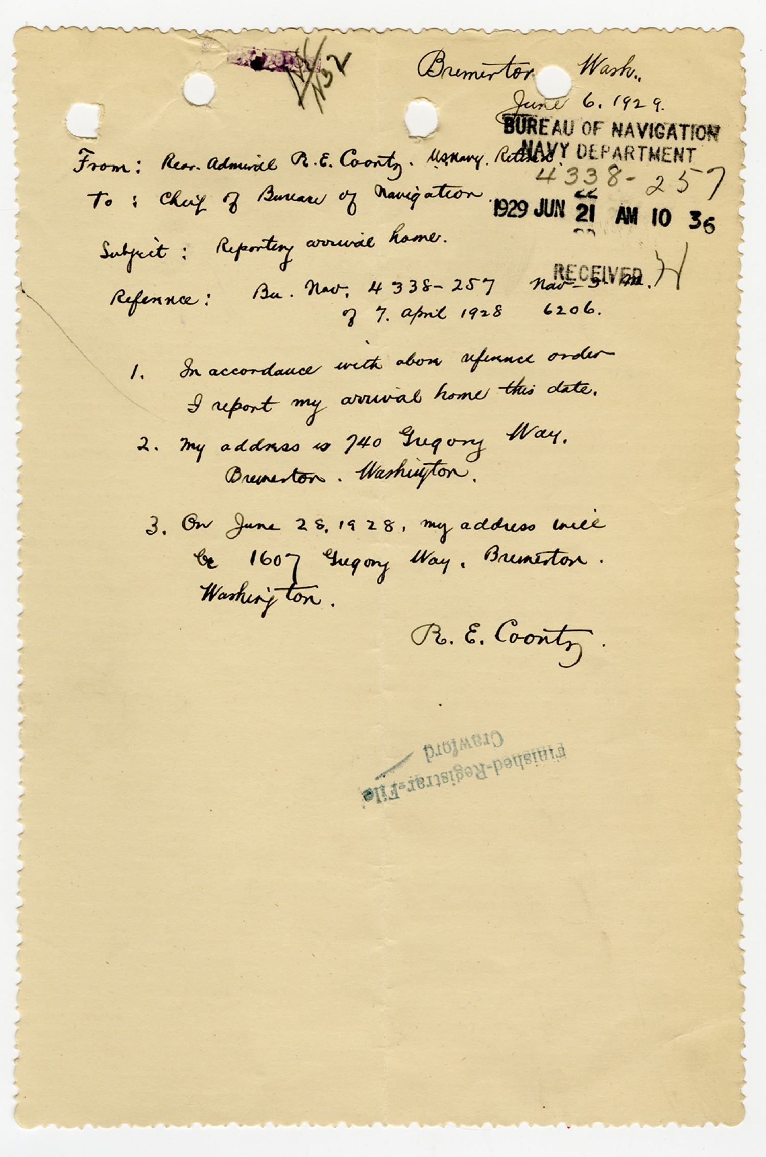 Robert E. Coontz letter to the Bureau of Navigation - June 24, 1929