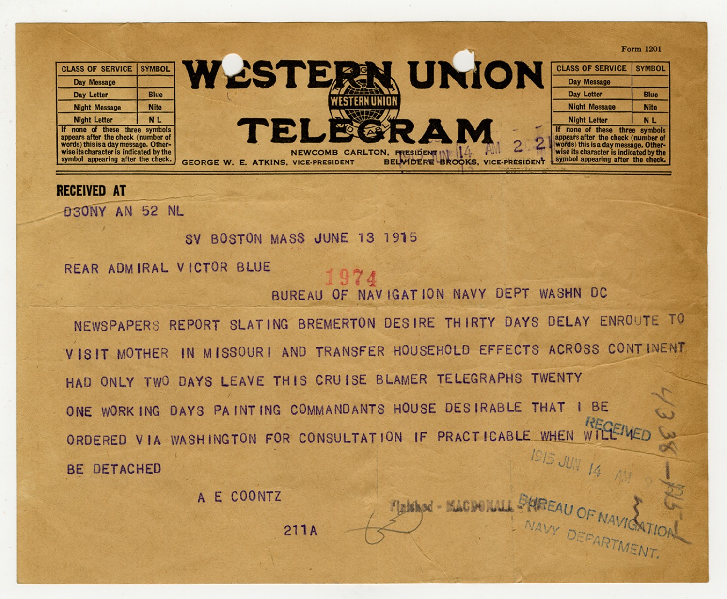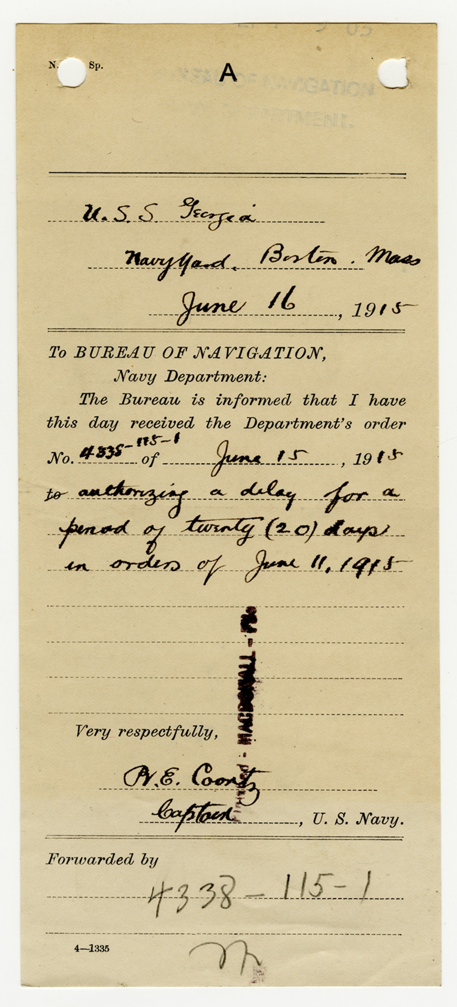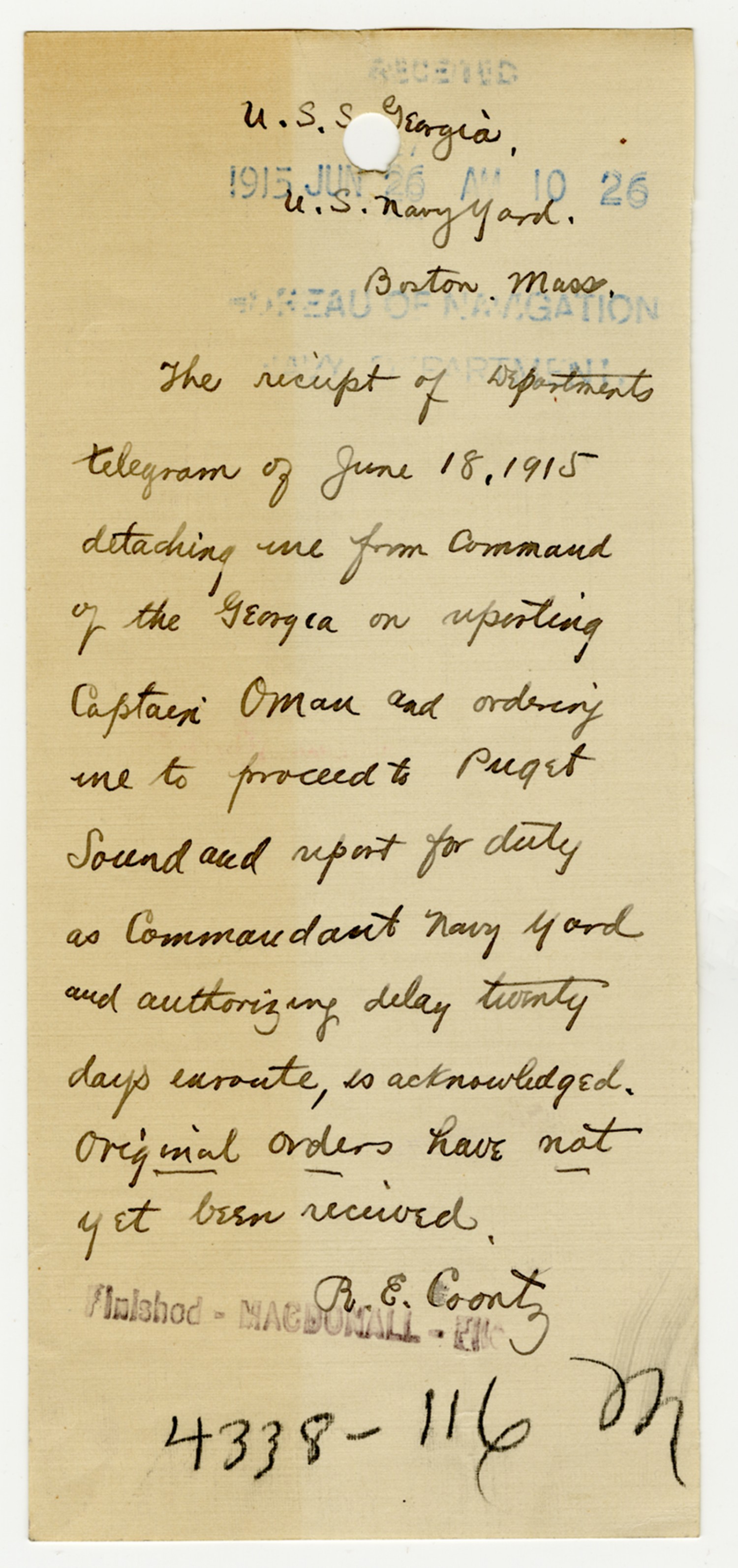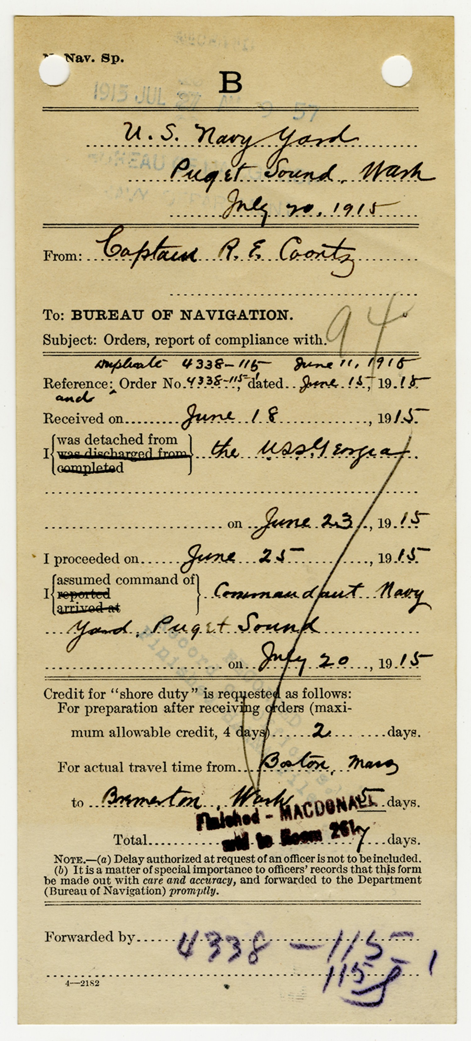Robert E. Coontz letter to the Bureau of Navigation - June 24, 1929