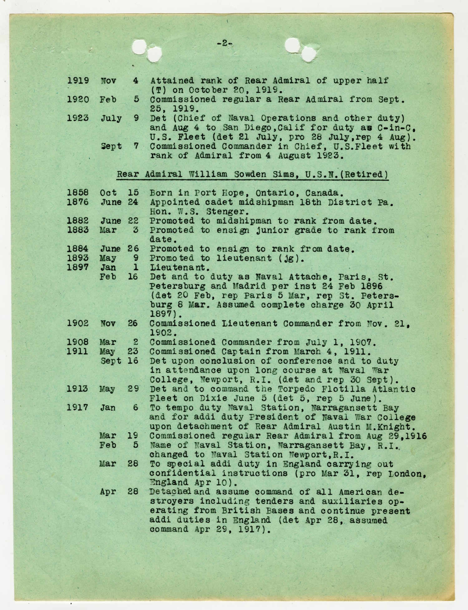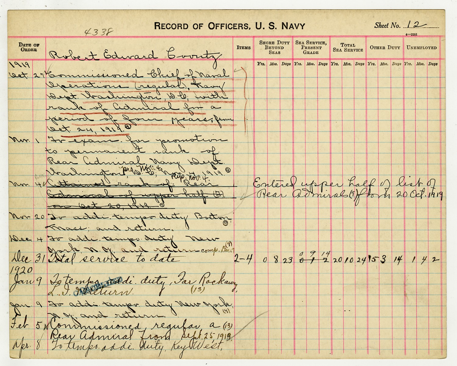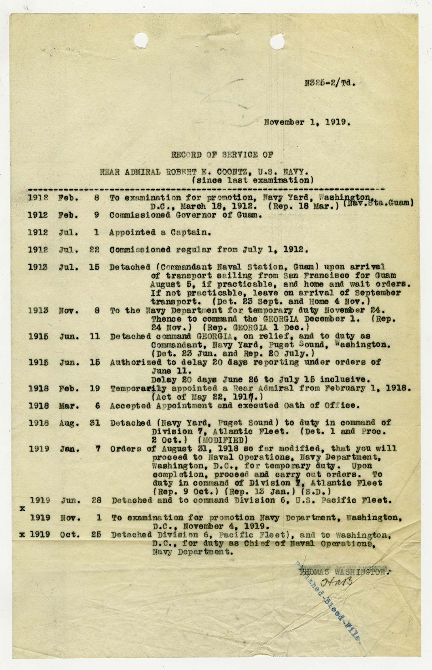 Record of Service of Robert E. Coontz - November 1, 1919