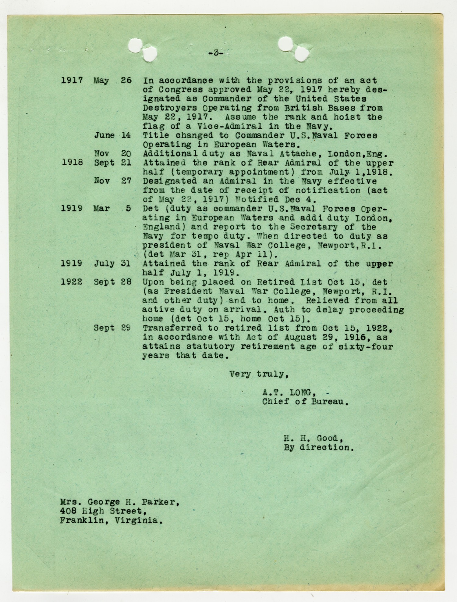 Memorandum for Chief of Bureau of Navigation - June 17, 1919