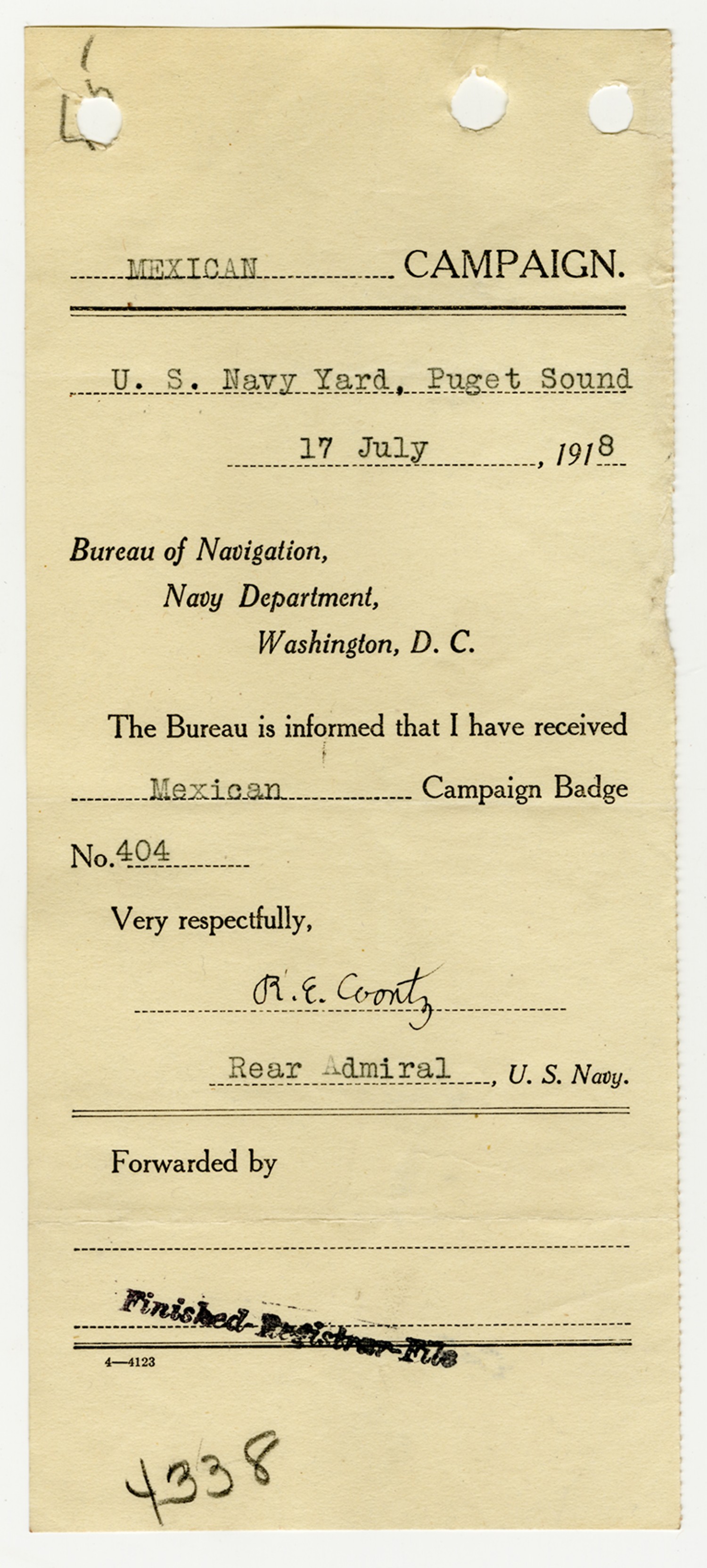 Robert E. Coontz Mexican Campaign Badge - July 17, 1918