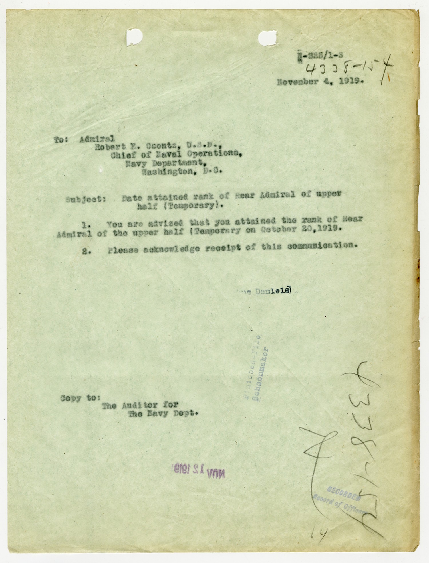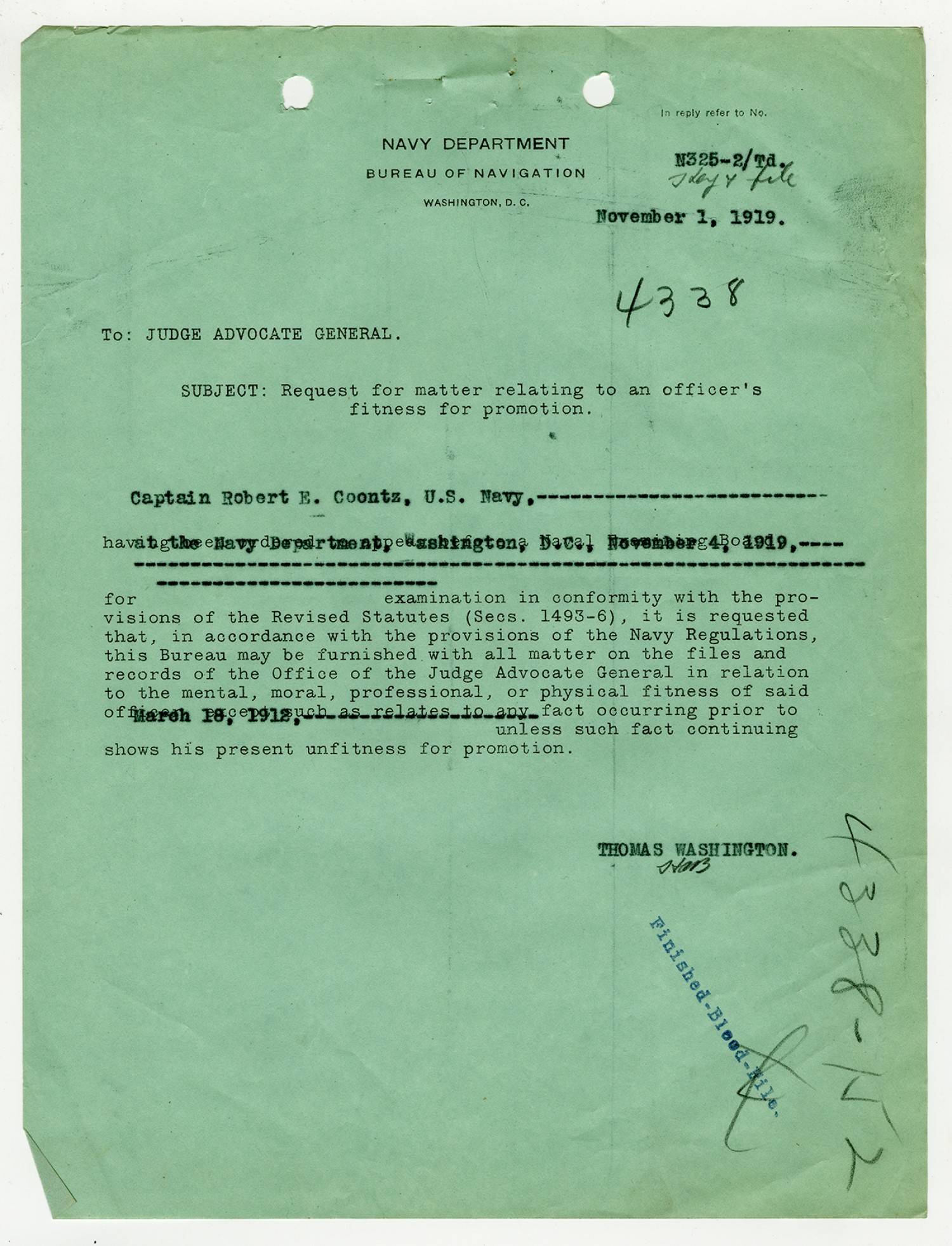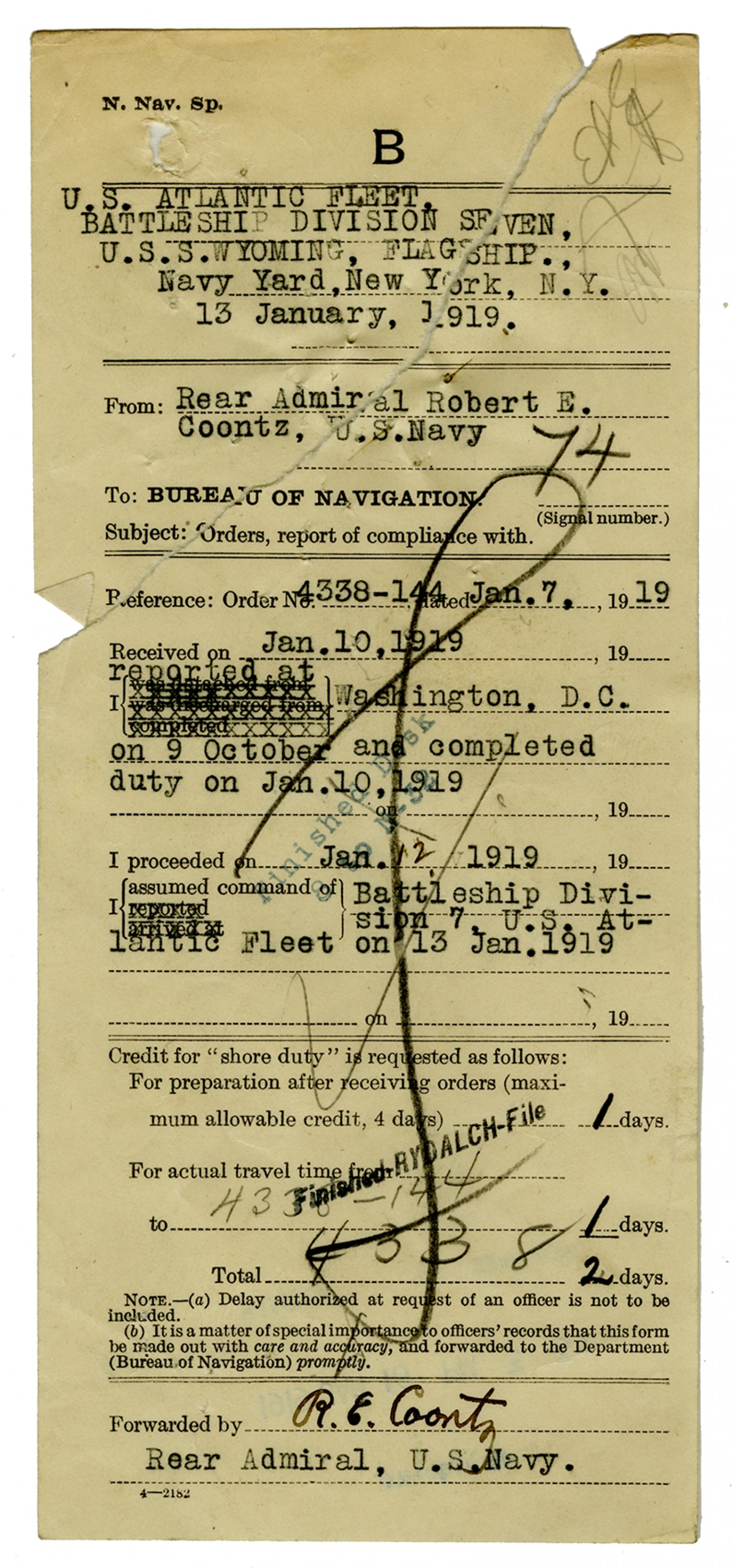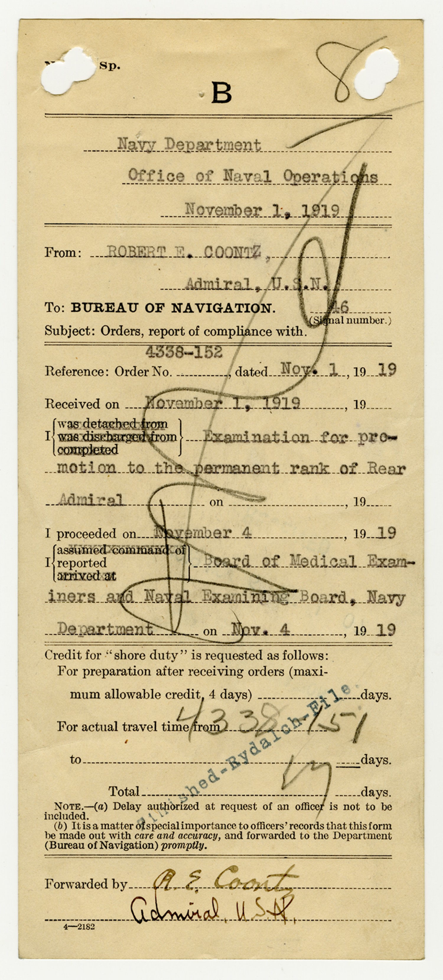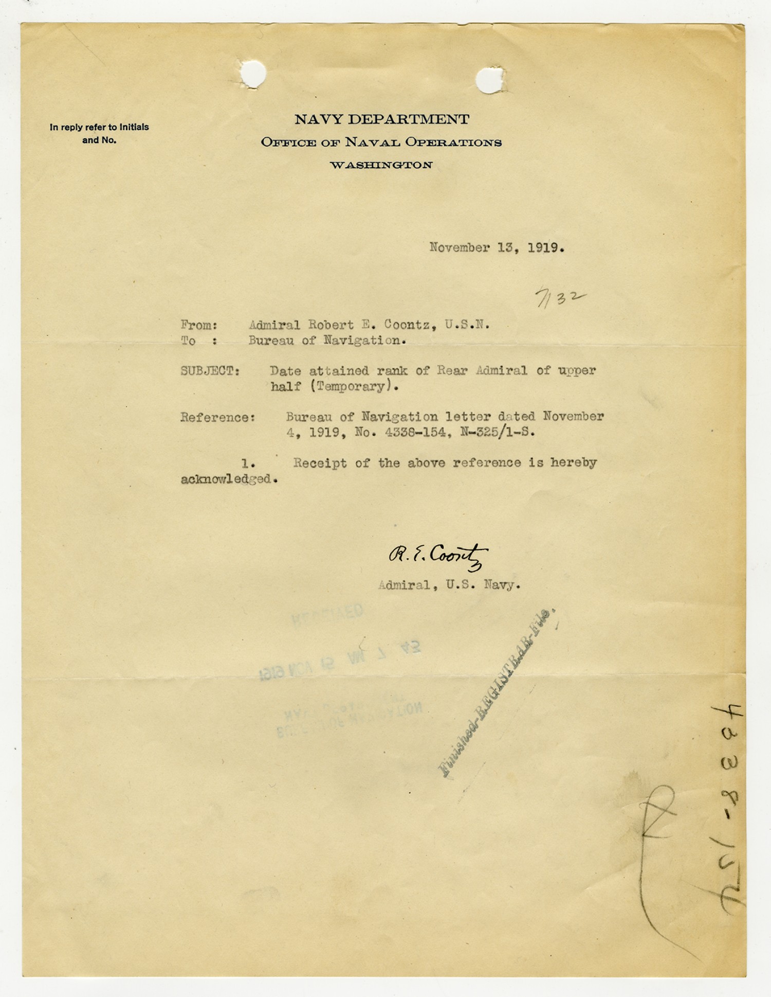 Robert E. Coontz letter to the Bureau of Navigation - November 13, 1919